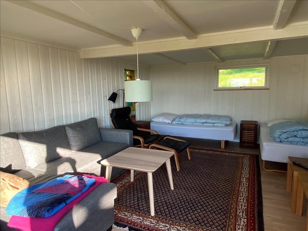 Åbent køkken med god spiseplads og adgang til en stor lys stue, med sovesofa, hvorfra du kan se havet og den smukke solnedgang. Der er 2 fine soveværelser med god skabsplads. Samt anneks med to sovepladser. Endvidere er der et dejligt badeværelse med brus. Ved den side af huset, der vender væk fra havet er der en stor skøn terrasse, hvorfra du kan nyde solen eller komme en friskfanget fisk på grillen, efter en skøn dag på stranden. Børnene vil elske en gåtur i det bakkede landskab.