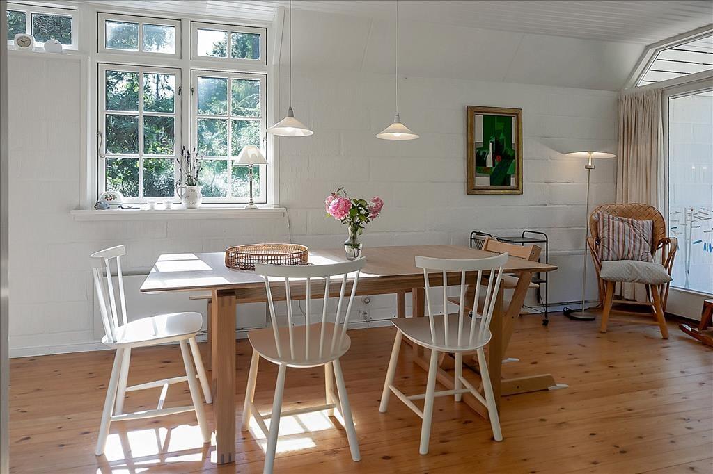 Skøn stue, med plads til både aktiviteter og hygge, her kan du slå dig ned med en god bog eller I kan spille et slag kort med børnene. Hyggeligt åbent køkken og dejligt badeværelse med brus og gulvvarme. Samt soveværelse med køjeseng. 1. sal: 2 dejlige soveværelser, det ene med enkeltsenge, det andet med dobbeltseng samt gæstetoilet. Husk også at benytte husets skønne terrasse, der er opdelt i flere afdelinger. Her er det oplagt at komme et par gode bøffer på grillen (husk at passe på stråtaget) eller bare nyde solen og udsigten til skoven.