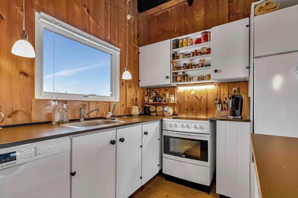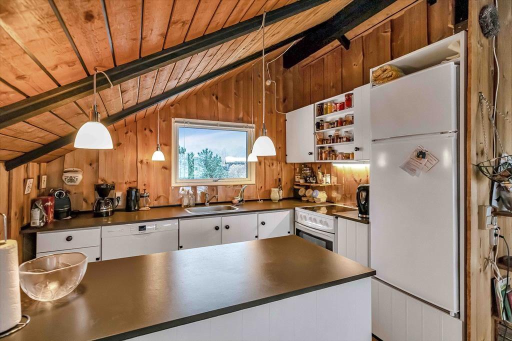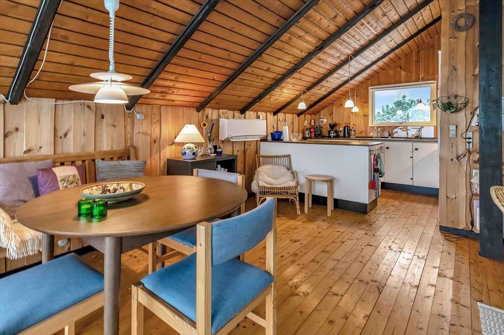 I sommerhuset, vil du med det samme få følelsen af at være velkommen. Du vil hurtigt få skuldrene ned og mærke, at det endelig er tid til ferie. I den skønne stue, der er placeret i forbindelse med det åbne køkken, kan I samles ved sofaarrangementet til et brætspil eller du kan fordybe dig i en spændende roman. Hvis du sørger for frokosten, kan du stadigvæk være med i samtalen over køkkenbordet.