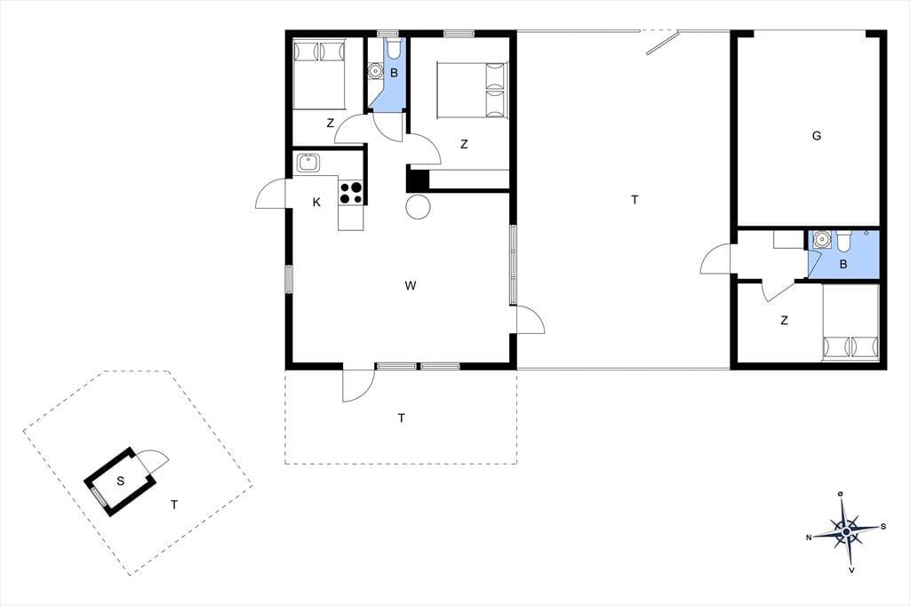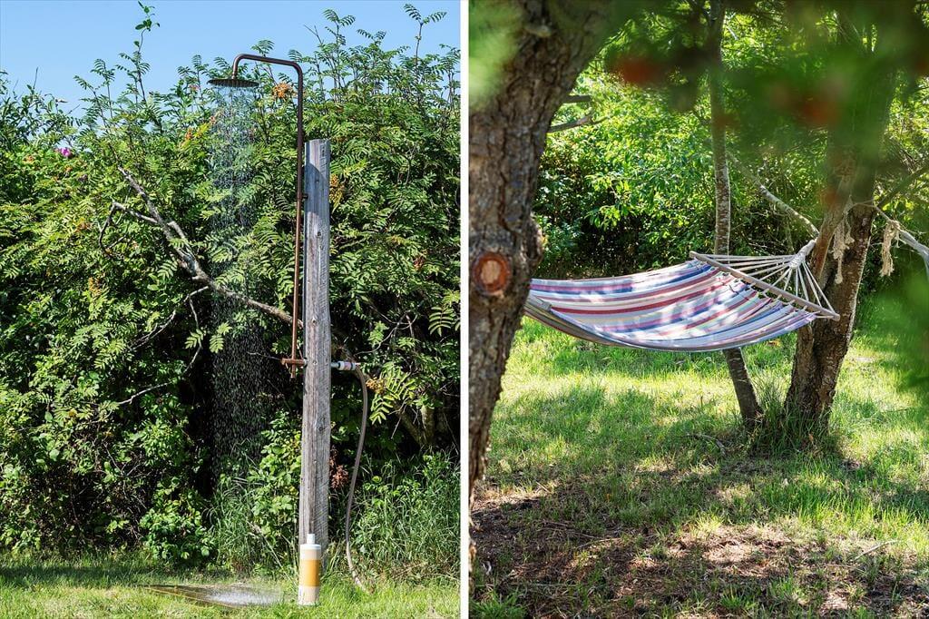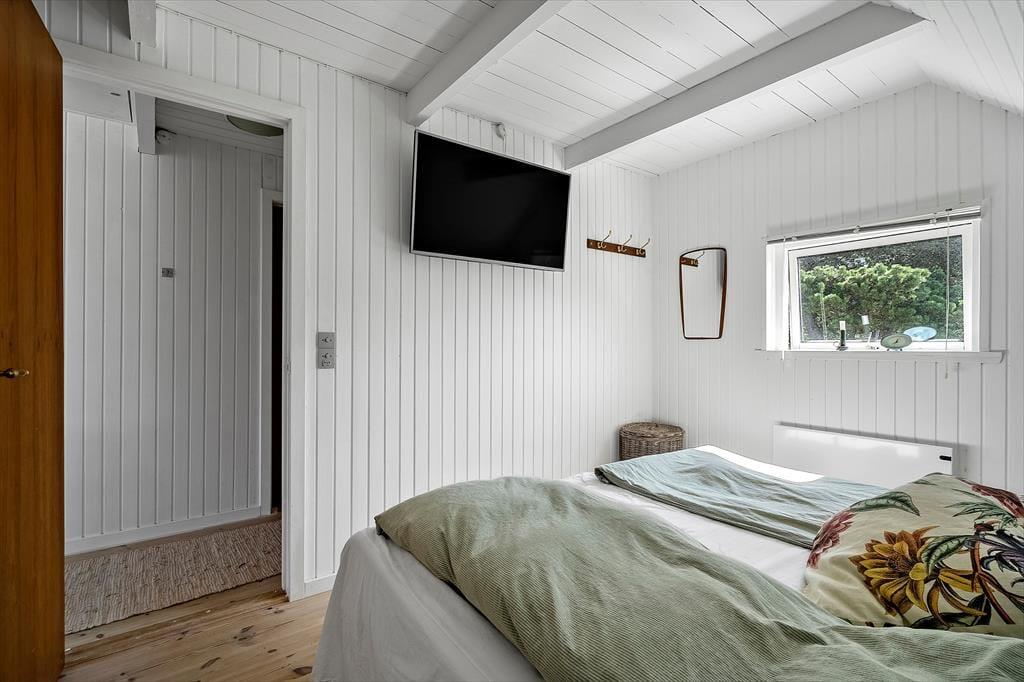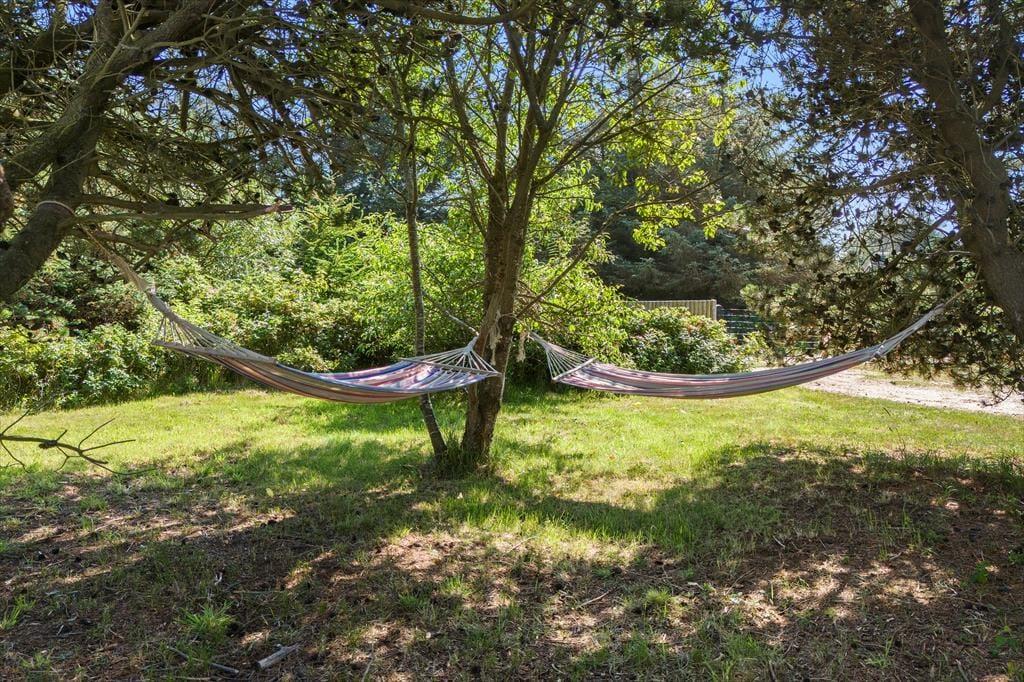 Feriehuset ligger på en skøn naturgrund på 2700 m² med gode lækroge, hvor man kan nyde solen uforstyrret. Her er både en dejlig vestvendt træterrasse og en lukket sydvendt terrasse med komfortable havemøbler — perfekt til afslapning fra morgen til aften. Som noget ekstra kan I glæde jer til den skønne udendørs sauna, der kan bruges året rundt. Der er parkering lige ved huset, og i garagen finder I forskellige udendørs spil, som hele familien kan hygge sig med.