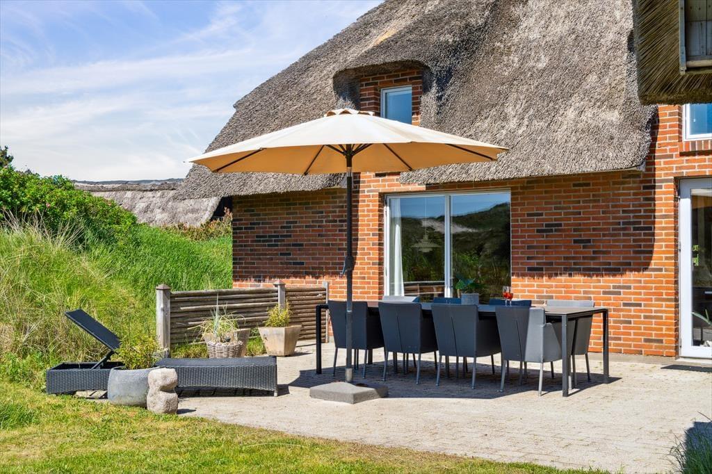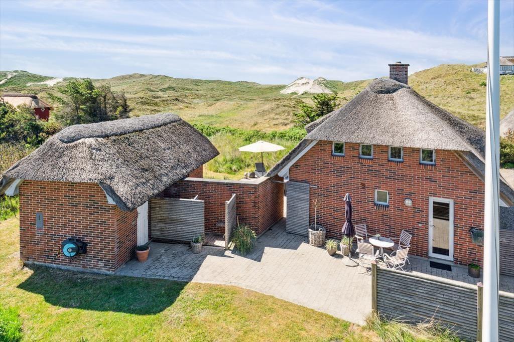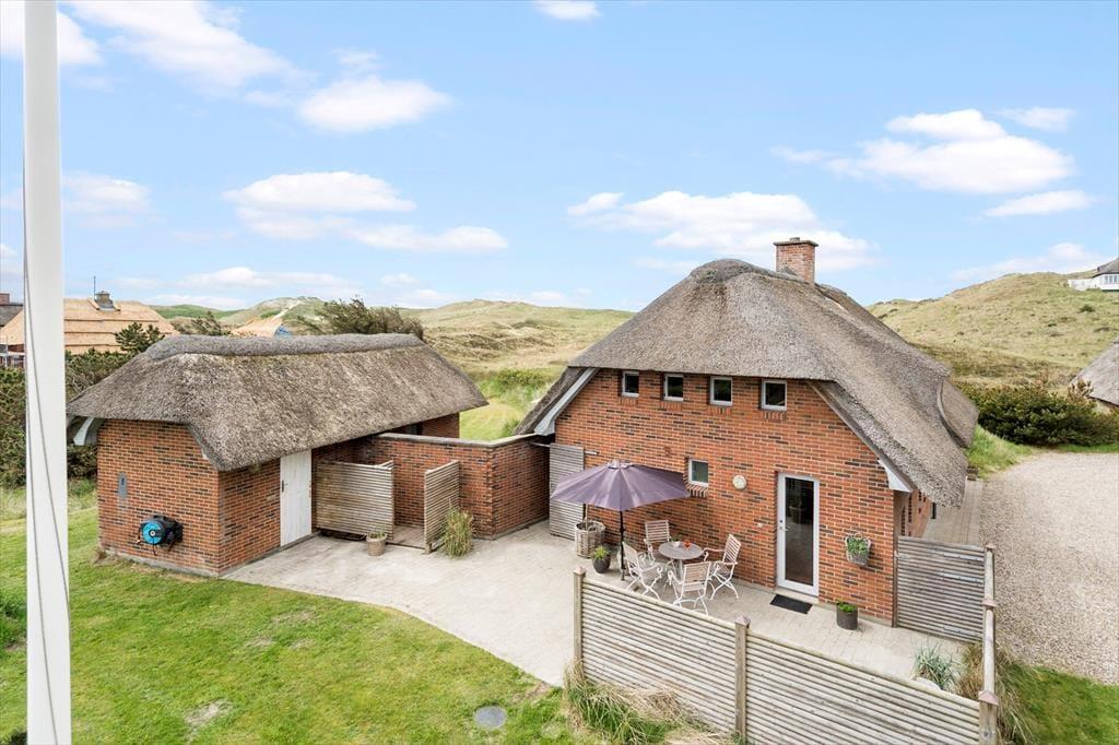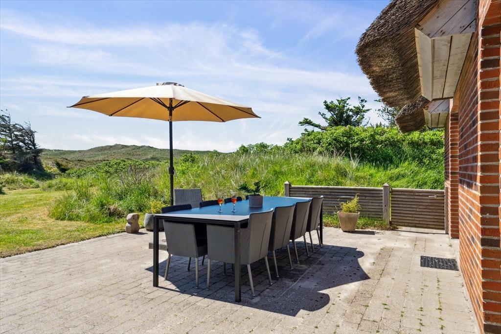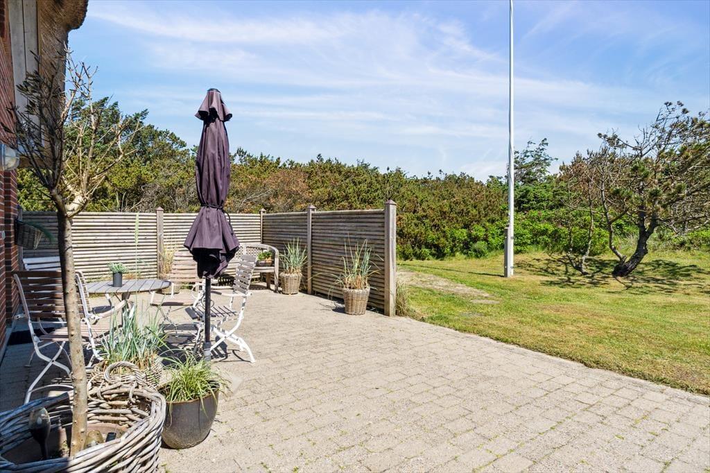 Tag dagens første kop kaffe med udenfor på den smukke østvendte terrasse, og lad hunden løbe frit på den store indhegnede grund, imens kan I nyde dagens første kop kaffe, den fantastiske udsigt over klitterne, den smukke solopgang, den skønne lyd af havets brusen, som næsten altid kan høres, og fuglene der lystigt synger dagen ind. På den østvendte terrasse kan I nyde den dejlige læ, da der er opsat læhegn som giver fantastisk læ. Den store ugenerede grund giver gode muligheder for at hunden kan løbe frit og ungerne kan lege løs.