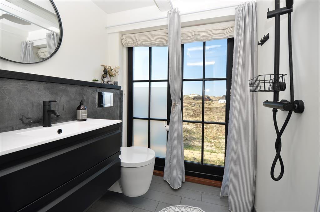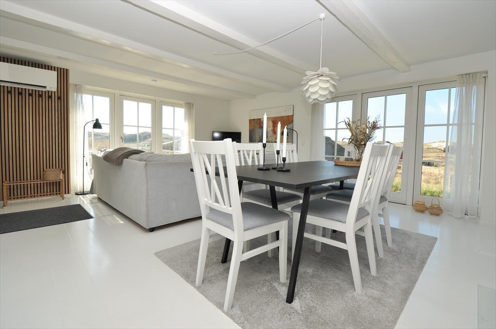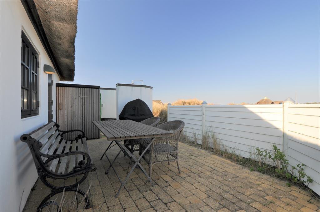 Huset ligger højt i det smukke landskab hvilket også giver jer den fantastiske udsigt udover klitlandskabet til alle sider. Sæt jer ud på en af de skønne terrasser der er flere stedet rundt om huset, på den måde kan I nyde solen hele dagen. Med udgang fra køkkenet er der terrasse med morgensol, så tag en varm kop kaffe med og nyd den sammen med fuglens sang der spreder sig i luften. Til aften kan I sætte jer om på den vestvendte terrasse, hvorfra der er udsigt til sømærket, her kan I nyde aftensolen til lyden af Vesterhavets skønne brusende lyd. Blæser det en smule en dag så sæt jer på den østvendte terrasse der ligger i en ”gryde” foran annekset.