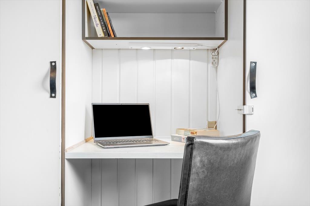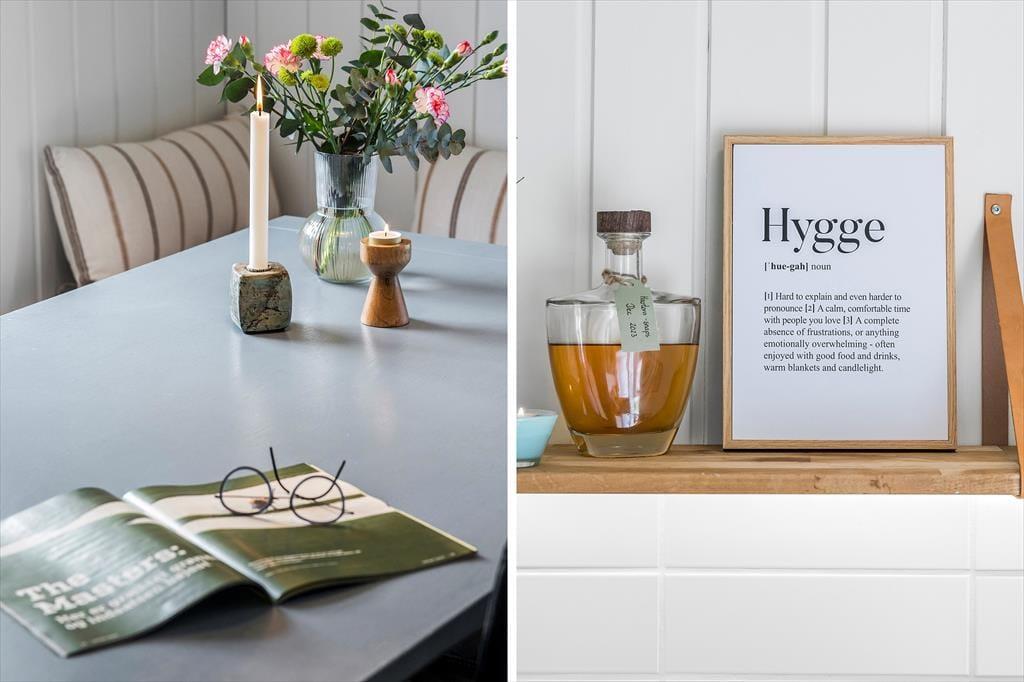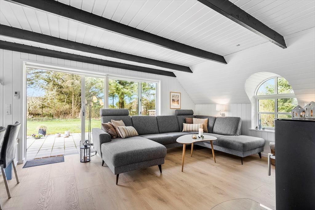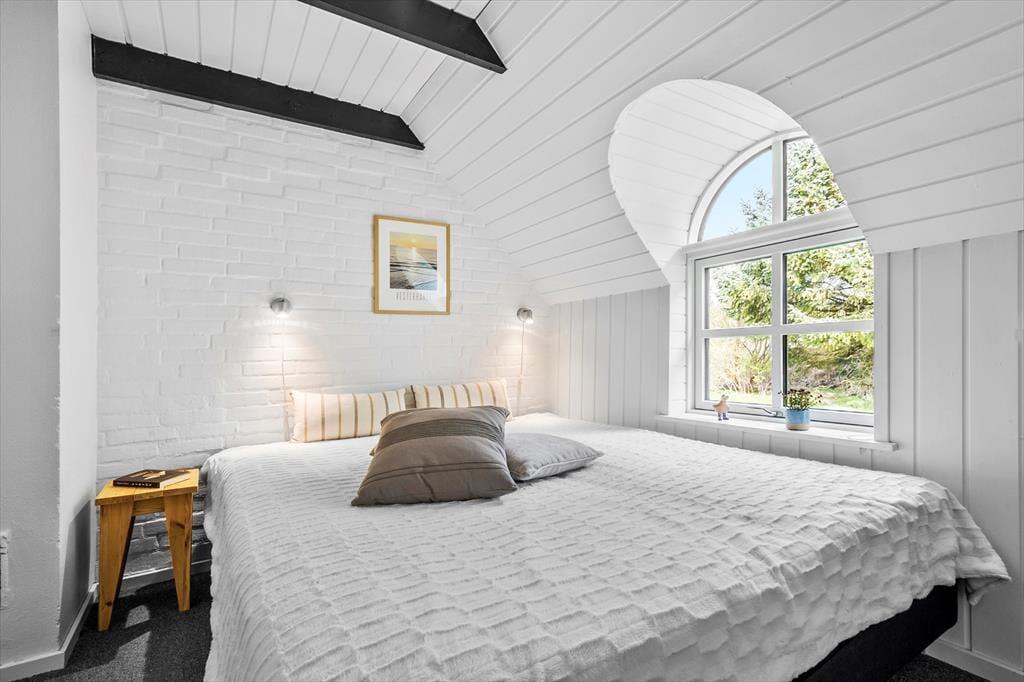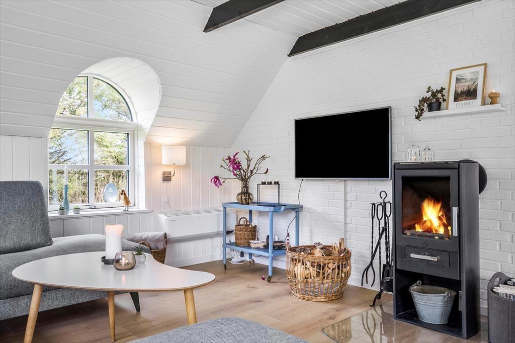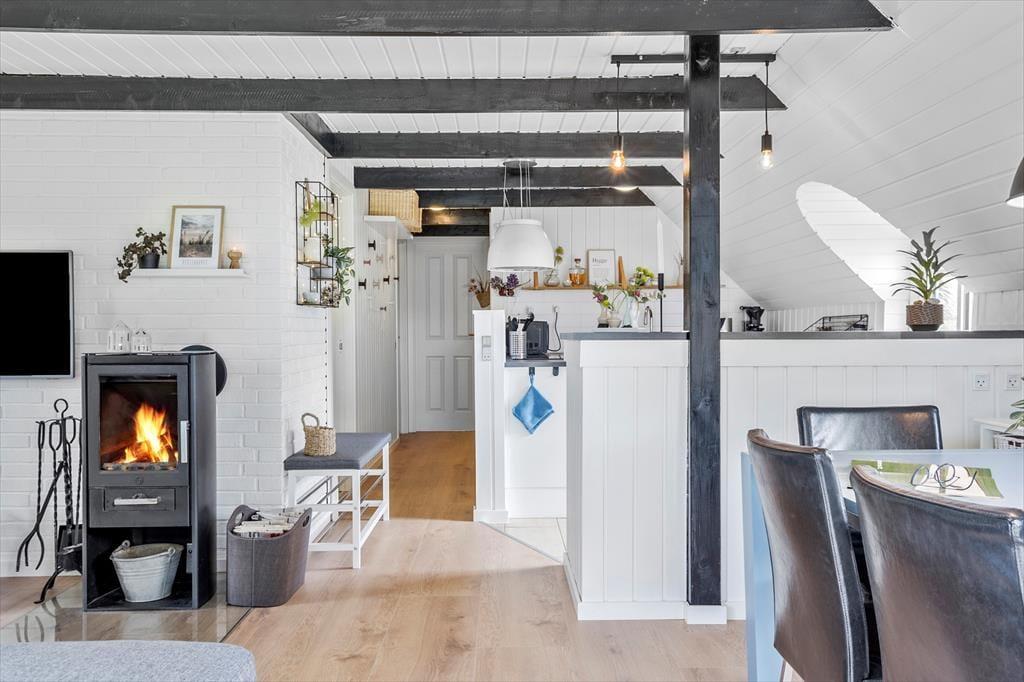 Huset byder på en skøn rummelighed med et stort og indbydende køkken-alrum, hvor hele familien kan samles. De store vinduer lader lyset strømme ind og skaber en behagelig og lys atmosfære. Sæt jer omkring spisebordet, nyd solens stråler gennem vinduet og tag et spil kort – måske finder I ud af, hvem der er familiens kortmester. Når sommeraftenerne bliver kølige, kan I tænde op i brændeovnen og nyde den varme glød og den hyggelige knitren, der spreder sig i hele rummet.