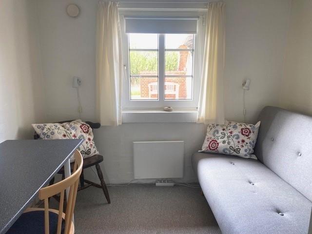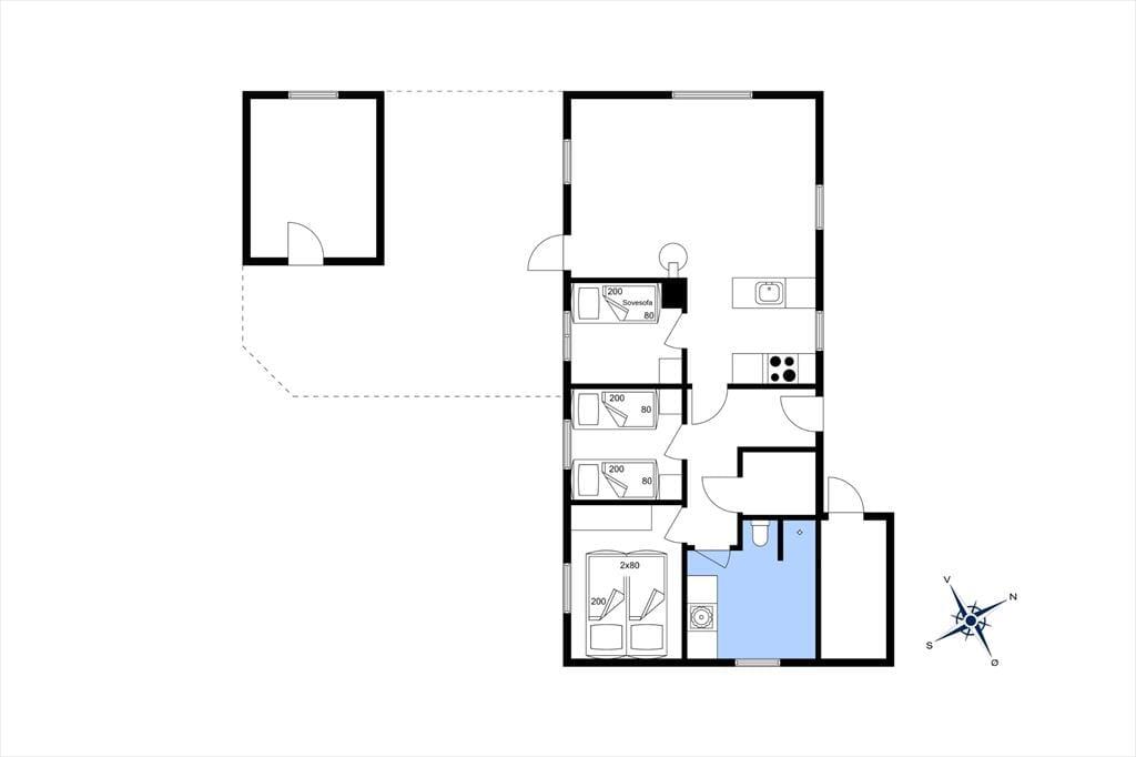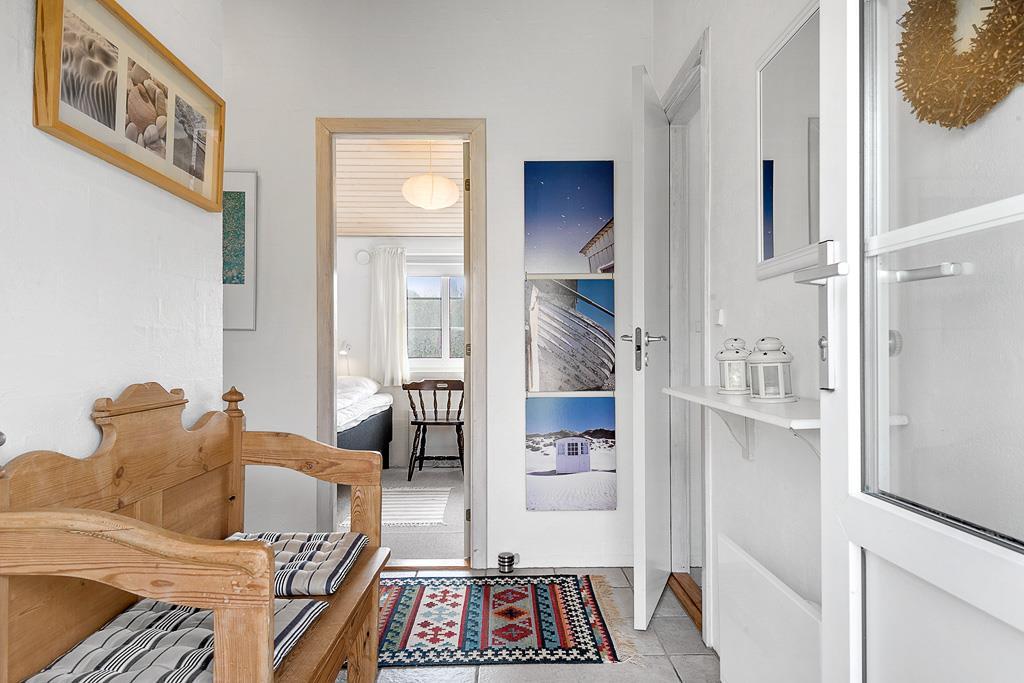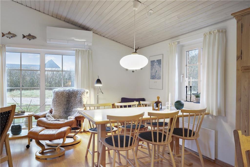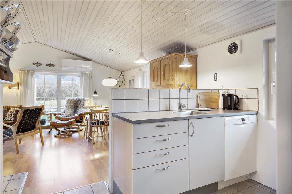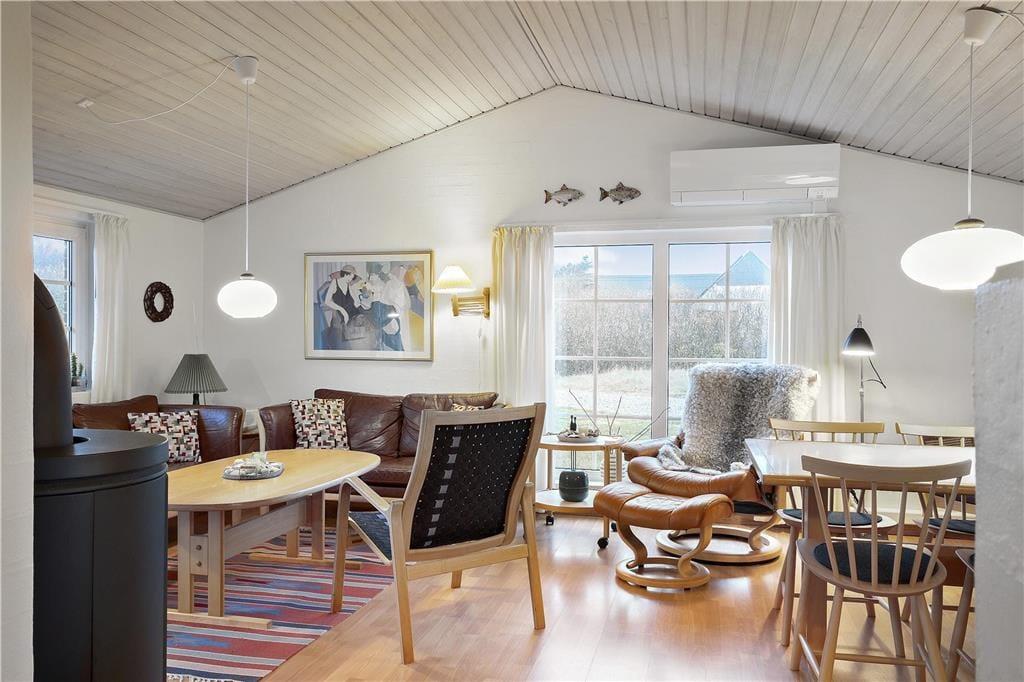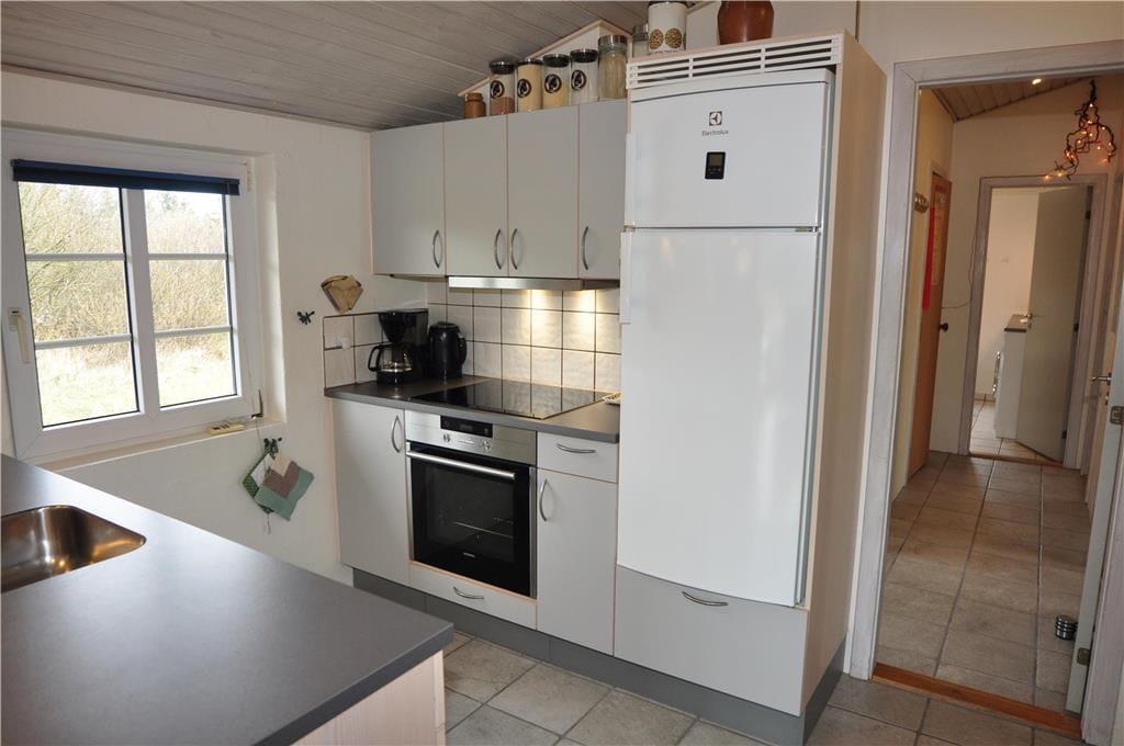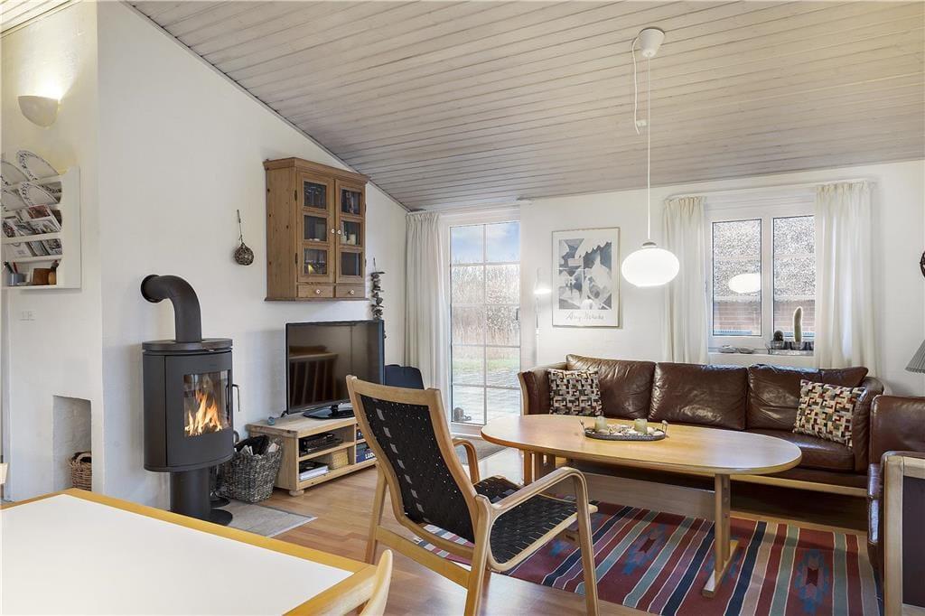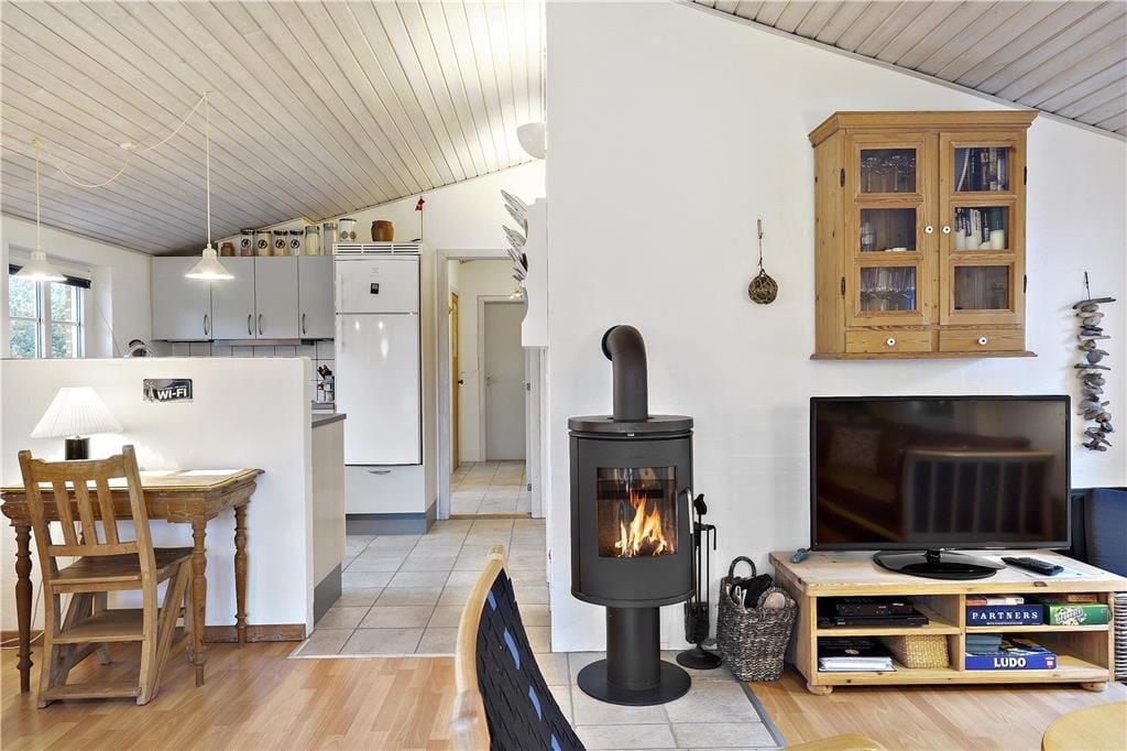 Tag den lille familie med på ferie hvor der er tid til total afslapning, men også til naturoplevelser og andet godt. Det mindre, men dejlige køkken, giver jer god mulighed for at lave mad sammen, og skulle det ske nogle ikke har lyst til at deltage i madlavningen kan de hygge sig i den dejlige stue, og da køkkenet ligger i åben forbindelse med spiseafdeling og opholdsstue har I rig mulighed for at være med i samtalen der foregår i køkkenet på trods af at I lavet noget andet. Det lille skrivebord i stuen giver jer også god mulighed for at fordybe jer i computeren eller med blyanten i hånden. Når dagen bliver lang og fødderne er ømme så sæt jer i sofaen og nyd den dejlige varme brændeovn.