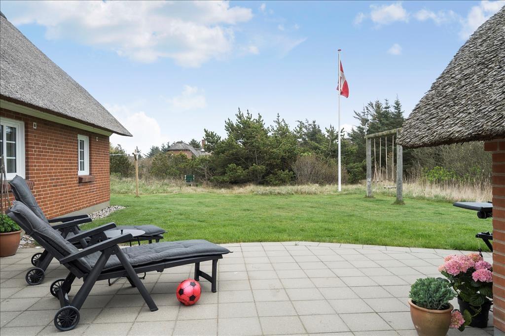 Huset er omkranset af en stor grund som er perfekt til både boldspil og leg, og til familiens yngste er der opsat gynger som de kan hygge sig med. Den store sydvendte terrasse er afskåret fra omverdenen og er oplagt til solbadning da I får en dejlig masse privatliv. Smid bøfferne på grillen og hør dem stege imens fuglene synger og den lækre duft af mad spreder sig i luften.
