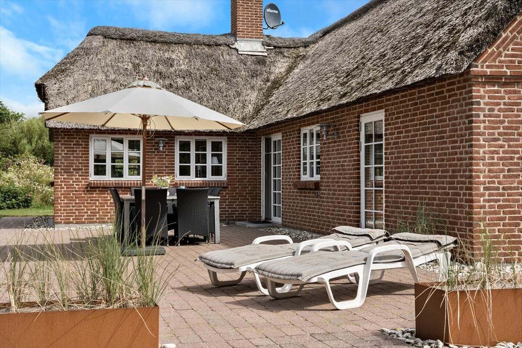 På de store solrige, flisebelagte og møblerede terrasser mod vest og syd, har I de perfekte rammer til at nyde en lækker forfriskning eller hygge om grillen med enten skumfiduser eller et lækkert aftensmåltid. Terrasserne er meget ugenerede og I har derfor en masse dejligt privatliv til for eksempel at solbade og nyde solens stråler. Den fantastiske stilhed blandet med havets brusen i baggrunden sætter stemningen og skaber en helt fantastisk feriestemning. Nyd morgenkaffen på den lille terrasse mod øst og se solen gå op og fuglene begynder deres sang. Den store grund er omkranset af skærmende randbeplantning og I har masser af plads til diverse udendørs aktiviteter.