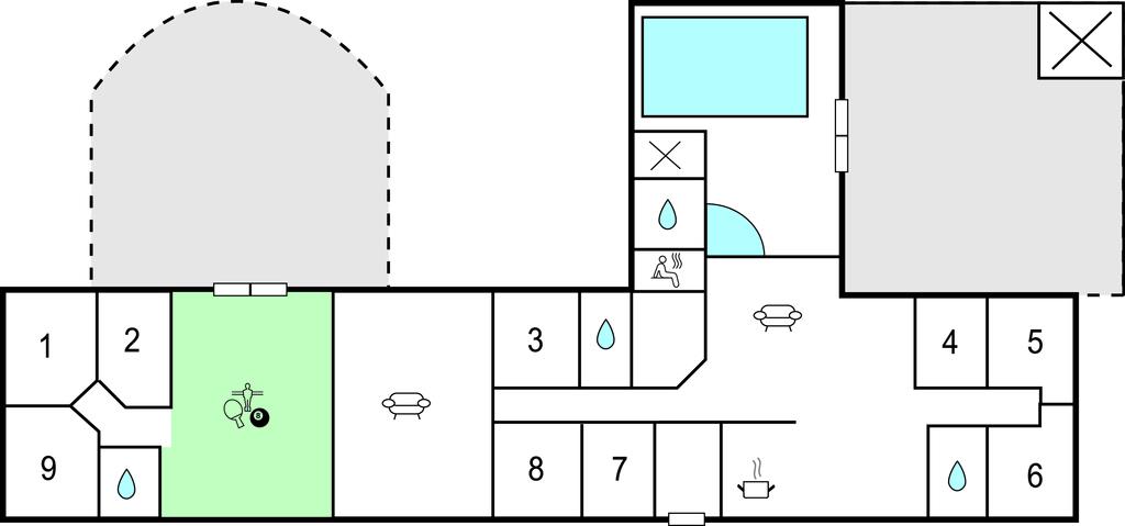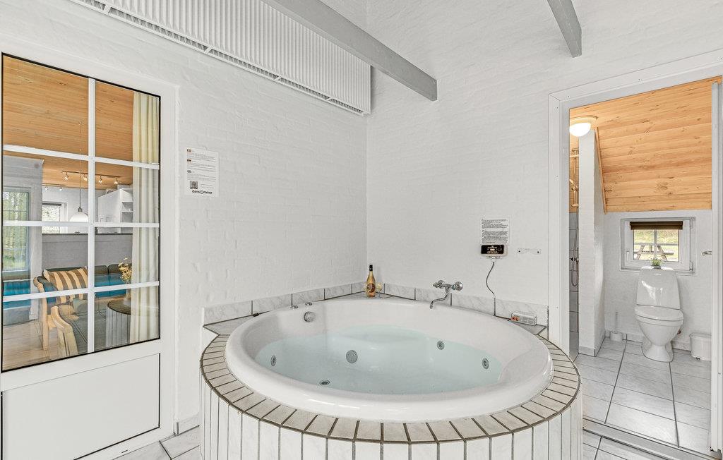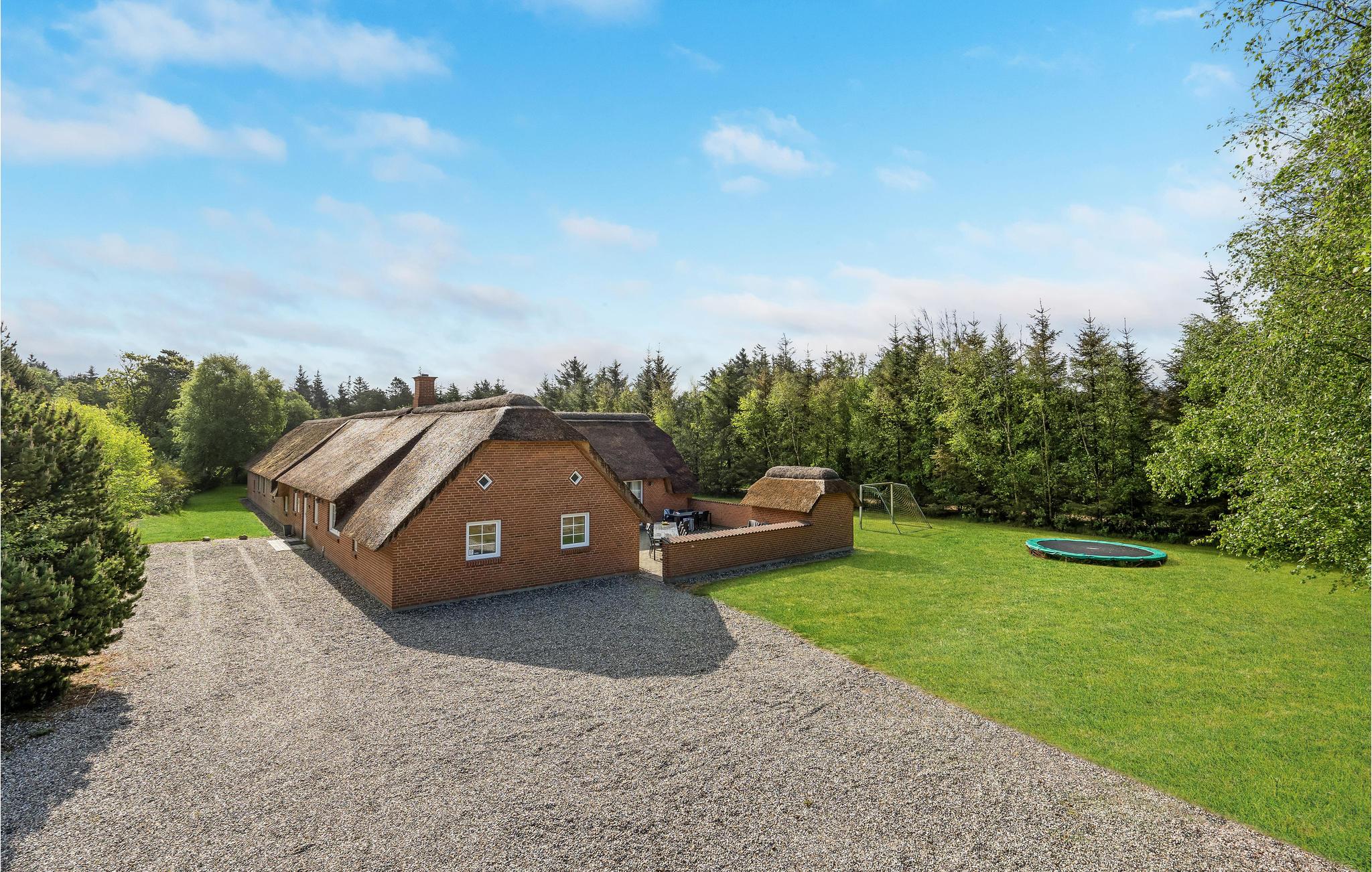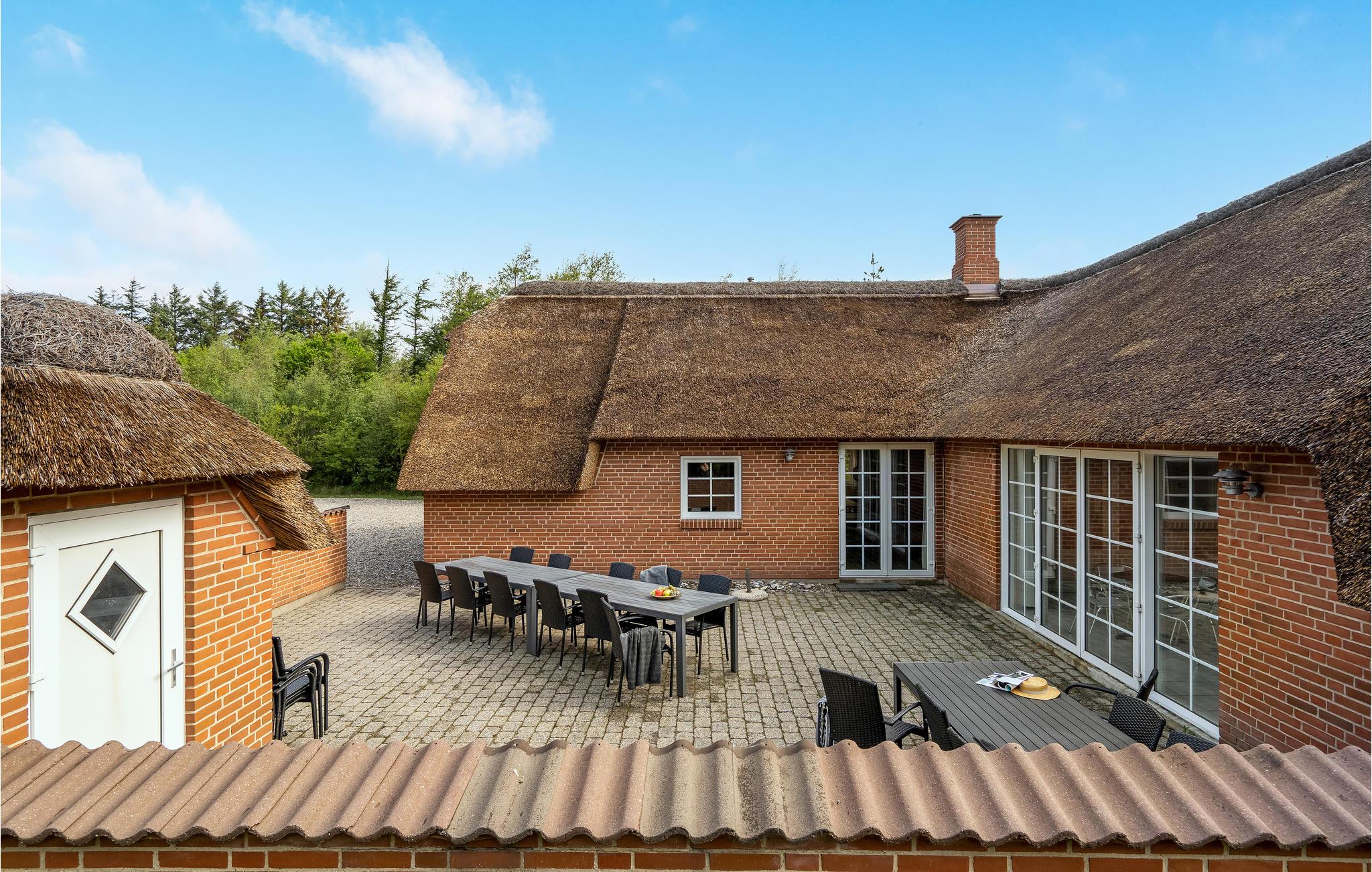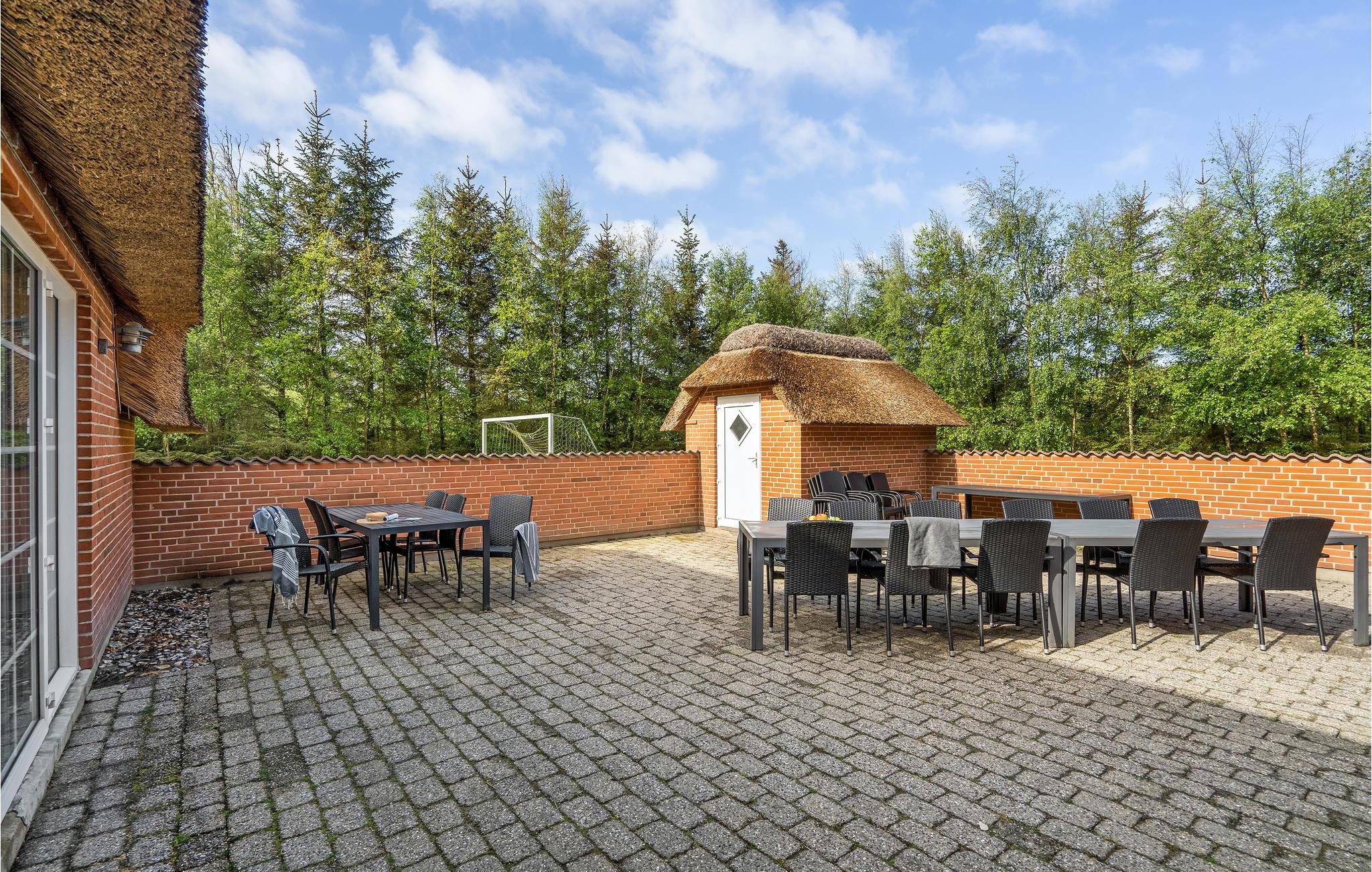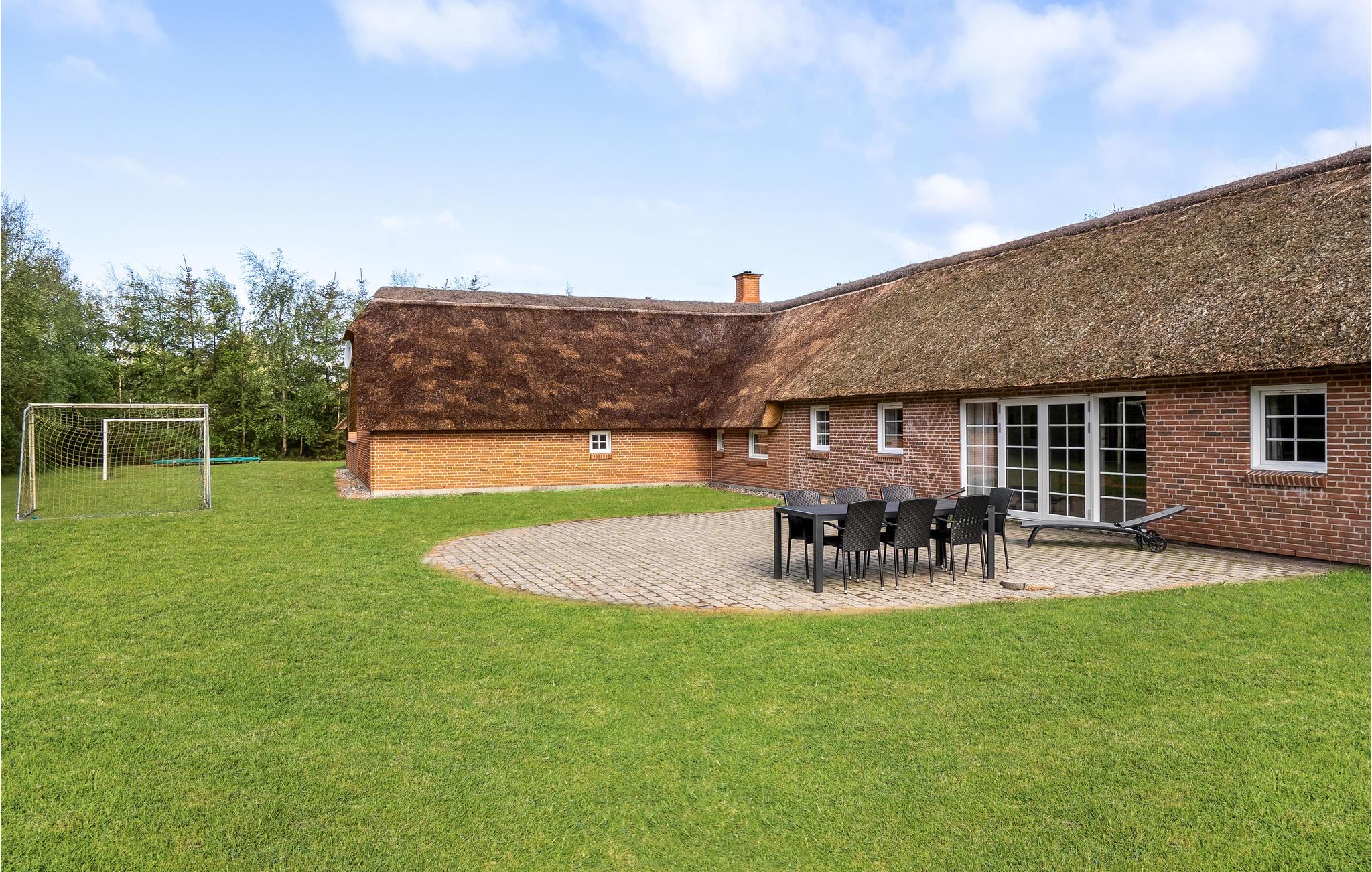 Kort fra den danske Vestkyst og de brede klitrækker ligger dette fantastiske stråtækte luksusferiehus. Vester Husby ligger lige op til Husby Klitplantage. Her kan I vente en speciel naturoplevelse ved bl.a. at følge de afmærkede ruter. I området findes utallige indkøbsmuligheder, cykeludlejning, restauranter, gallerier og brugskunst. Derudover er der kun kort til gode fiskemuligheder i å, hav og fjord. Denne perle af et velindrettet og indbydende feriehus med stråtag, rummer ganske enkelt alt hvad hjertet kan begære af aktivitets- og udfoldelsesmuligheder, her er mere end en enkelt ferie rækker til. På rundtur i huset bemærkes den flotte poolafdeling med swimmingpool med modstrømsanlæg, vandrutschebane, separat børnepool, dejlig stor indbygget spabad samt sauna. På den anden side af det centralt placerede spise/opholdsrum, kommer I ind i det store herreværelse udstyret med et 37' fladskærms-TV og hvor I kan mikse jer en drink ved den indbyggede bar, med eget køleskab, tage et spil dart eller pool ved det flotte poolbord. Det komfortable sofahjørne med chesterfield sofaer inviterer til en hyggestund. Går I videre til aktivitetsrummet, er her ingen undskyldning for ikke at få rørt alle muskler, når vinderen skal findes ved bordtennisbordet, i airhockey og fodboldspillet. Er I til de mere individuelle sportsaktiviteter kan I forbedre formen i husets motionsredskaber. Skal lattermusklerne røres kan I få en hyggesnak i café-hjørnet. Gratis internetadgang og Playstation2 er en selvfølge i huset. Huset er yderst veldimensioneret og rummeligt til 22 personer, med hele 3 soveafdelinger med 3 soveværelser og 1 badeværelse i hver afdeling. Desuden er der på den store hems god plads til endnu 4 overnattende gæster. På den 5200 m2 store grund, der omkranser huset er der tænkt på de mindste gæster med gynger og sandkasse, samt boldbane, volleyballnet og badminton for både store og små, hvis I da ikke ønsker at henslænge jer på en af husets 2 terrasser.