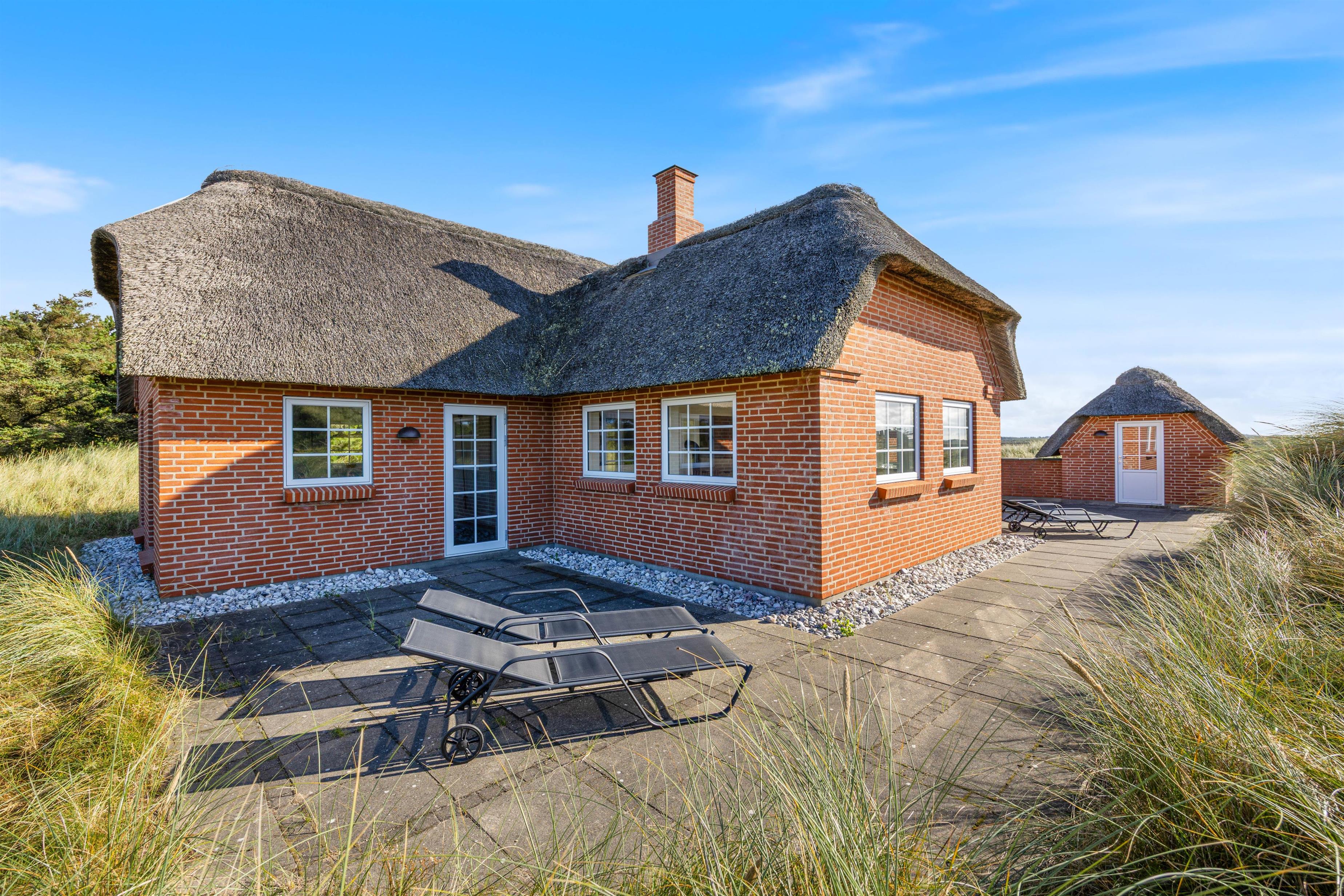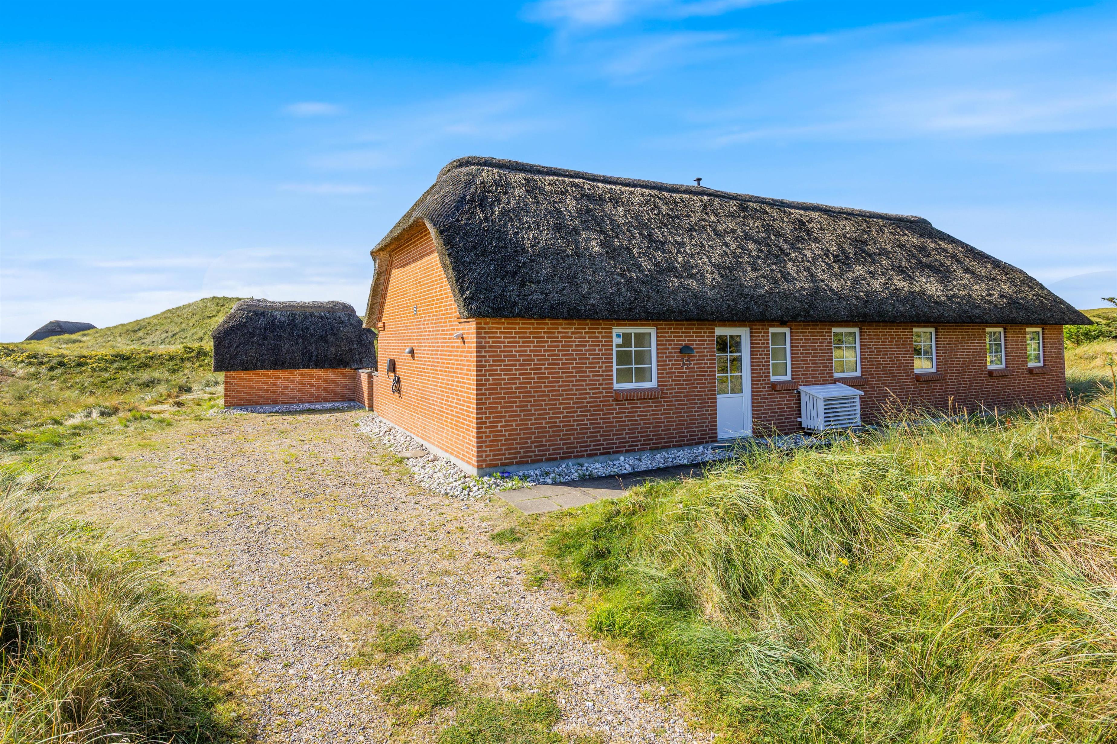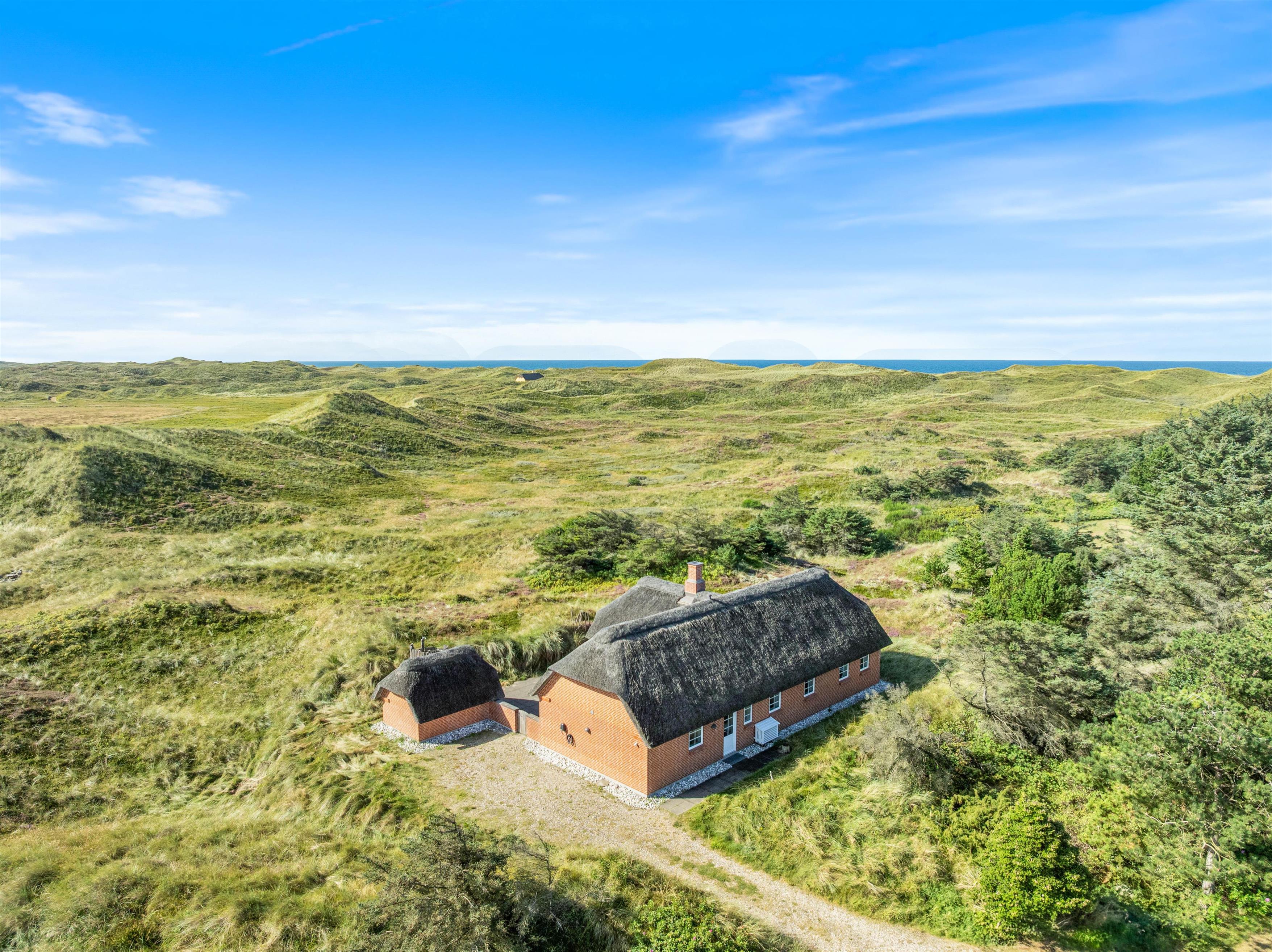 I Vester Husbys smukke klitlandskab tæt på Vesterhavet ligger dette hyggelige stråtækte feriehus fra 2016 og venter på at forkæle din familie med naturoplevelser, aktivitetsrum og wellness. Der er plads til 6 personer og 3 hunde på den 4.665 m2 store klitgrund og husets velfordelte 130 m2.