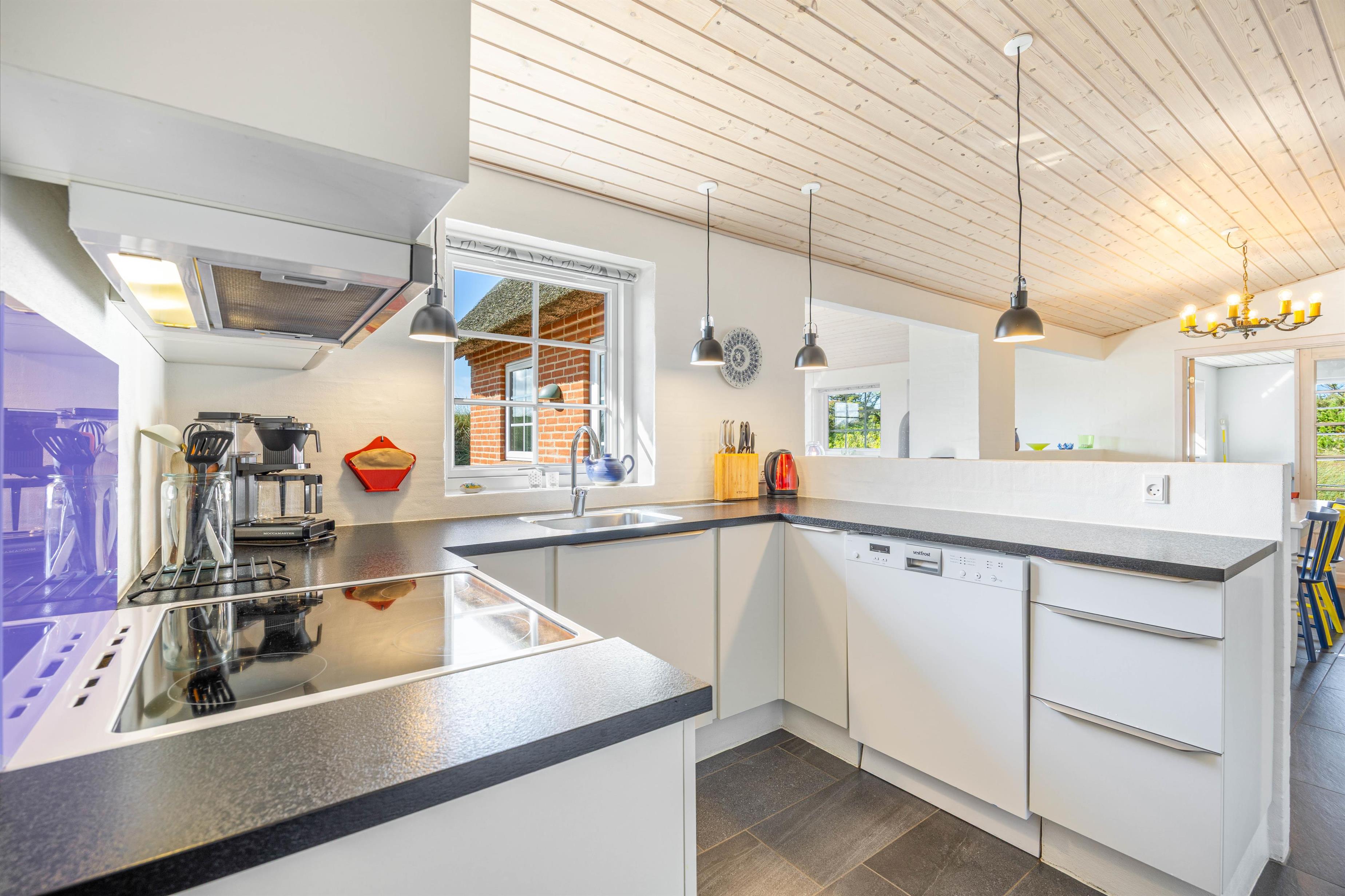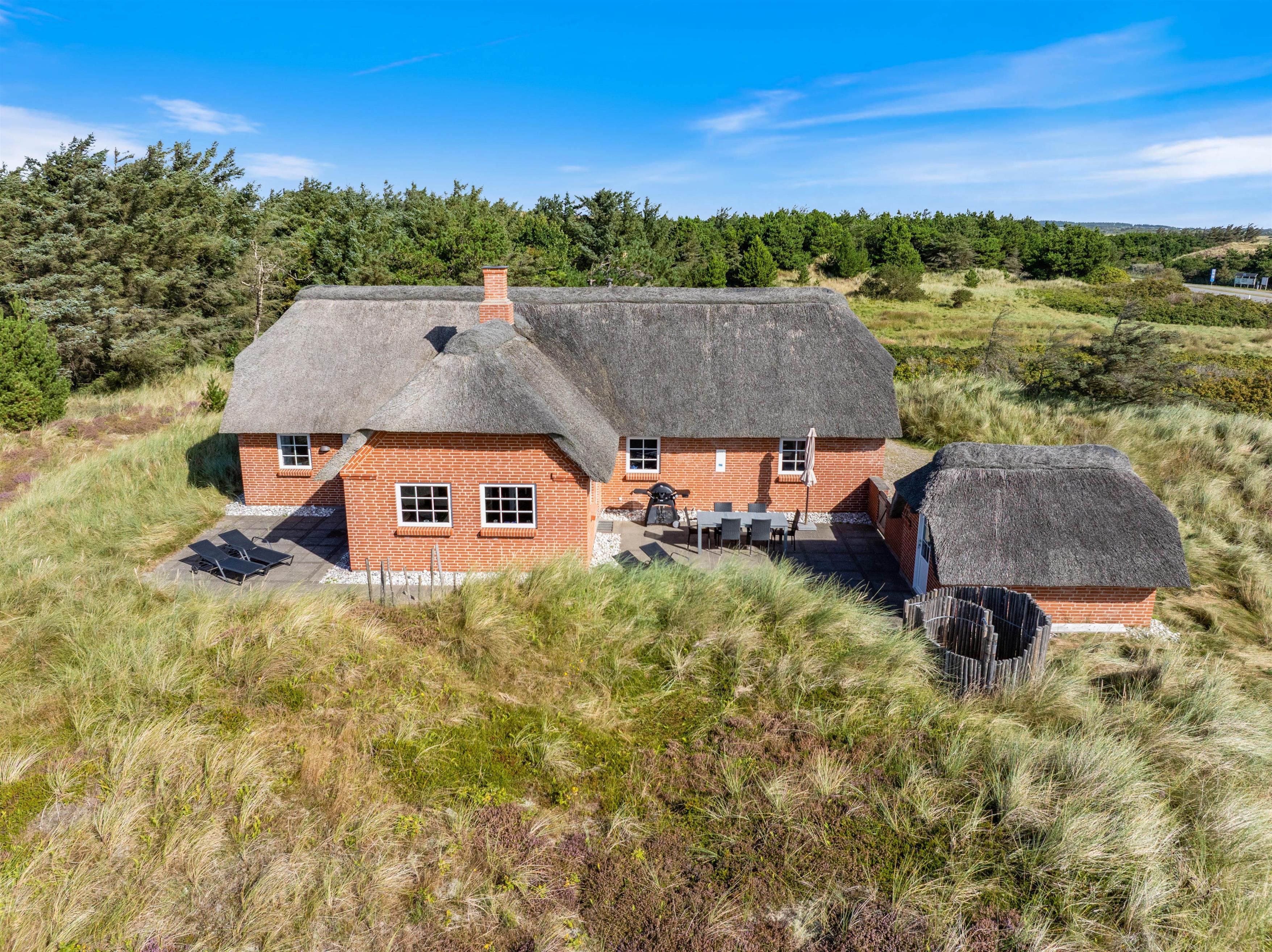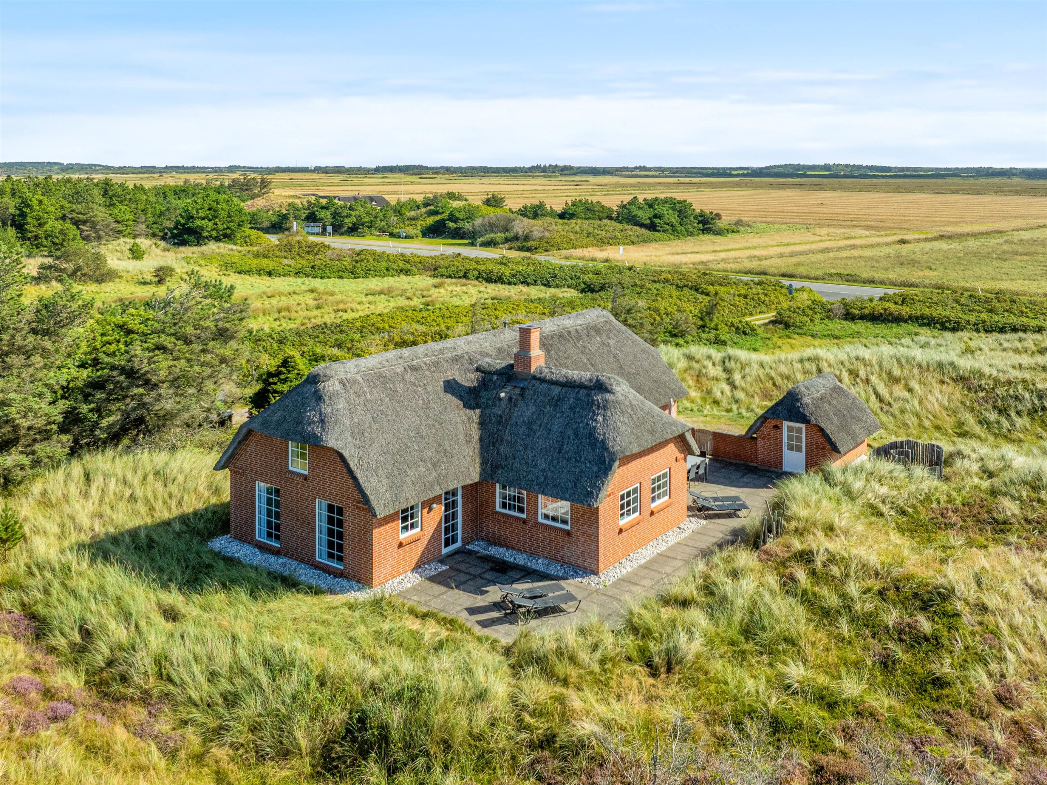 I Vester Husbys smukke klitlandskab tæt på Vesterhavet ligger dette hyggelige stråtækte feriehus fra 2016 og venter på at forkæle din familie med naturoplevelser, aktivitetsrum og wellness. Der er plads til 6 personer og 3 hunde på den 4.665 m2 store klitgrund og husets velfordelte 130 m2.