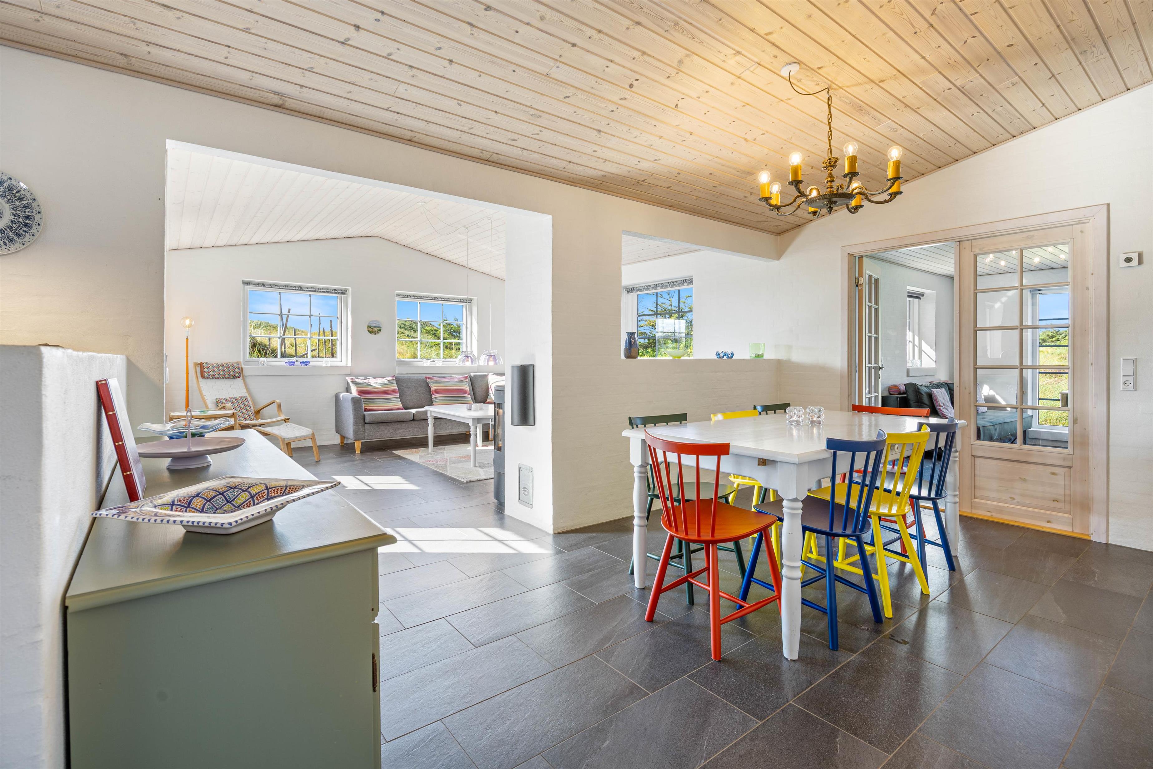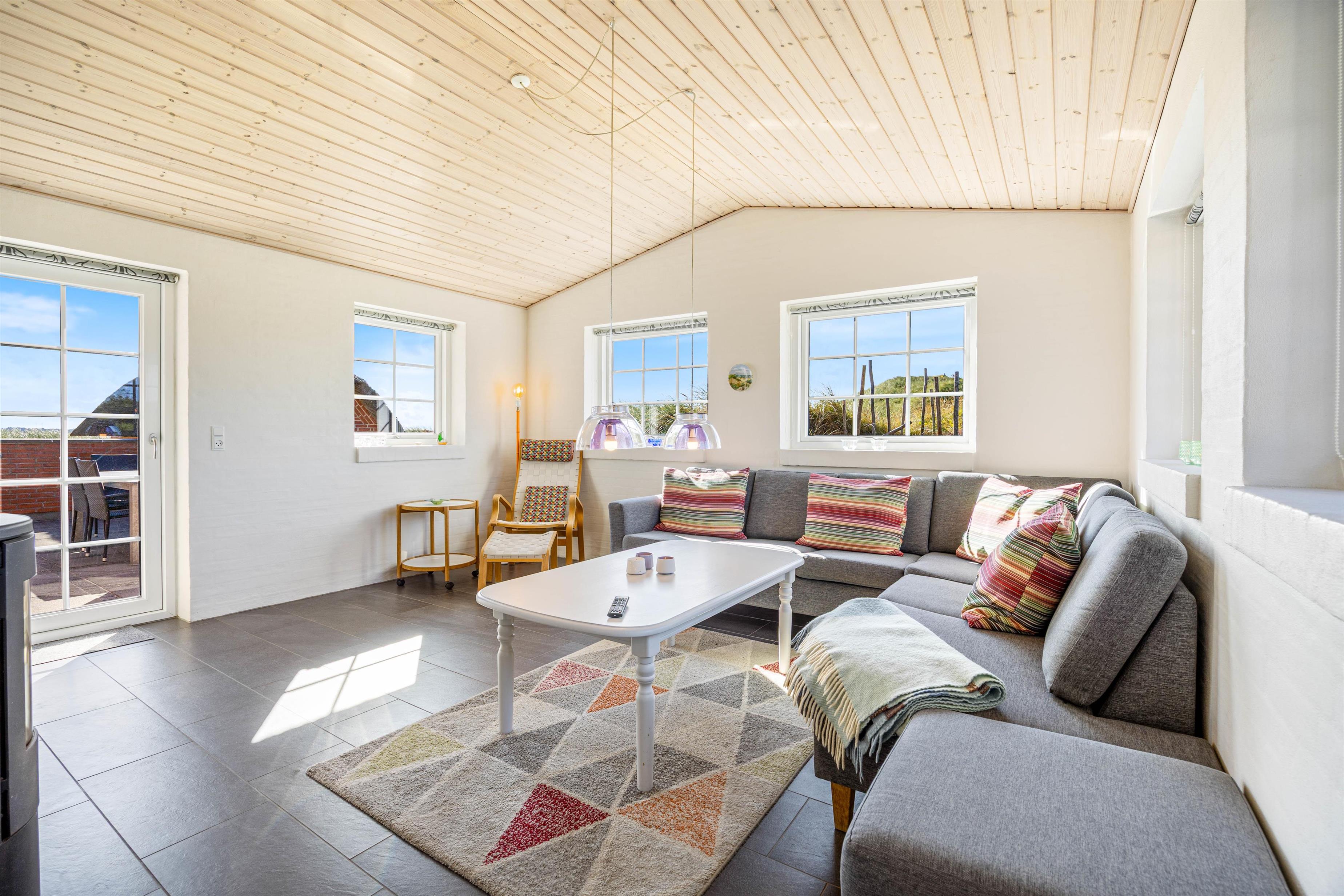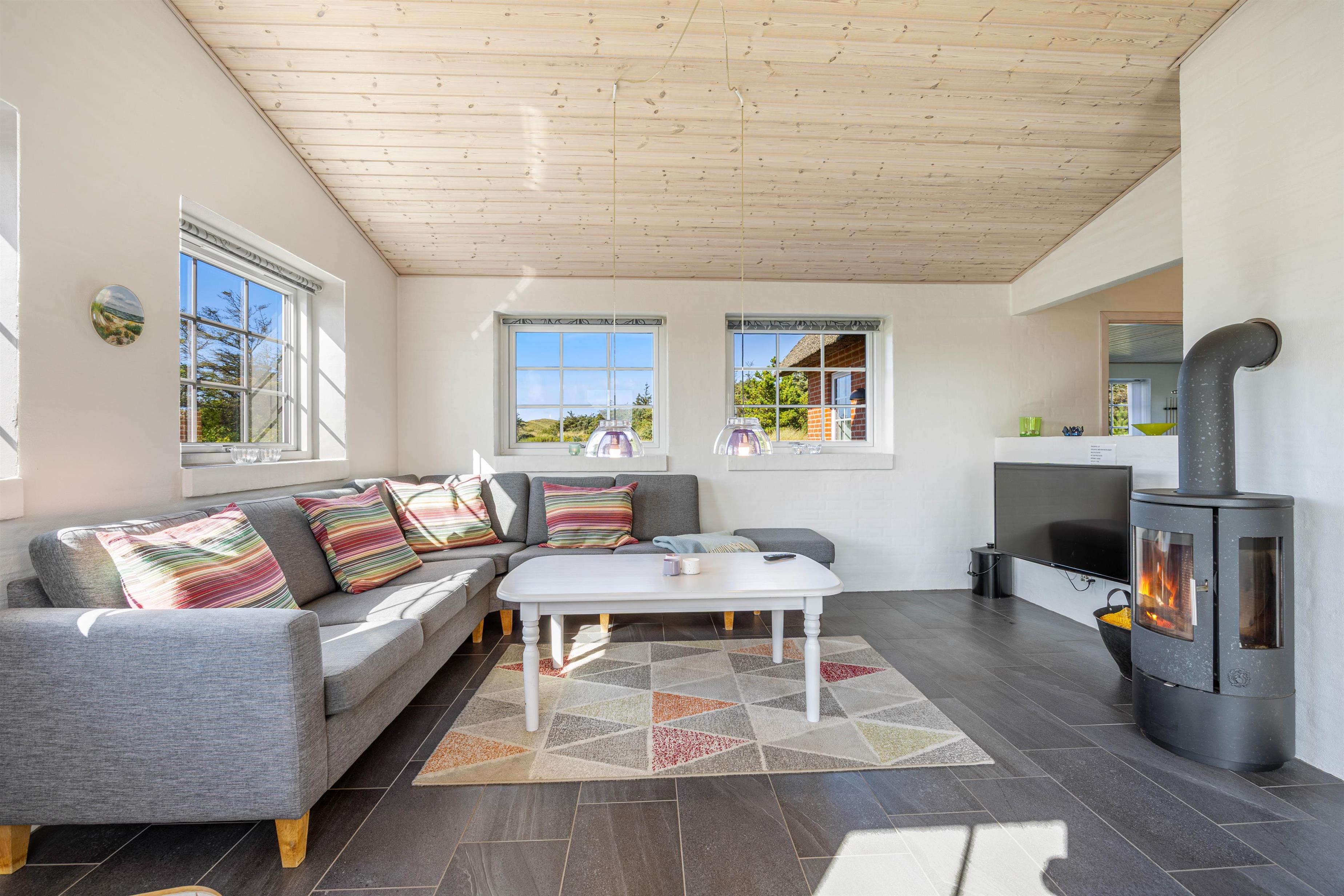 Husby Klitvej 35 er det perfekte valg til en ferie fuld af naturoplevelser, sjov og afslapning. Tænd op i brændeovnen efter dagens gåtur ved havet og nyd et glas vin foran flammerne i husets flydersofa.