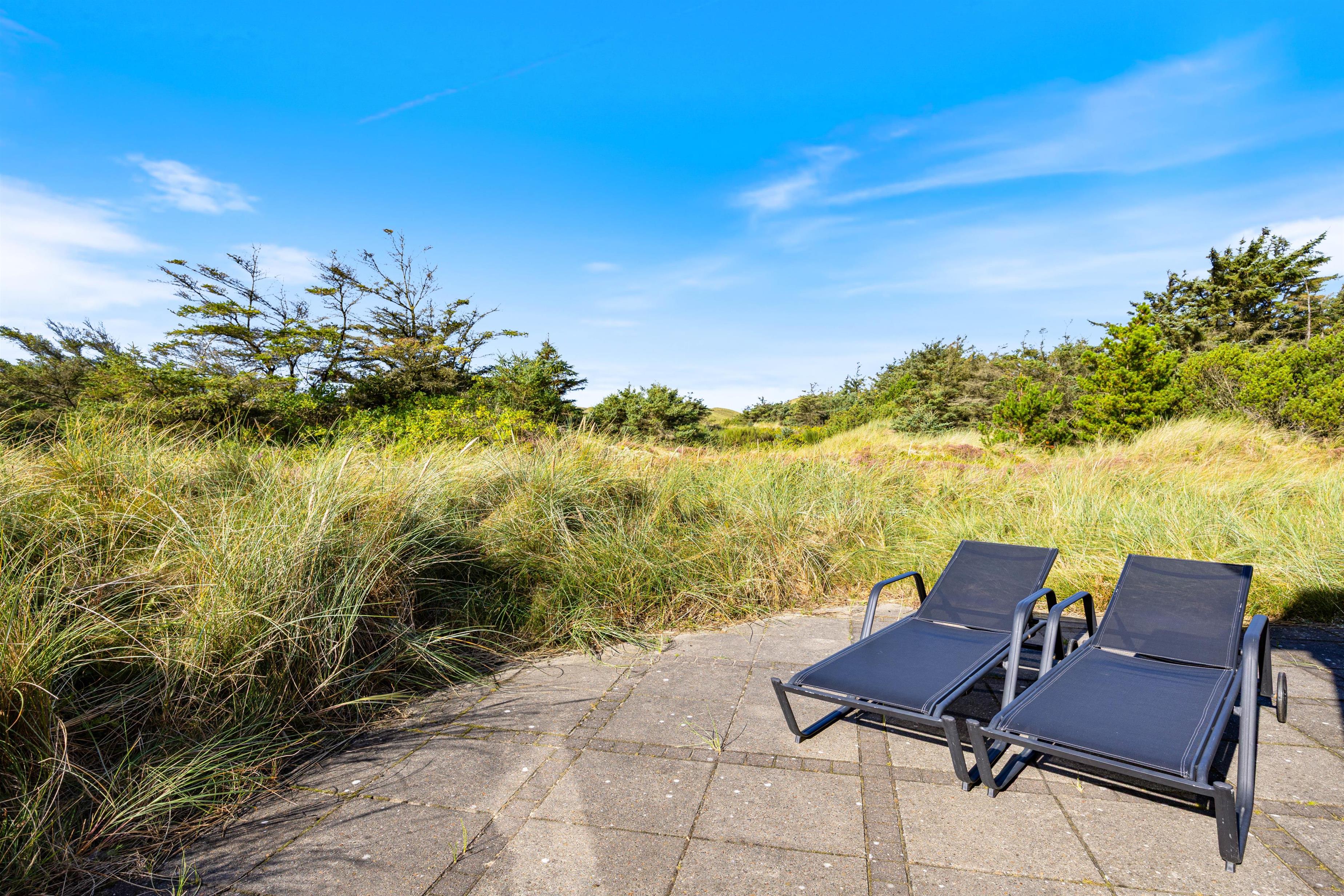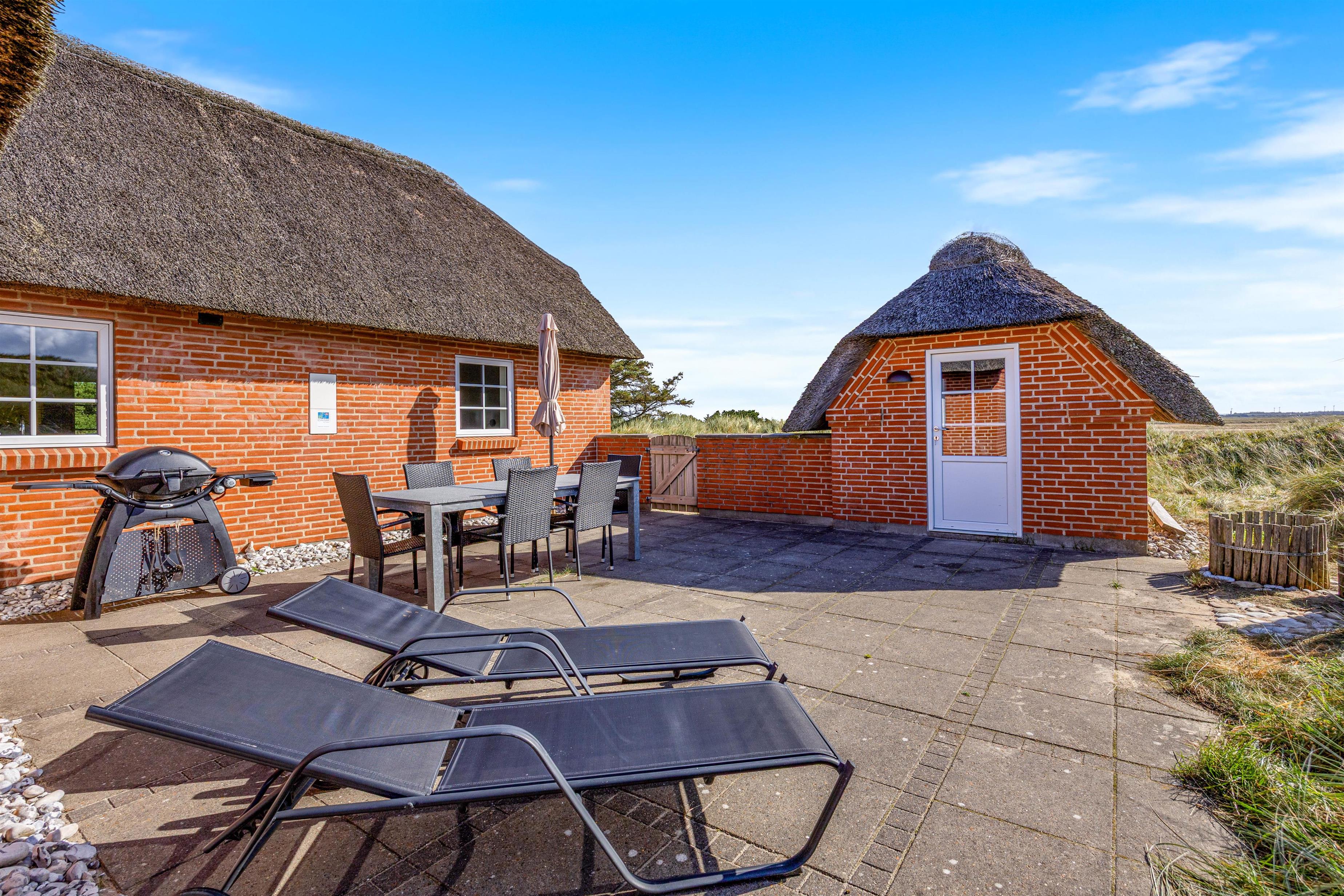 På husets syd- og sydvestvendte terrasser kan I følge solens gang over himlen lige fra morgenkaffen og helt indtil solen går ned over klitterne. Foruden liggestole, parasol og fire liggestole står også en praktisk gasgrill til rådighed, der gør det ekstra nemt og lækkert at tilberede en lækker grillmiddag.