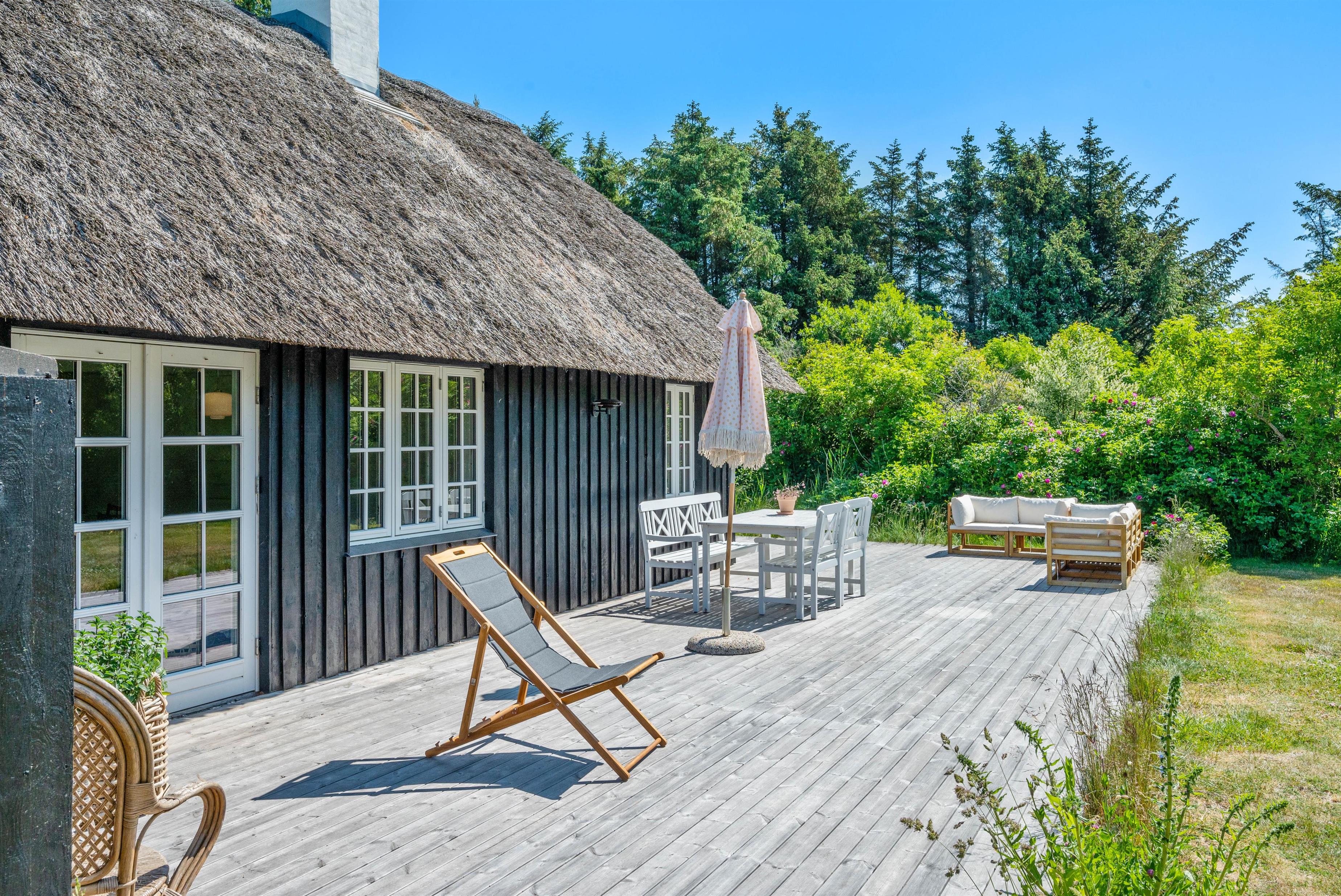 Rundt om sommerhuset er en skøn træterrasse med havemøbler, grill og solvogn til rådighed. For enden af gavlen finder I en skøn udebruser, så I kan skylle sandet af fødderne efter en dejlig gåtur langs havet, i det fine hvide sand. Udebruseren må benyttes fra april til november. Her er virkelig dømt afslapning og fred, hvor I kan sidde og nyde solen, mens I læser en god bog eller nyder en kølig drink på den dejlige træterrasse, der omslutter huset.