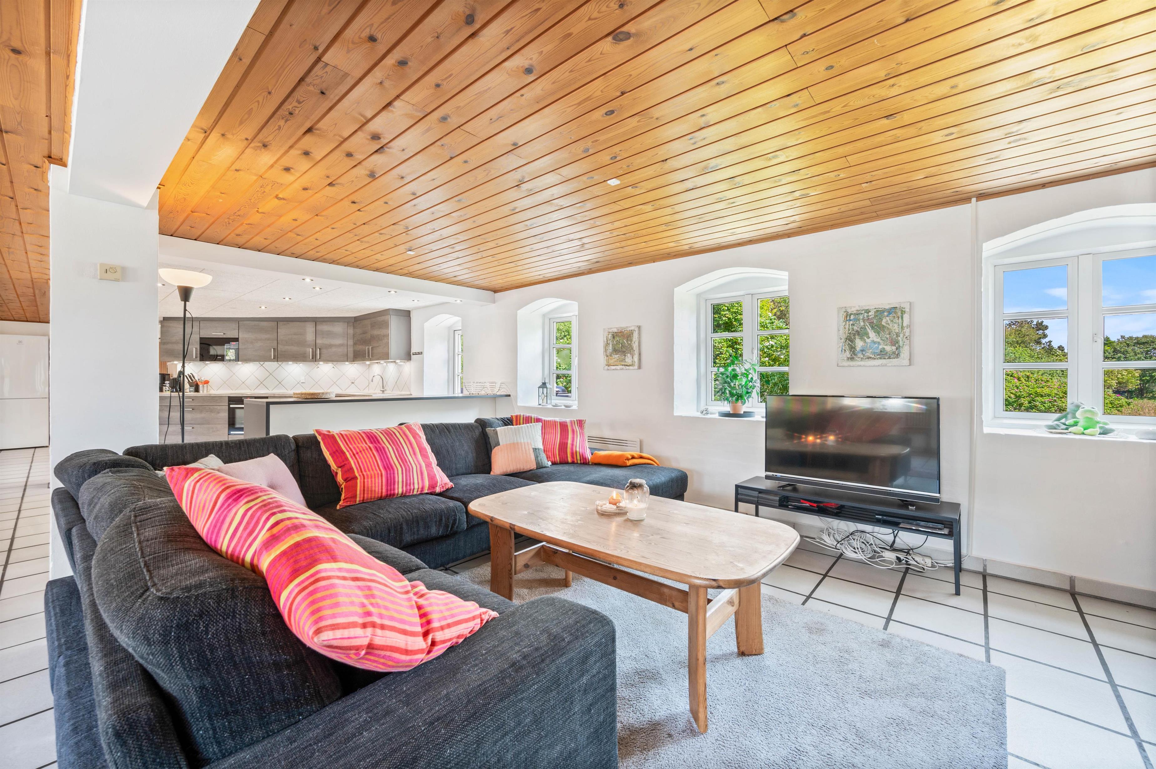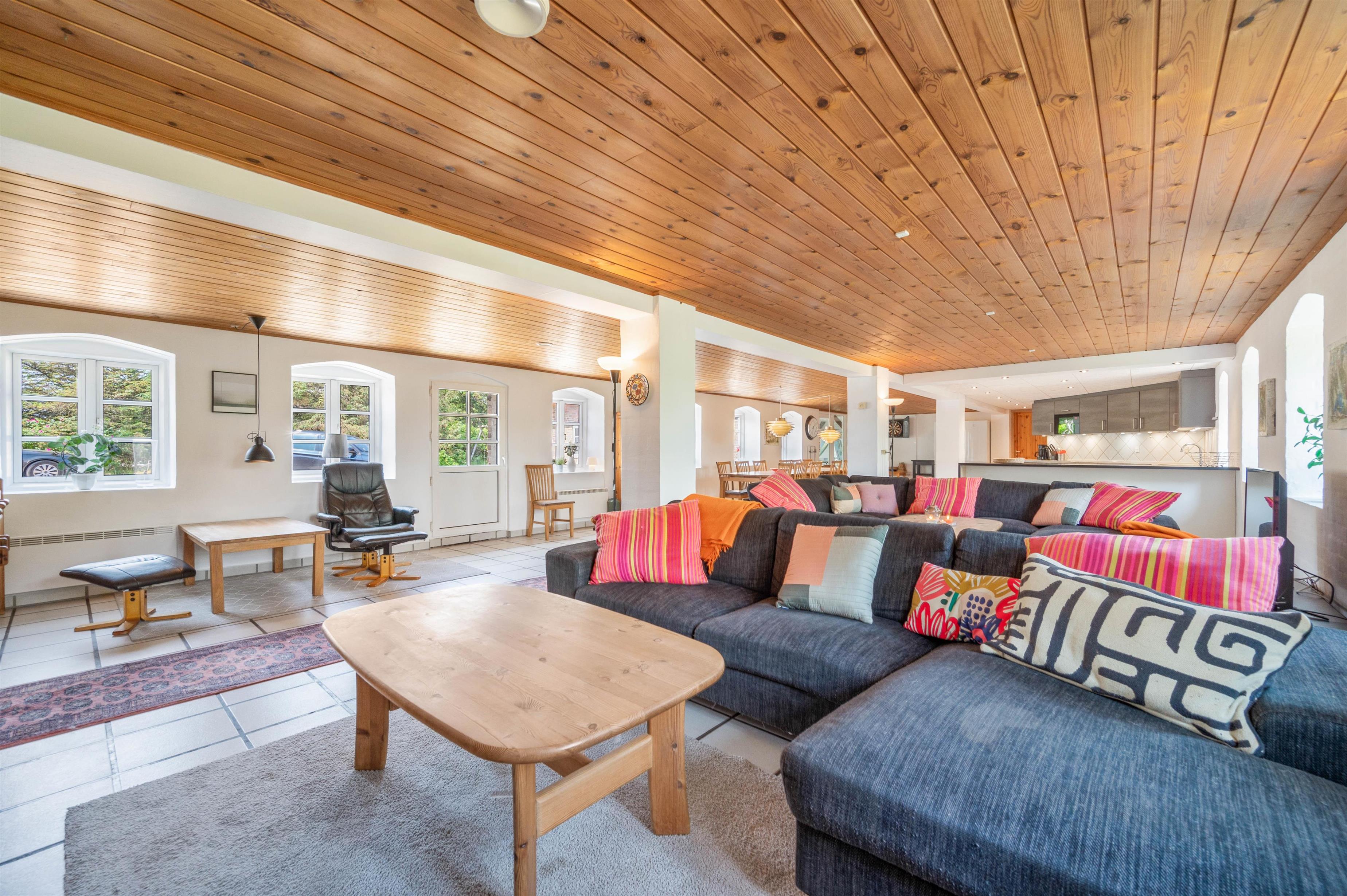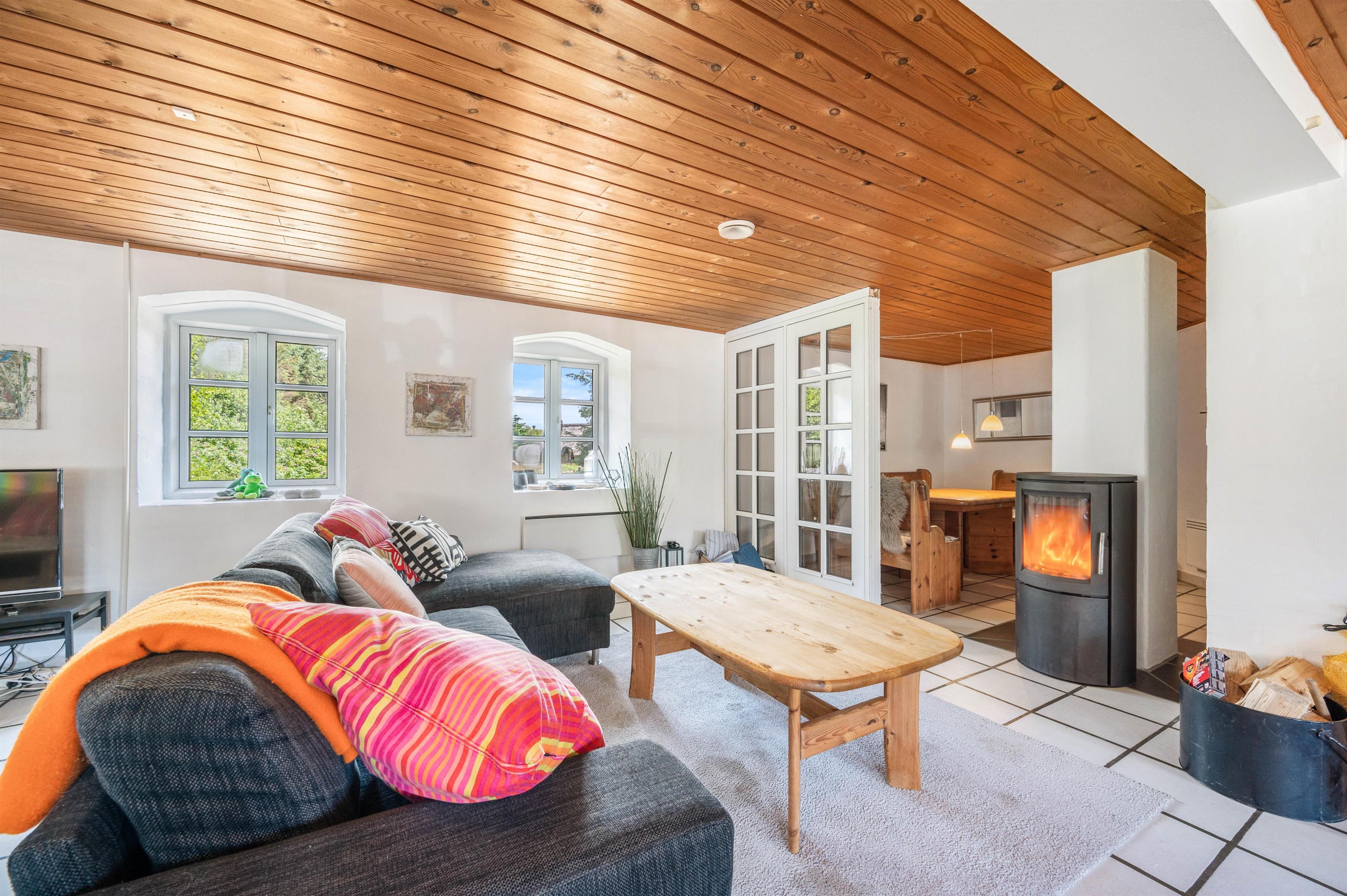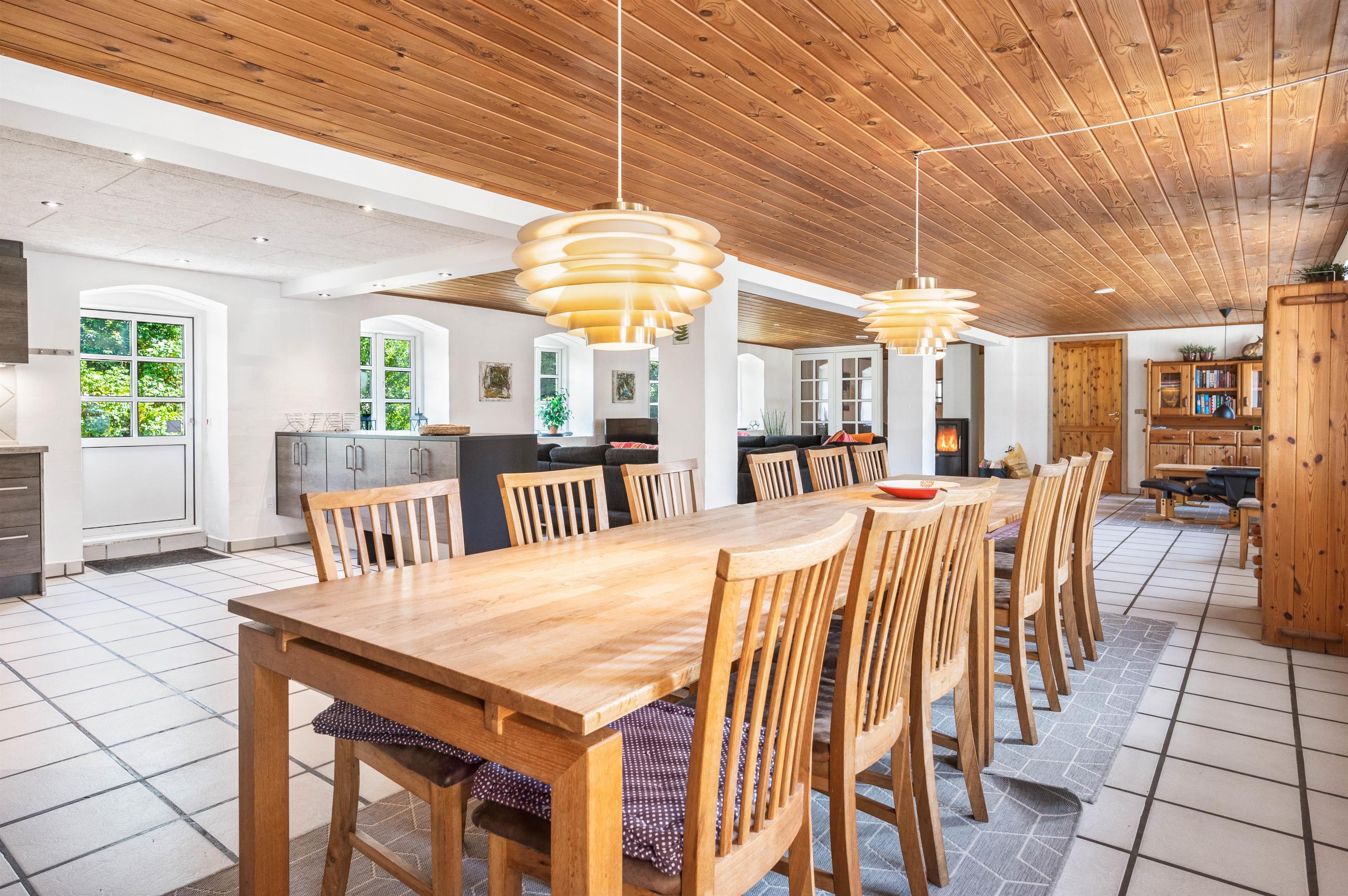 Sommerhuset er fordelt på 7 soverum, heraf har det ene dobbeltseng og derudover er der 6 enkeltsenge og 3 køjesenge. Stuen er i åben forbindelse med køkkenet, så I alle kan følge med i madlavningen og ferieplanlægningen.