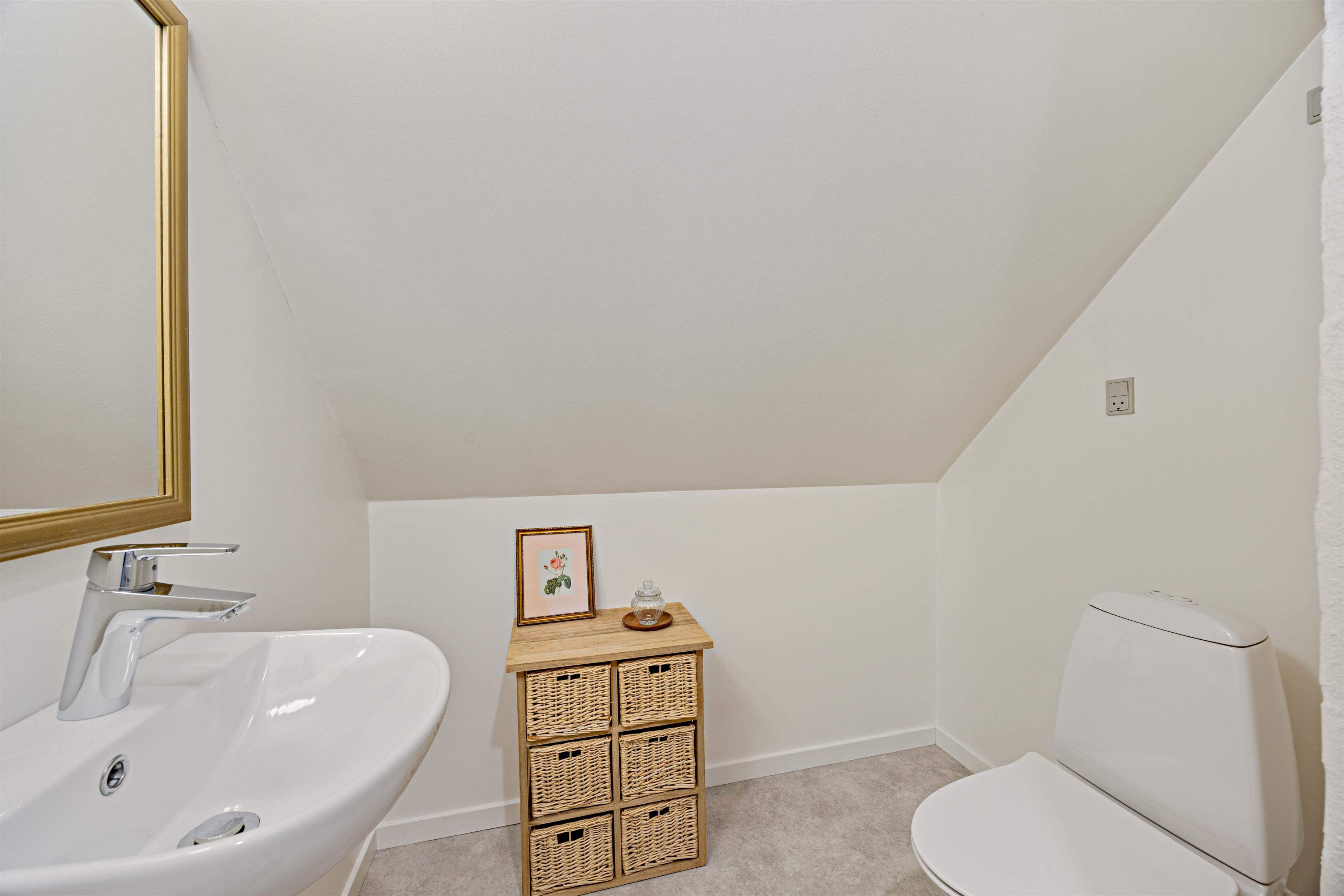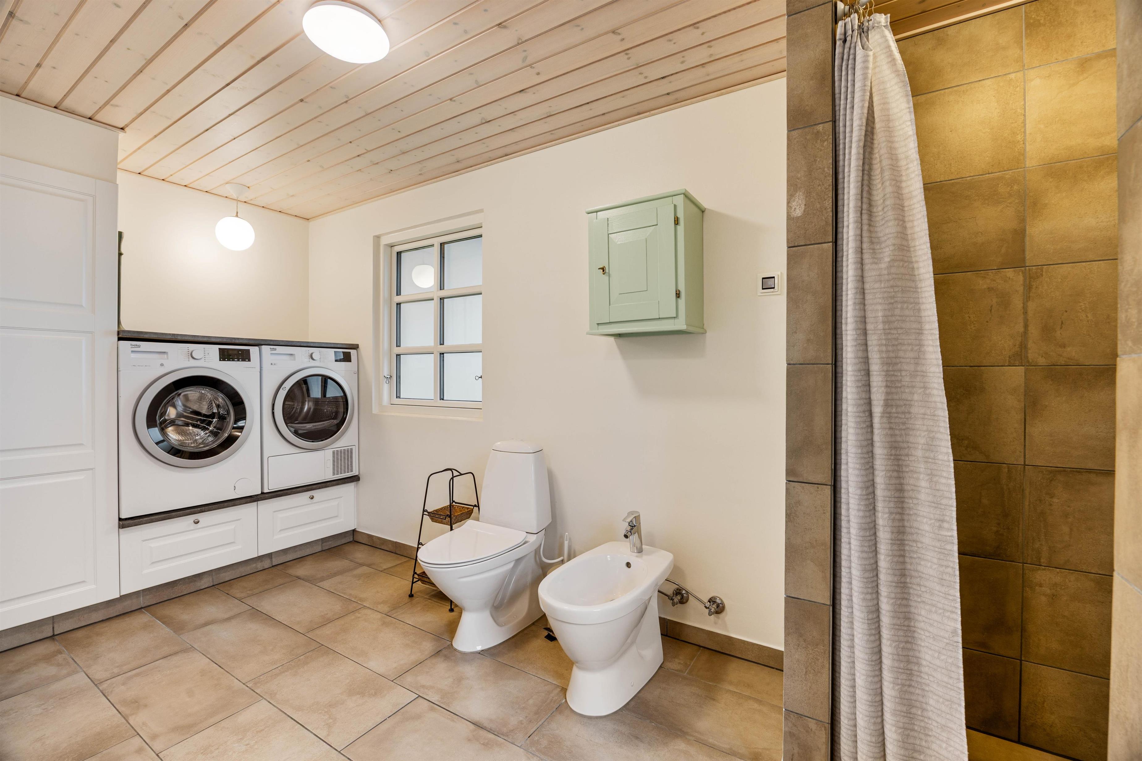 Det store moderne og rummelige badeværelse i stueetagen er udstyret med gulvvarme, så I ikke skal tænke på at få kolde fødder. Vaskemaskinen og tørretumbleren i huset sørger for en del af det praktiske under jeres ophold.
