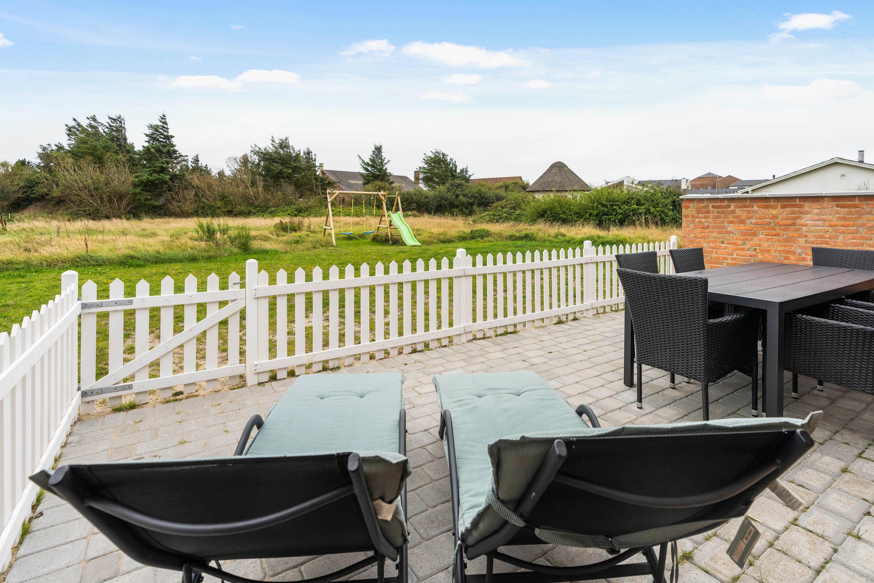 Den store solterrasse på Vedersø Klitvej 40B kan lukkes helt af. Børnefamilien og hundeejerne kan således føle sig trygge, når de åbner op for terrassedøren og søger ud for at nyde solen og den friske havluft på terrassen, hvor havemøblerne og liggestolene står klar.