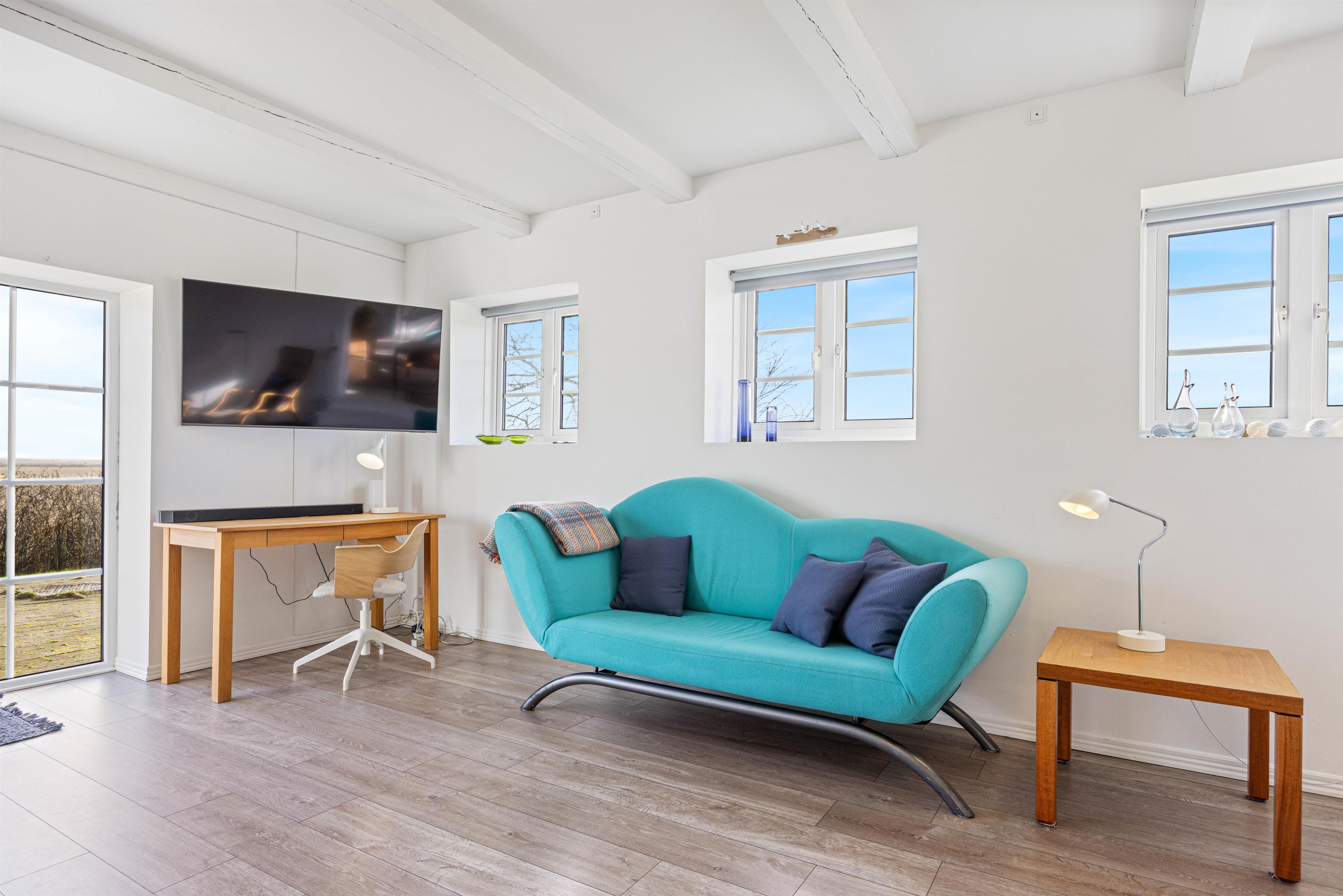 Den store TV-stue har en storslået udsigt over Vest Stadil Fjord, hvor man kan følge med i naturens gang - og ofte se dyrene helt tæt på.
