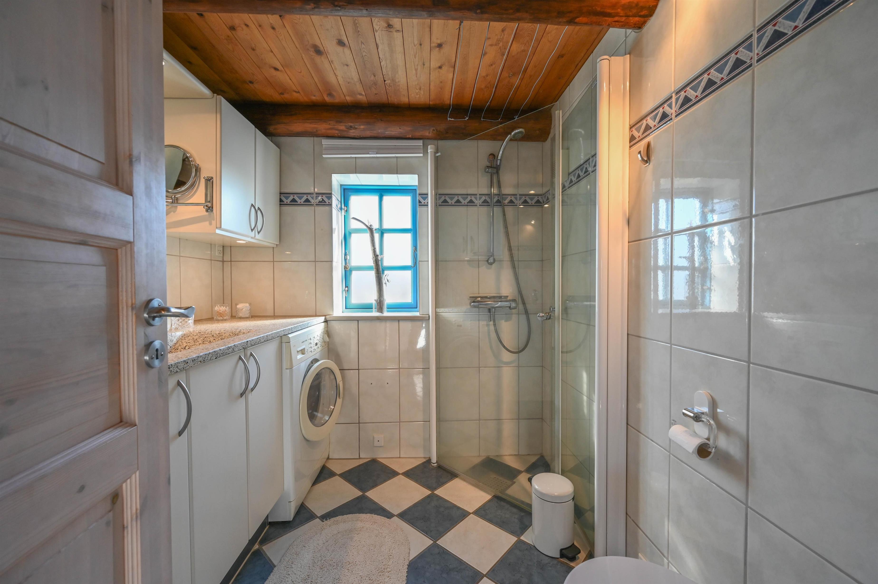 I stueplan finder I et soveværelse med dobbeltseng, en lille gang og et flot badeværelse med gulvvarme.