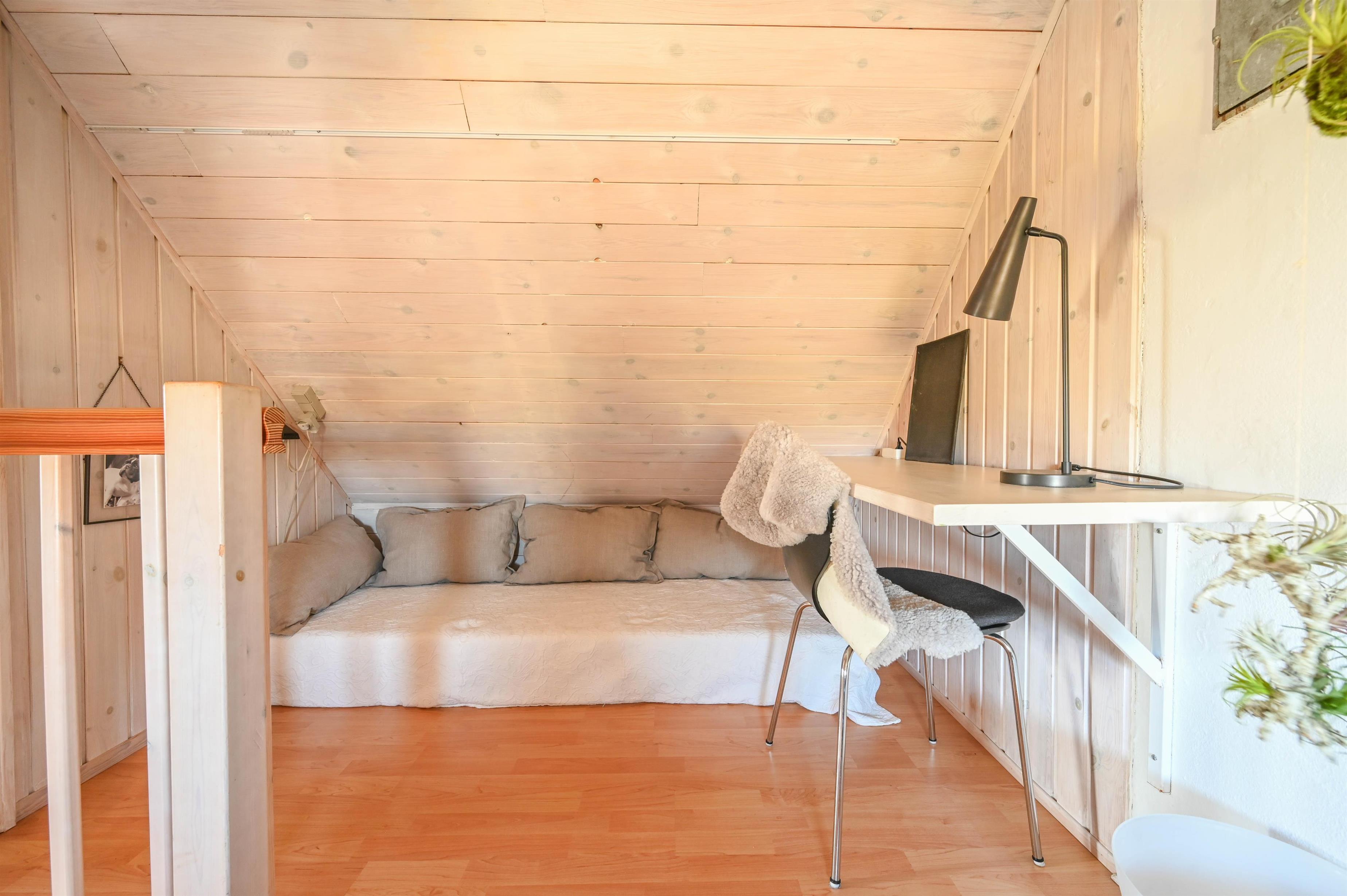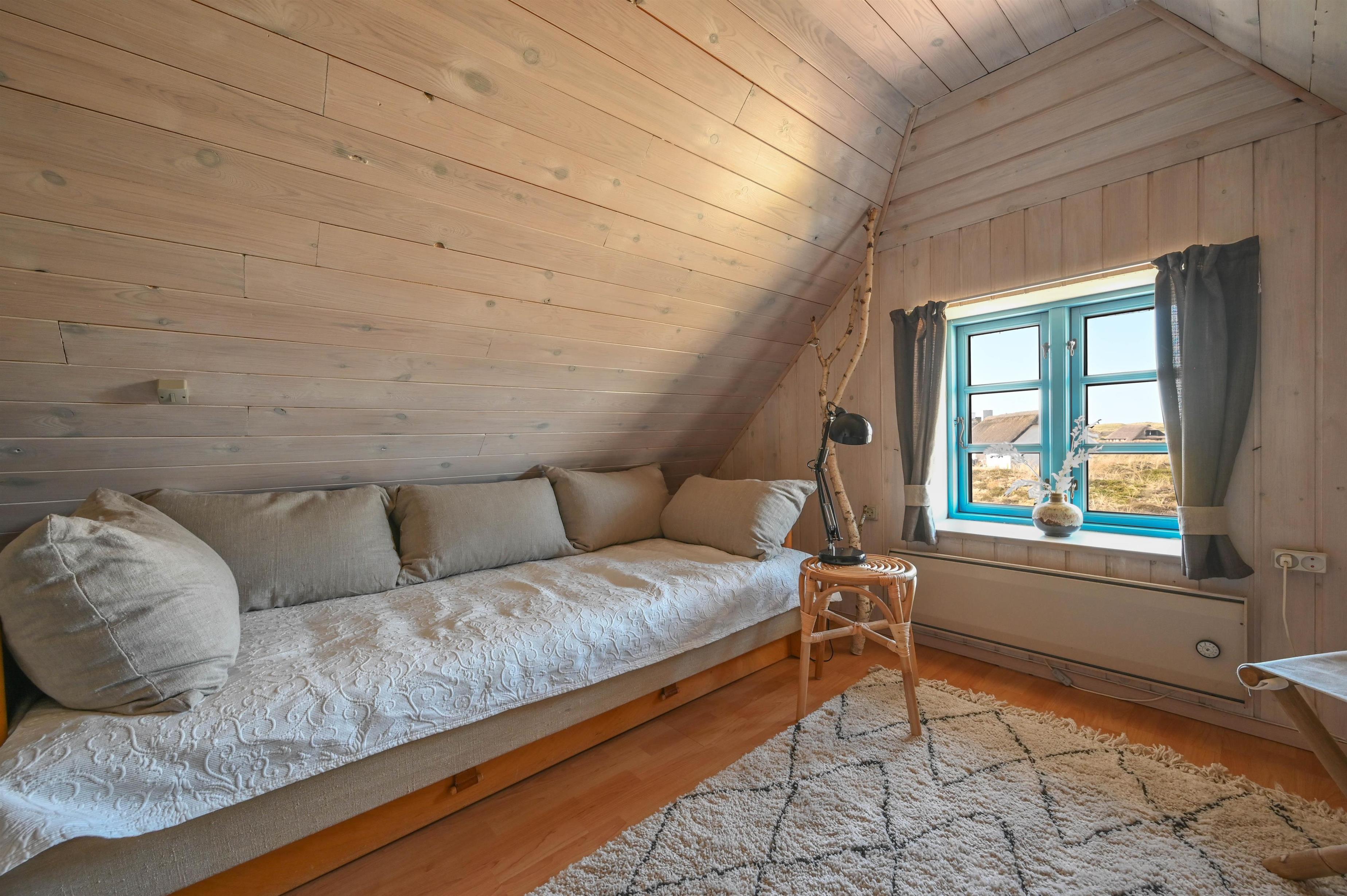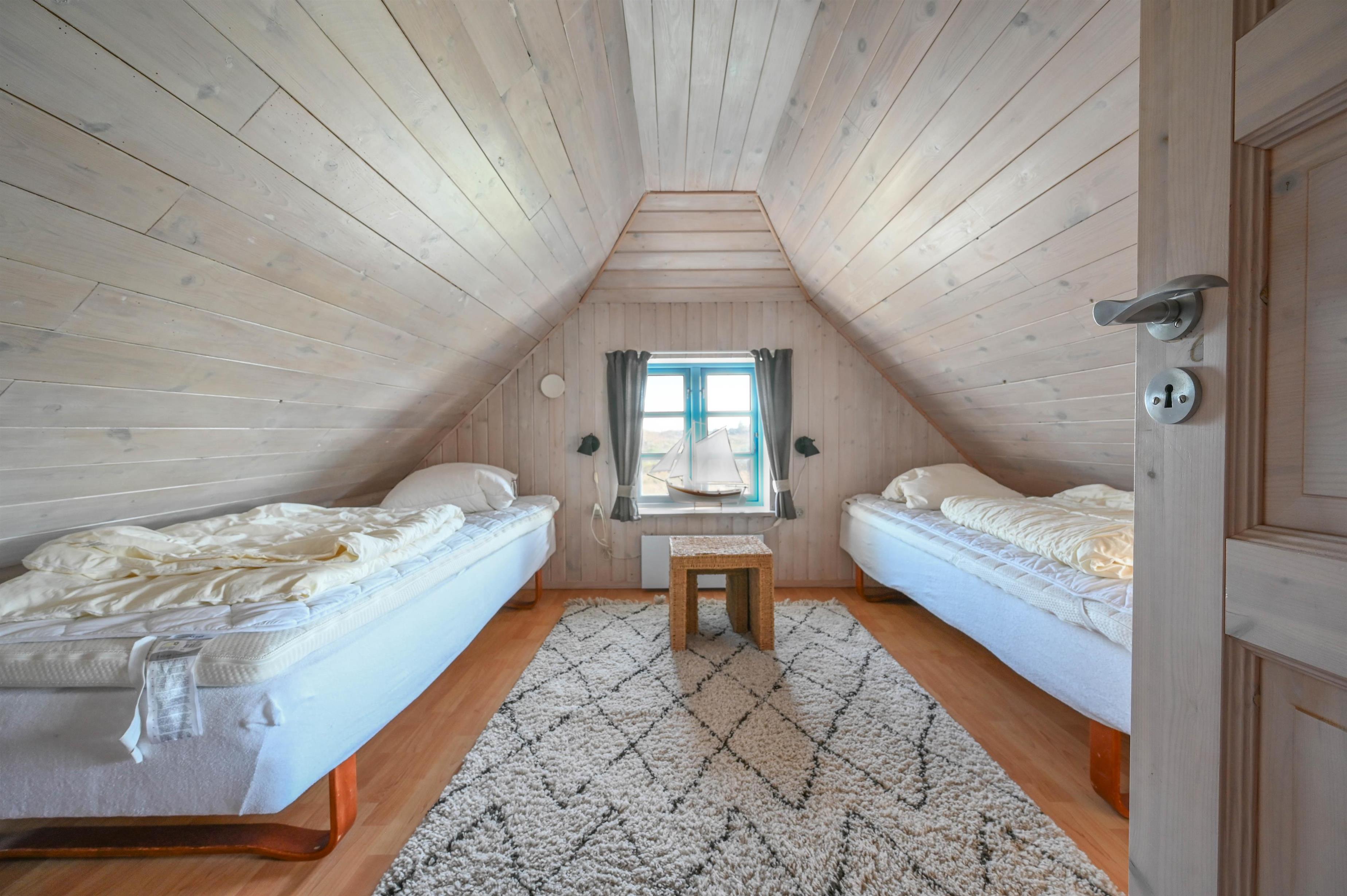 En trappe fører op til første sal, hvor der er to værelser – ét med to enkeltsenge og ét med en dobbeltsovesofa. Et oplagt sted for børnene at have deres eget lille feriehjørne.