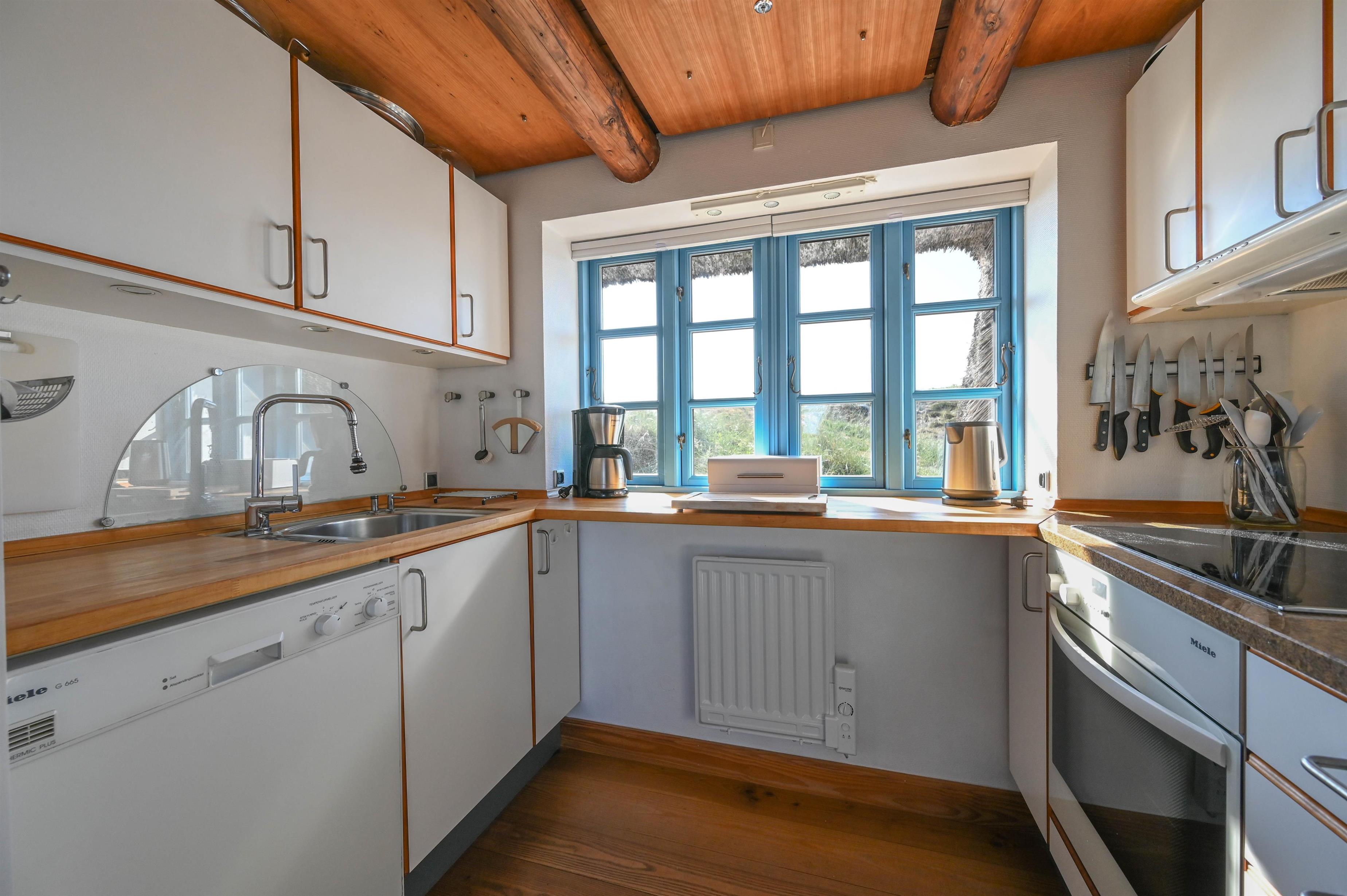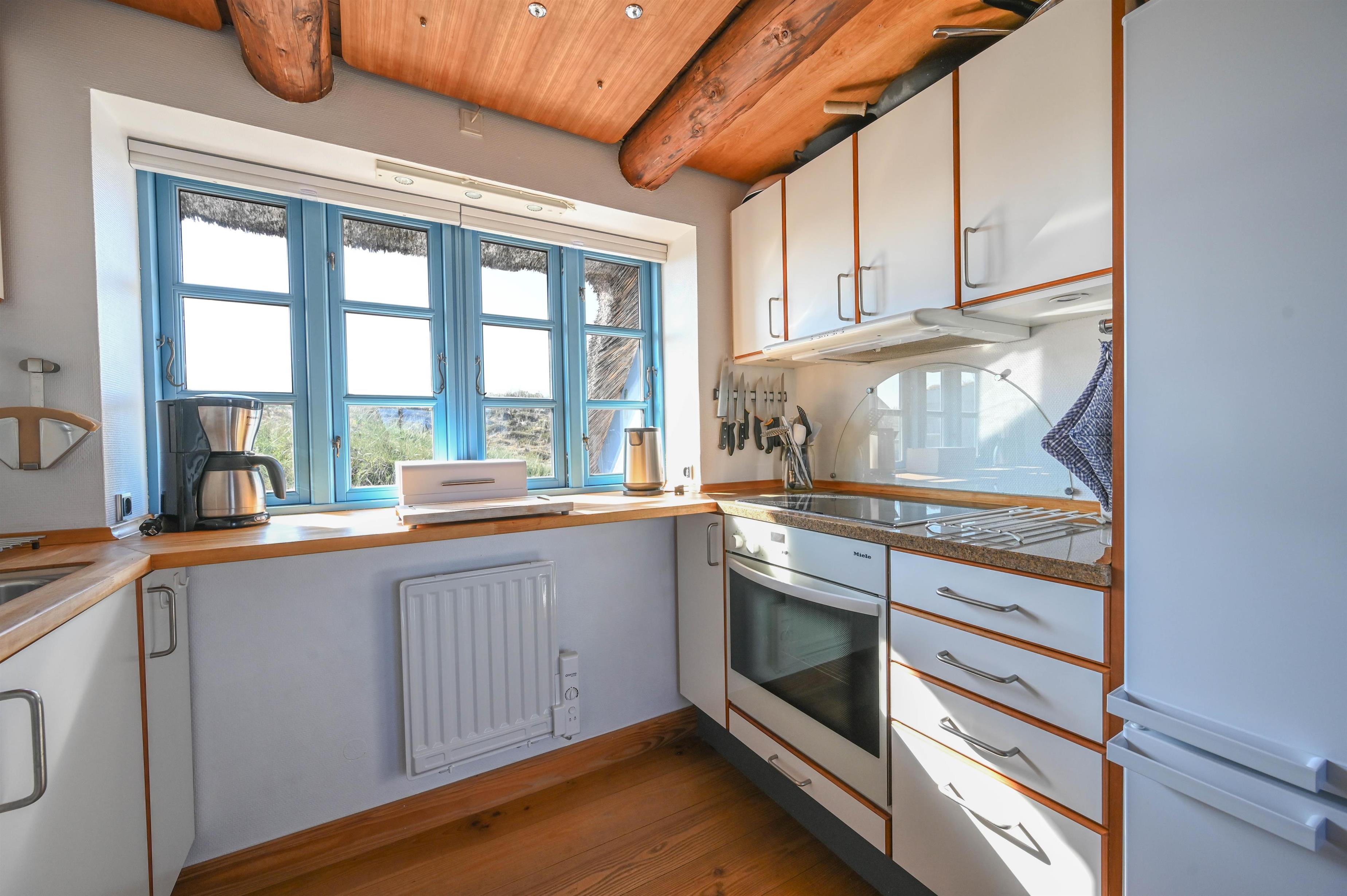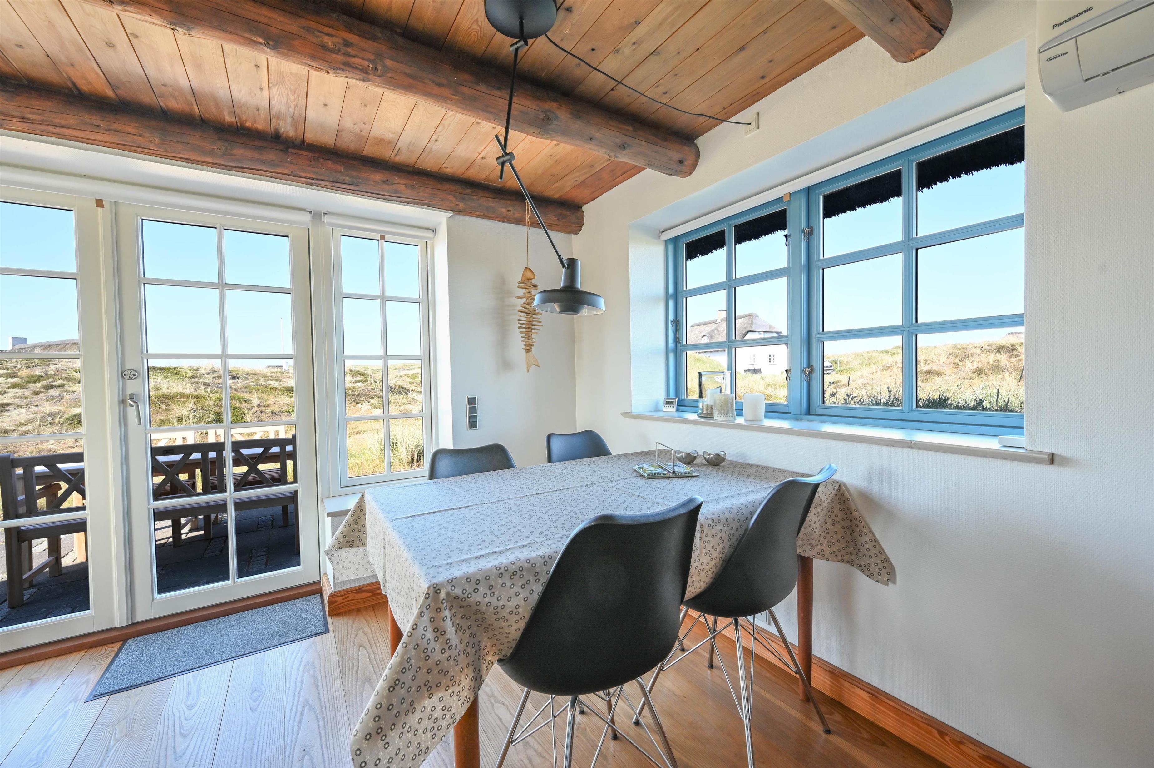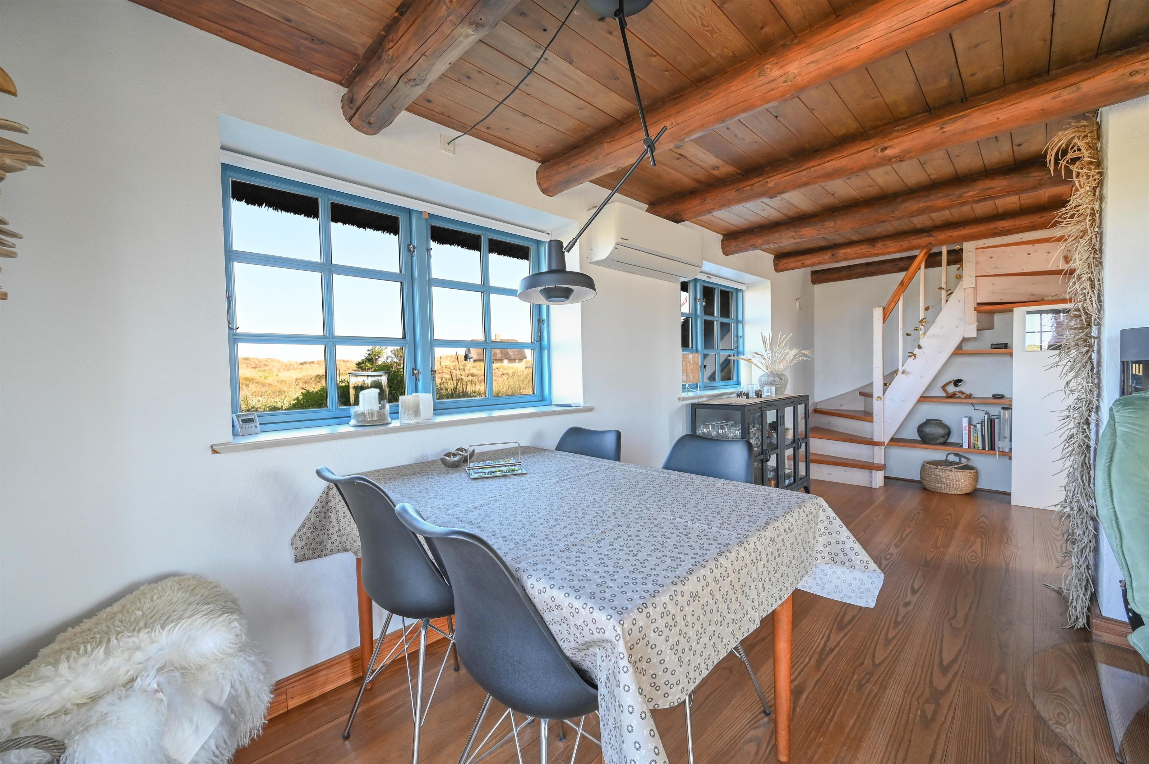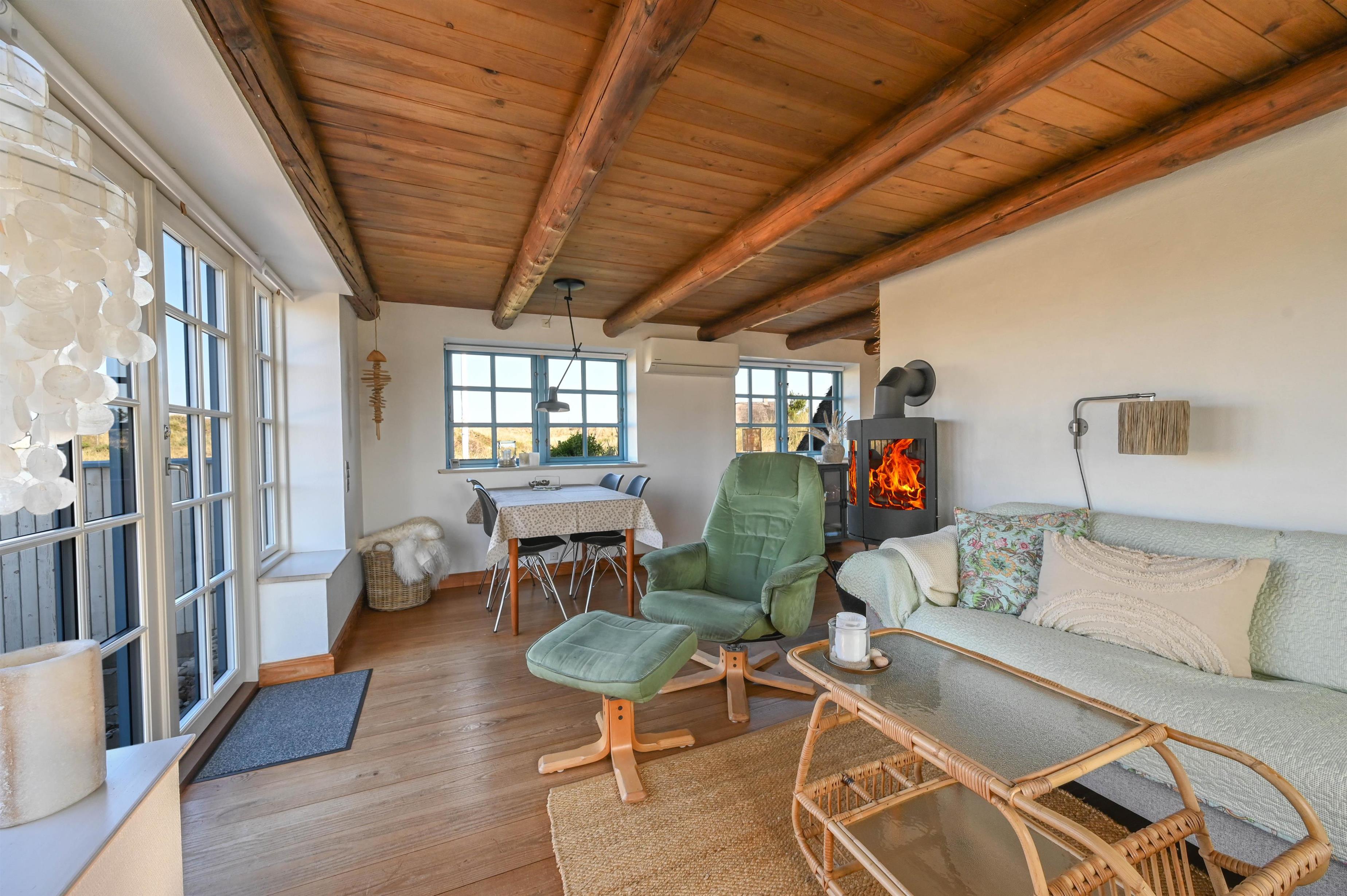 Det dejlige køkken/alrum danner rammen om samvær og gode måltider, og fra sofahjørnet i stuen har I en fantastisk udsigt over klitterne mod vest – et perfekt sted at nyde en kop kaffe eller bare slappe af efter en dag ved stranden.