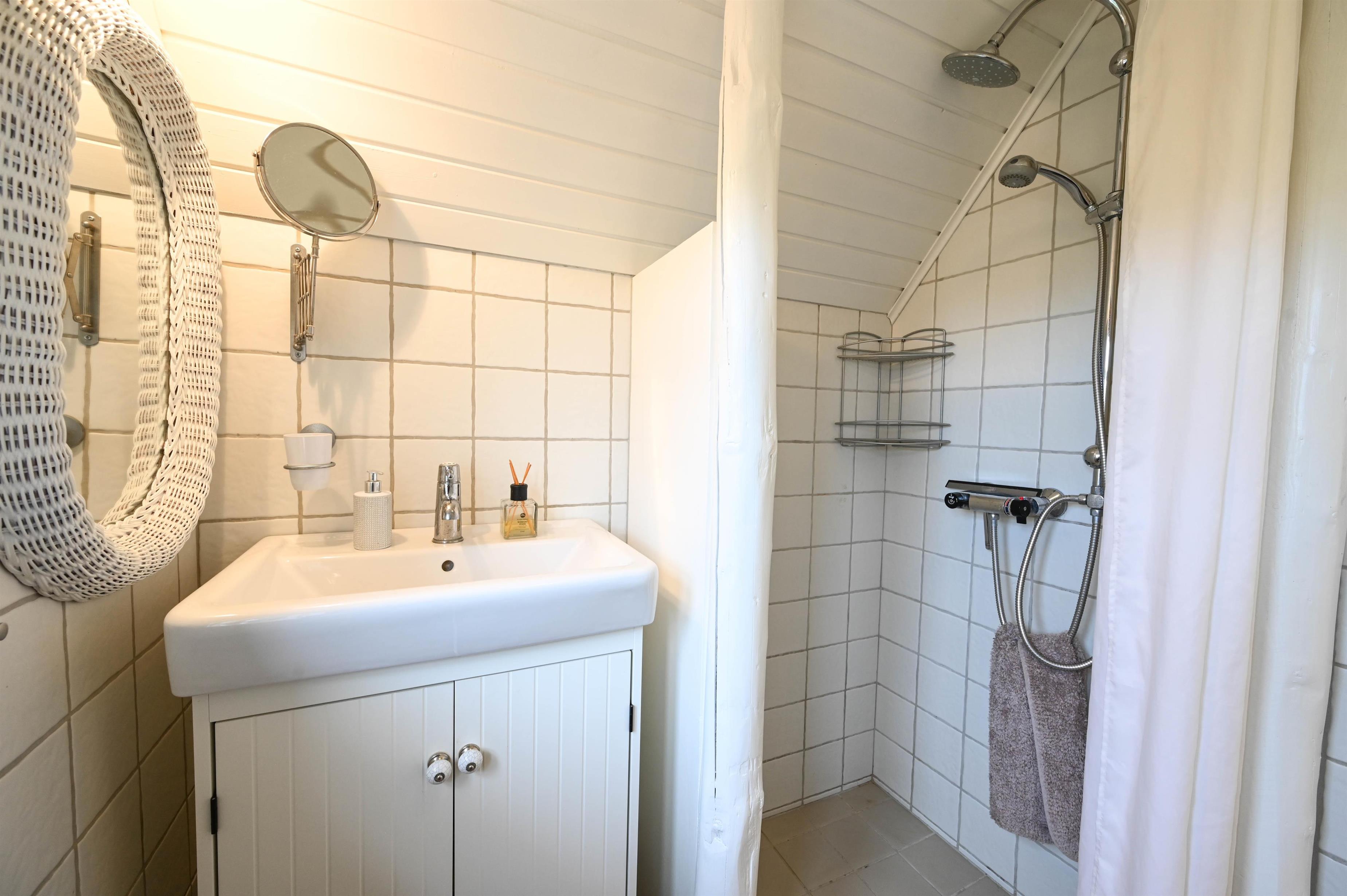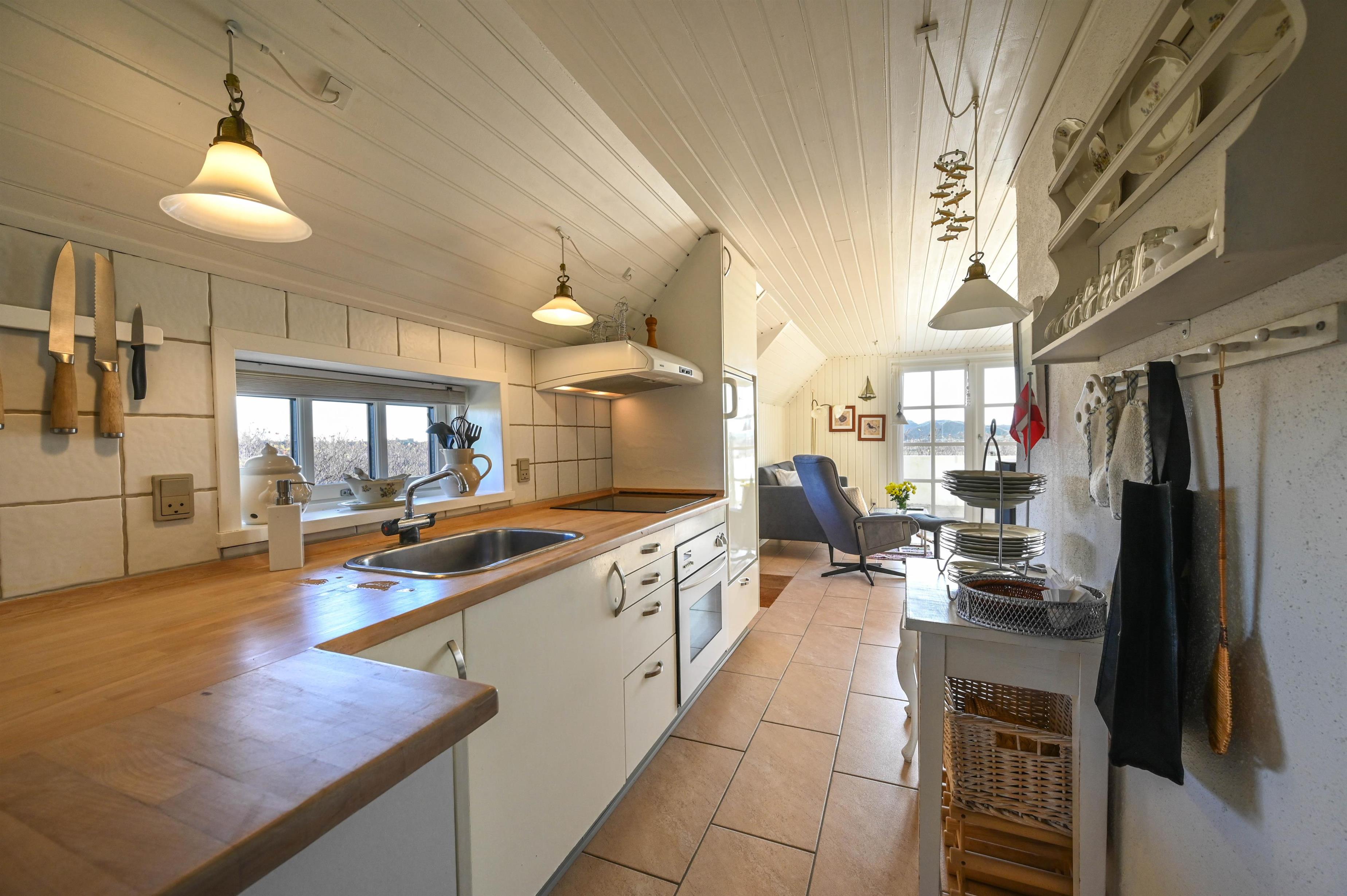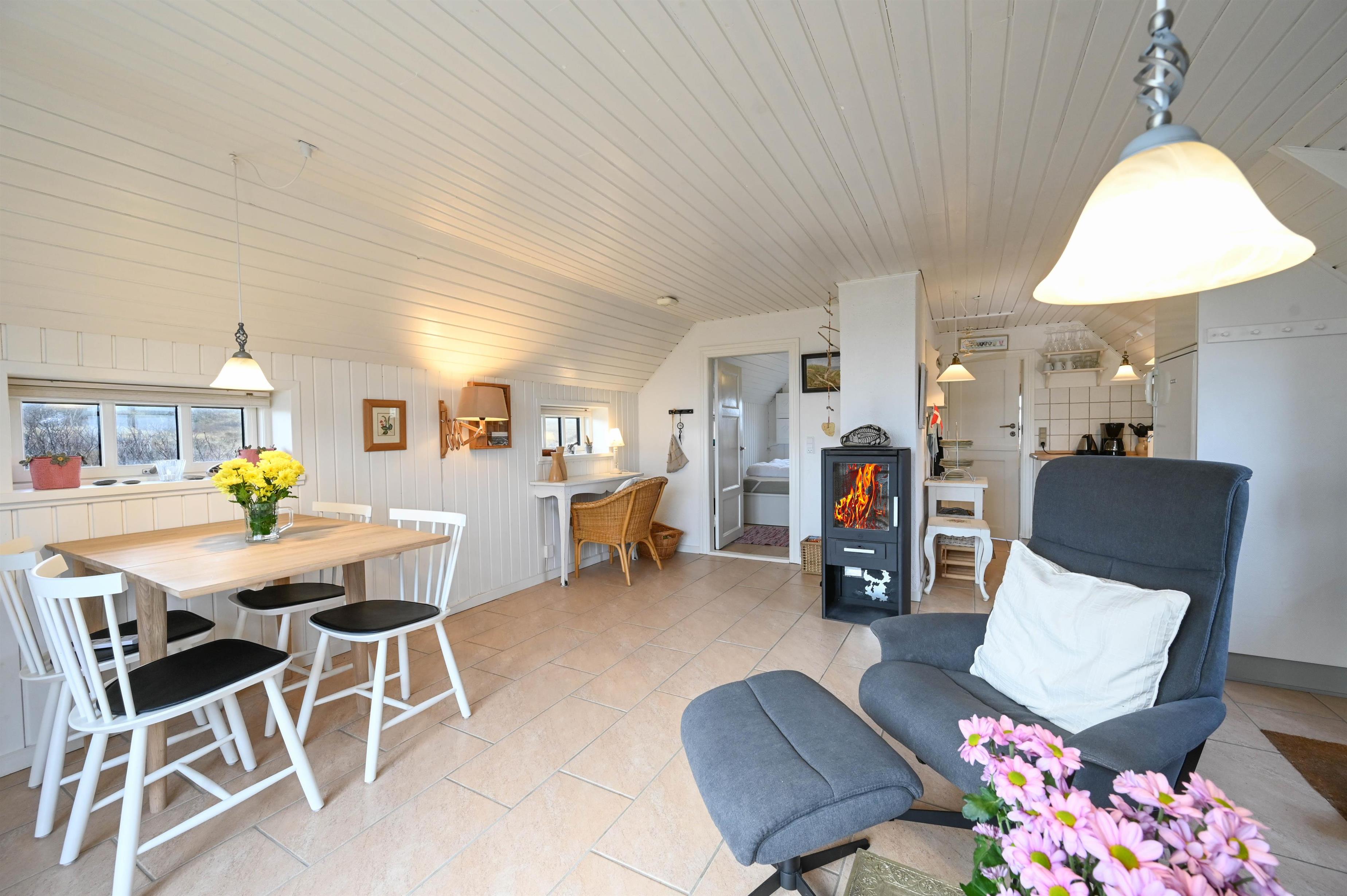 Tophuset blev opført i 1932 og er siden nænsomt moderniseret, så det i dag fremstår lyst, tidssvarende og utroligt hyggeligt. Indenfor mødes du af et indbydende opholdsrum med åbent køkken/alrum, brændeovn og klinkegulv med gulvvarme, der sikrer en behagelig stemning året rundt. Badeværelset er funktionelt med bruseniche og gulvvarme, og i det store soveværelse finder du en komfortabel dobbeltseng.