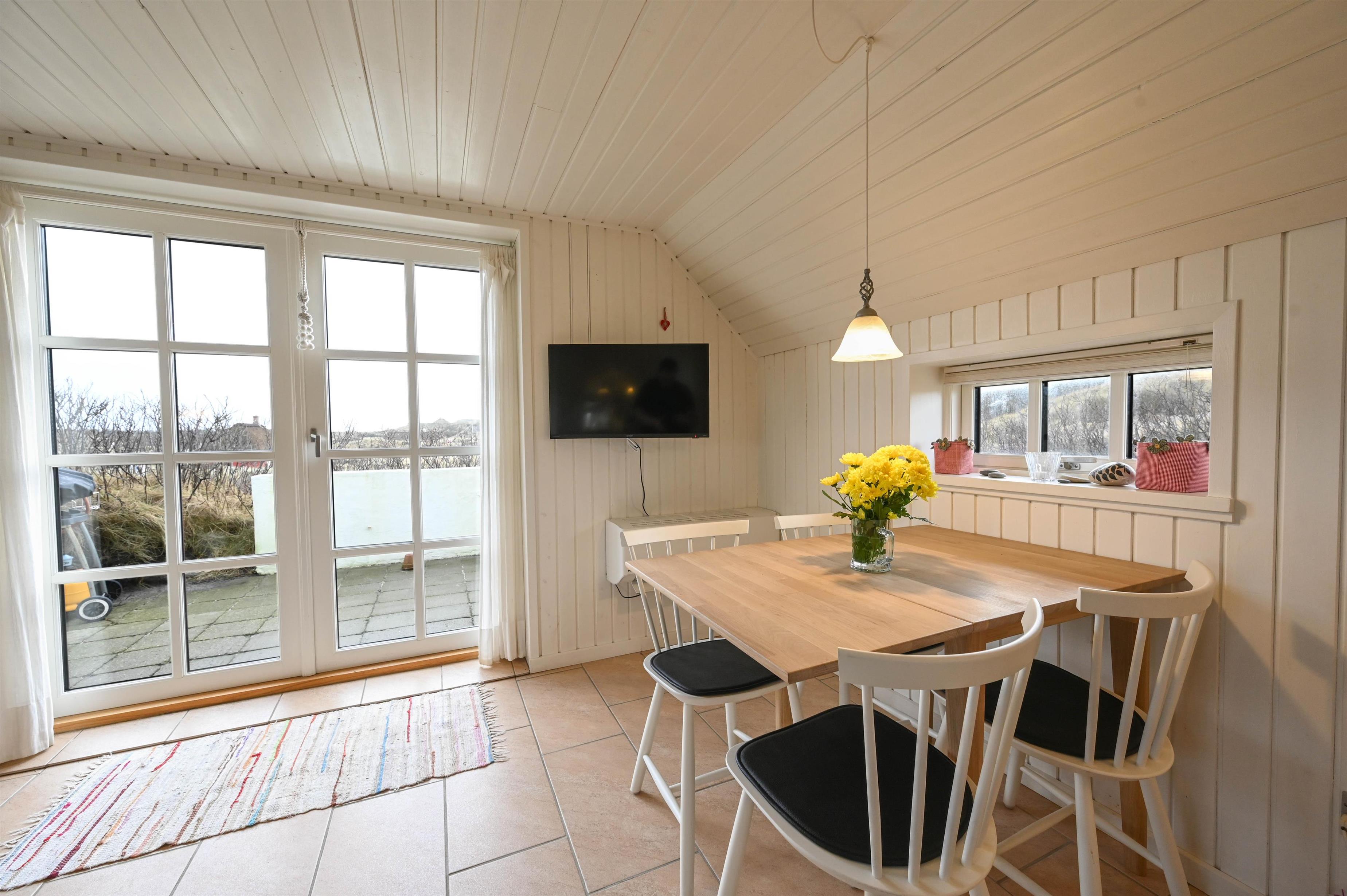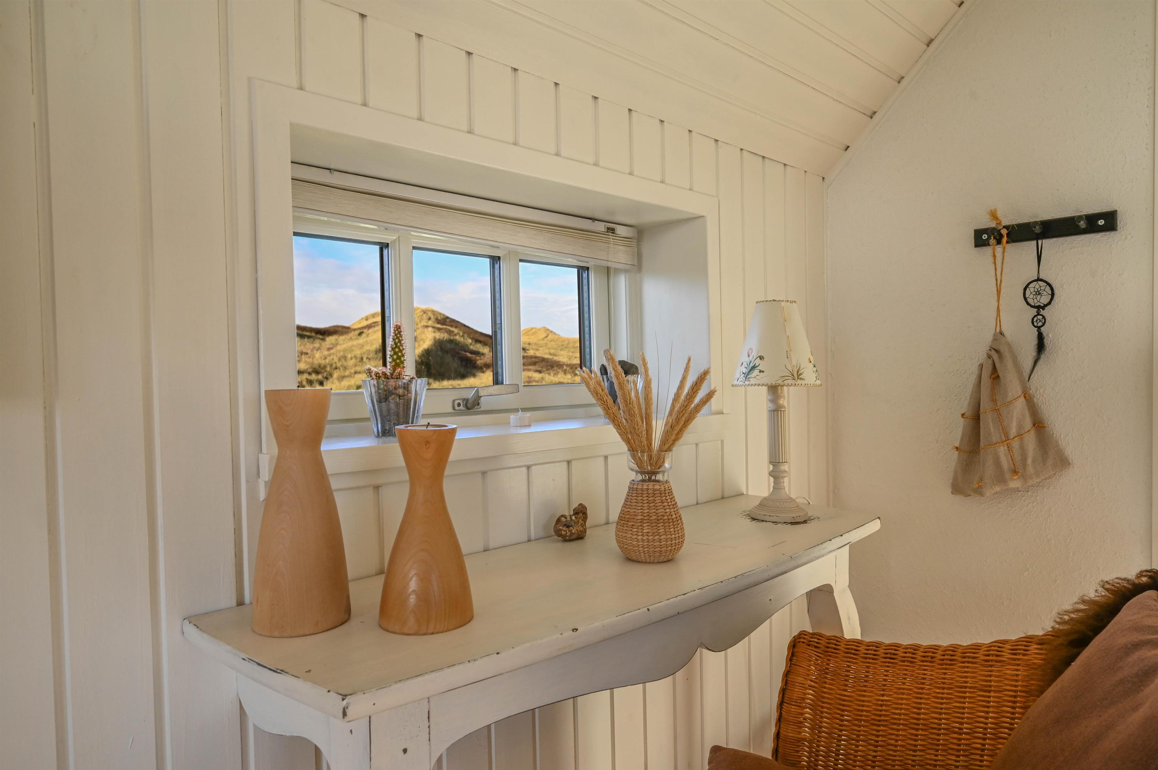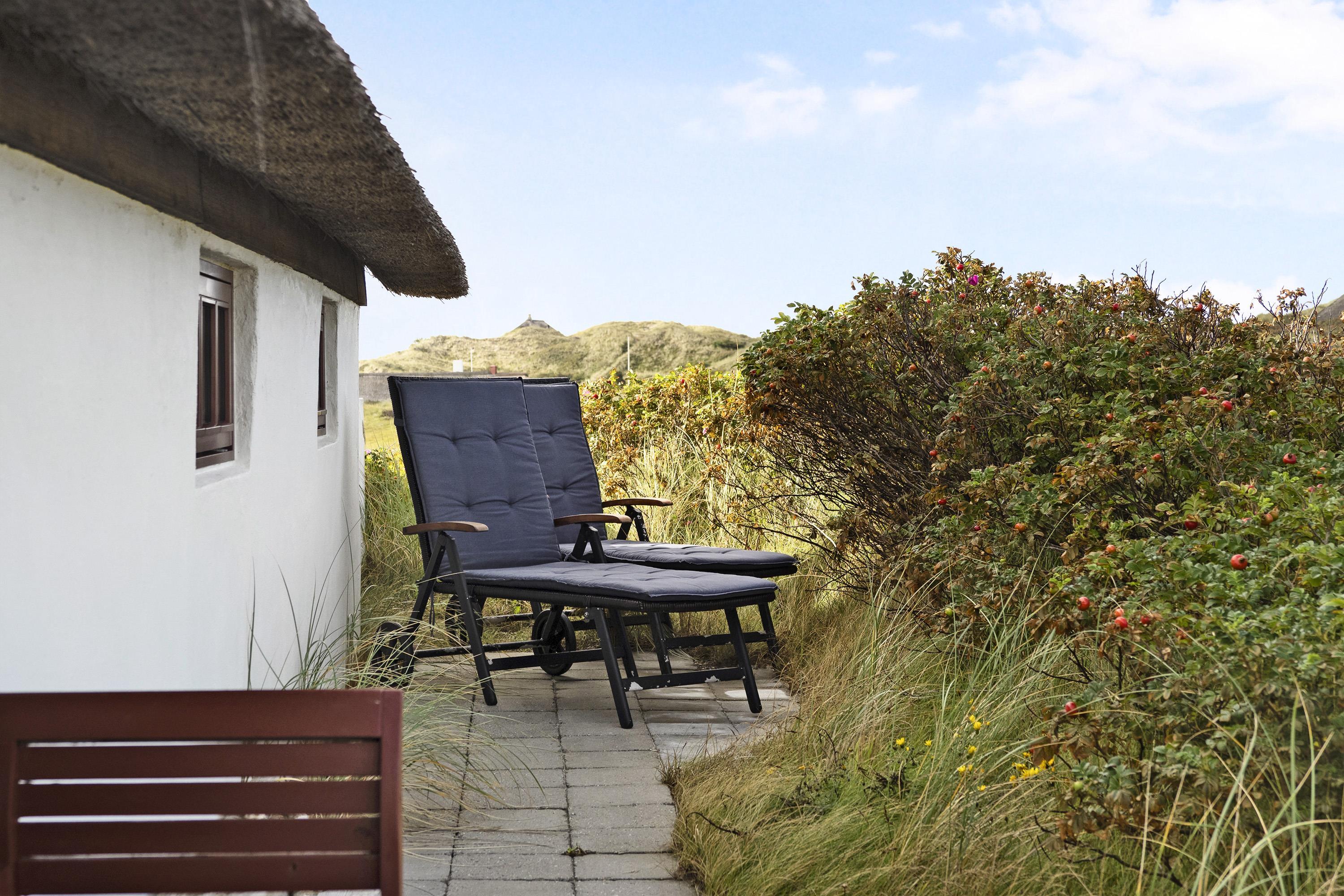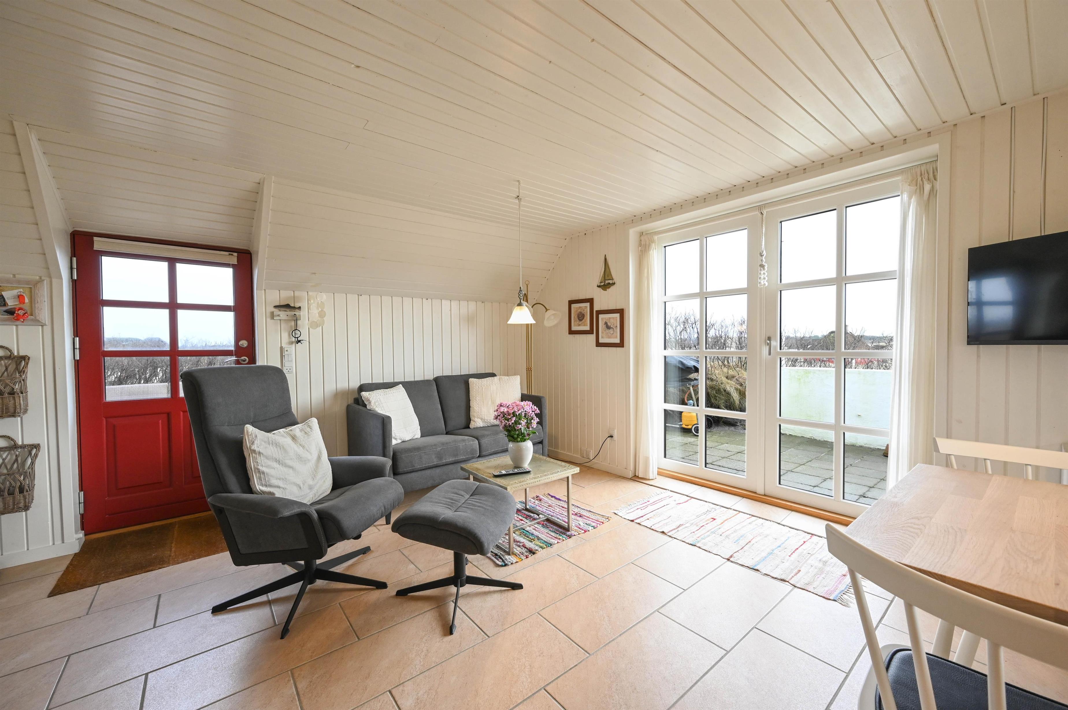 De store terrassedøre mod syd lukker dagslyset ind og åbner stuen op mod den betagende udsigt over klitterne – et perfekt sted at nyde morgenkaffen eller solnedgangen. Rundt om huset findes flere terrasser, så du altid kan finde et læfyldt og ugenert hjørne, uanset vind og vejr.