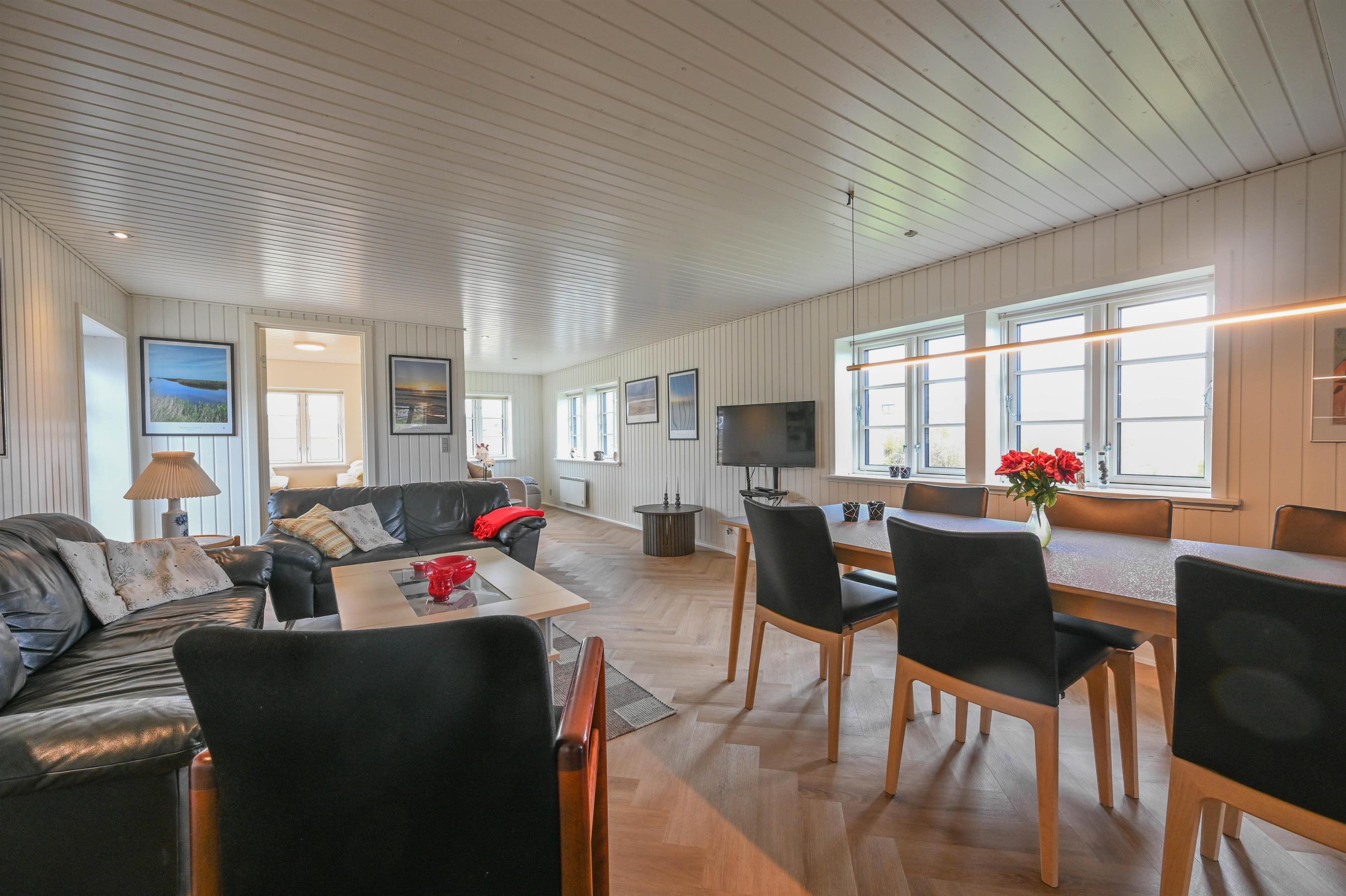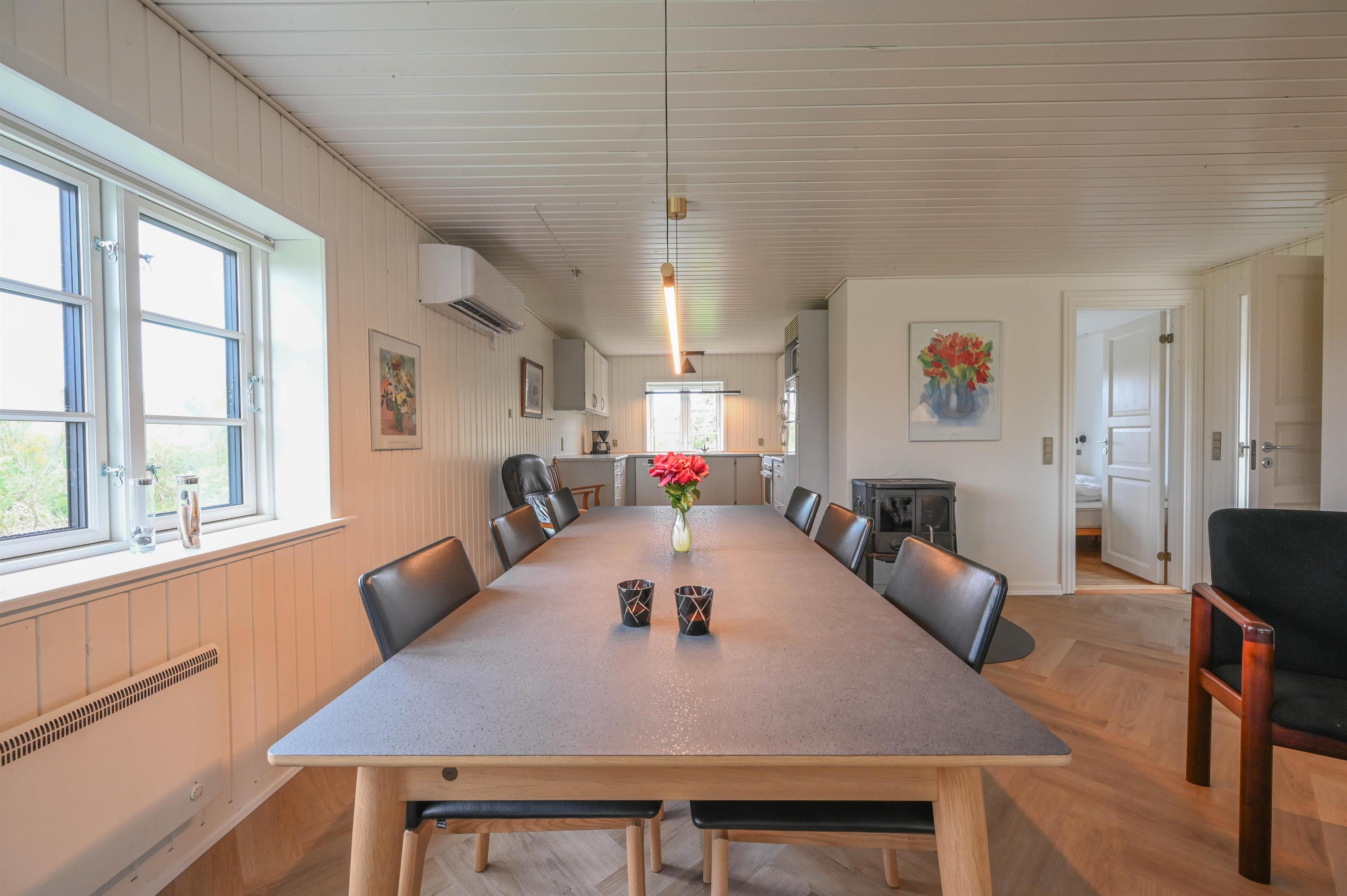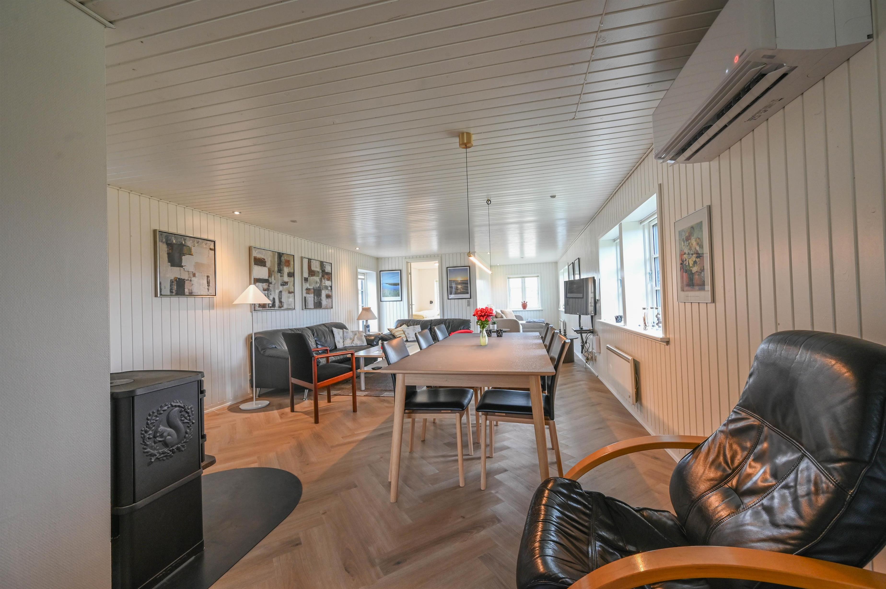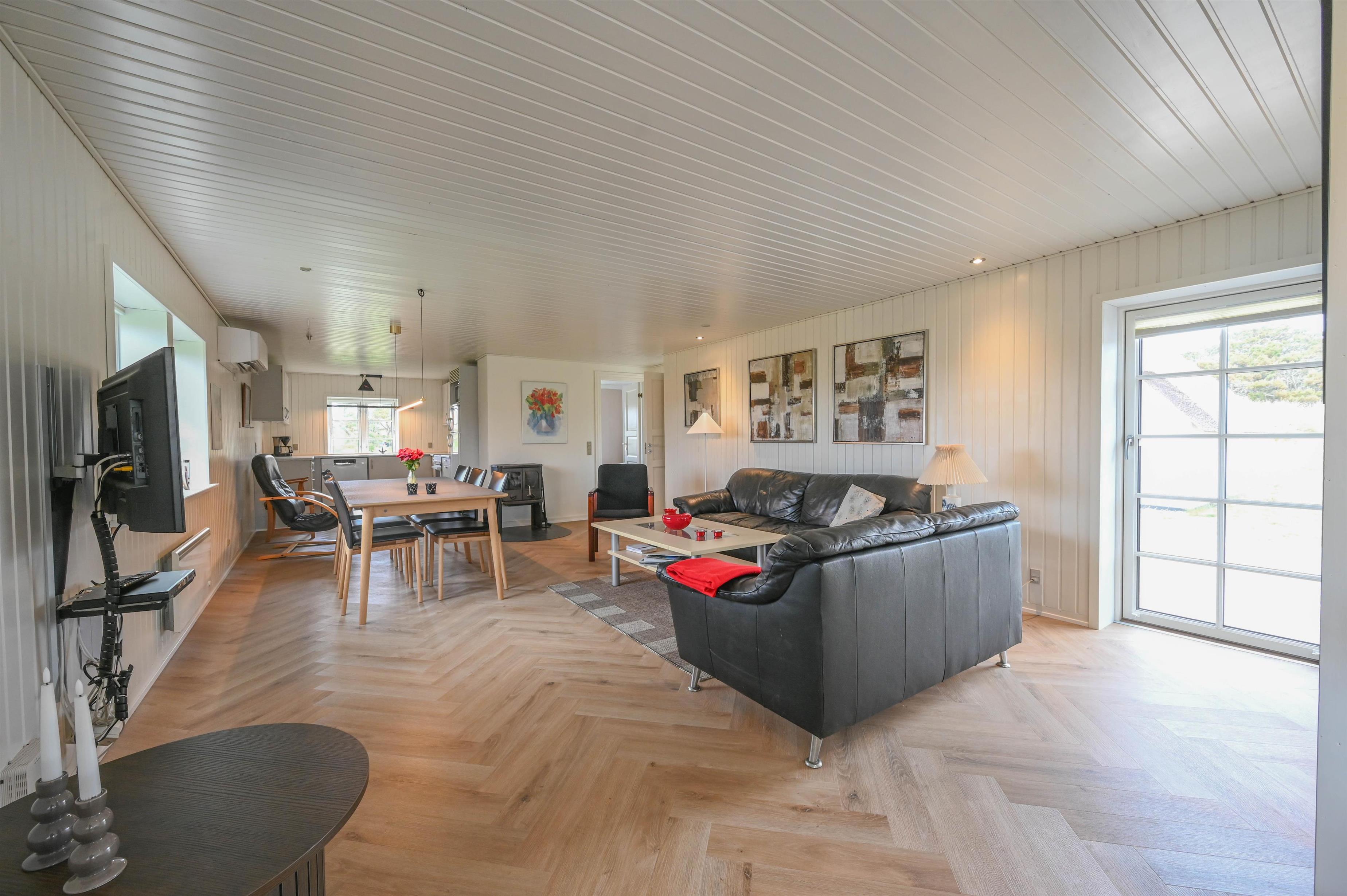 Det åbne køkkenalrum danner hjertet i huset – med spiseplads, sofaområde og en hyggelig brændeovn, der spreder varme og stemning, når vinden rusker udenfor. Herfra er der udgang til en dejlig terrasse med udsigt mod klitterne – et ideelt sted at nyde morgensolen eller dagens sidste lys.