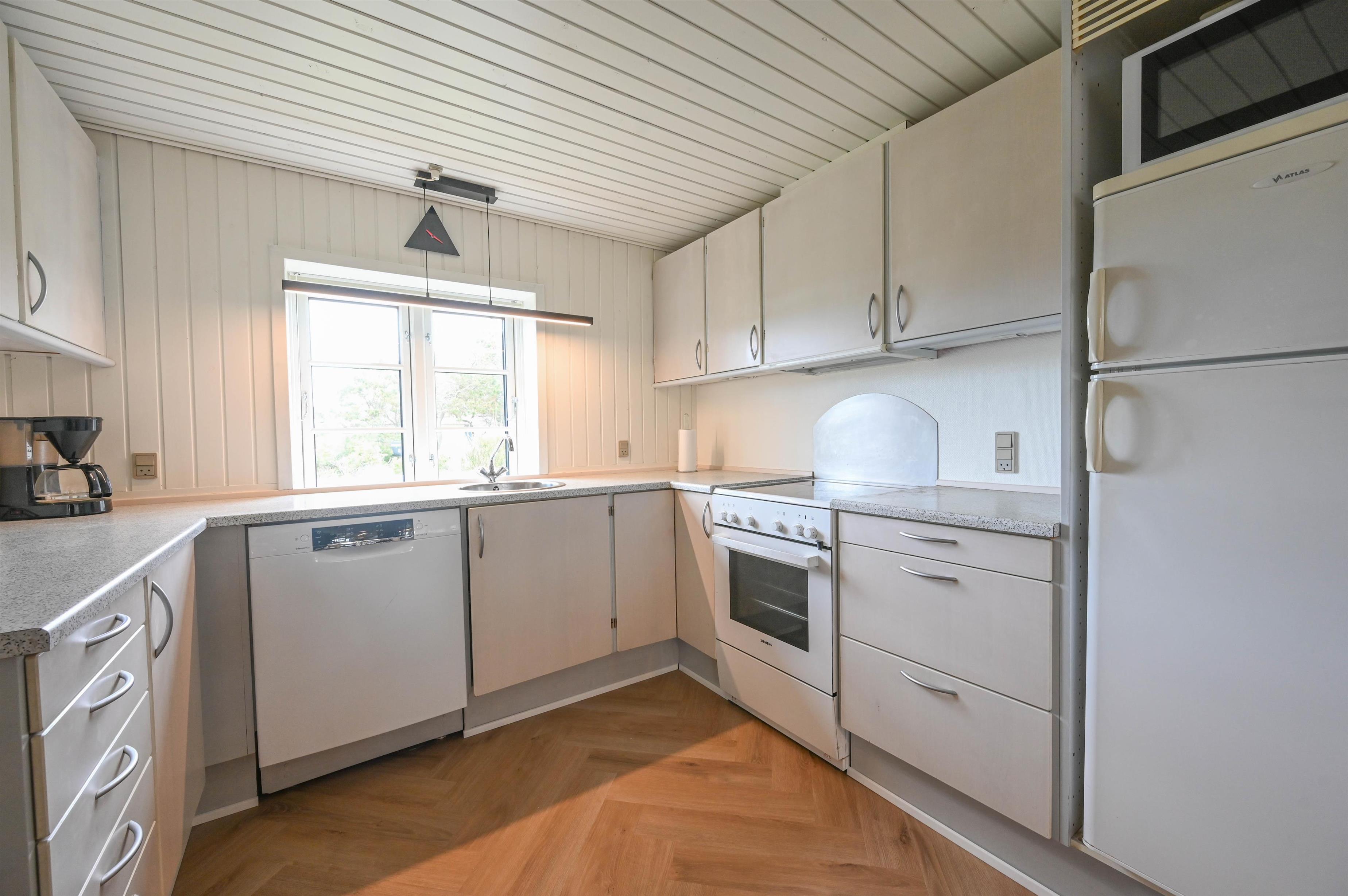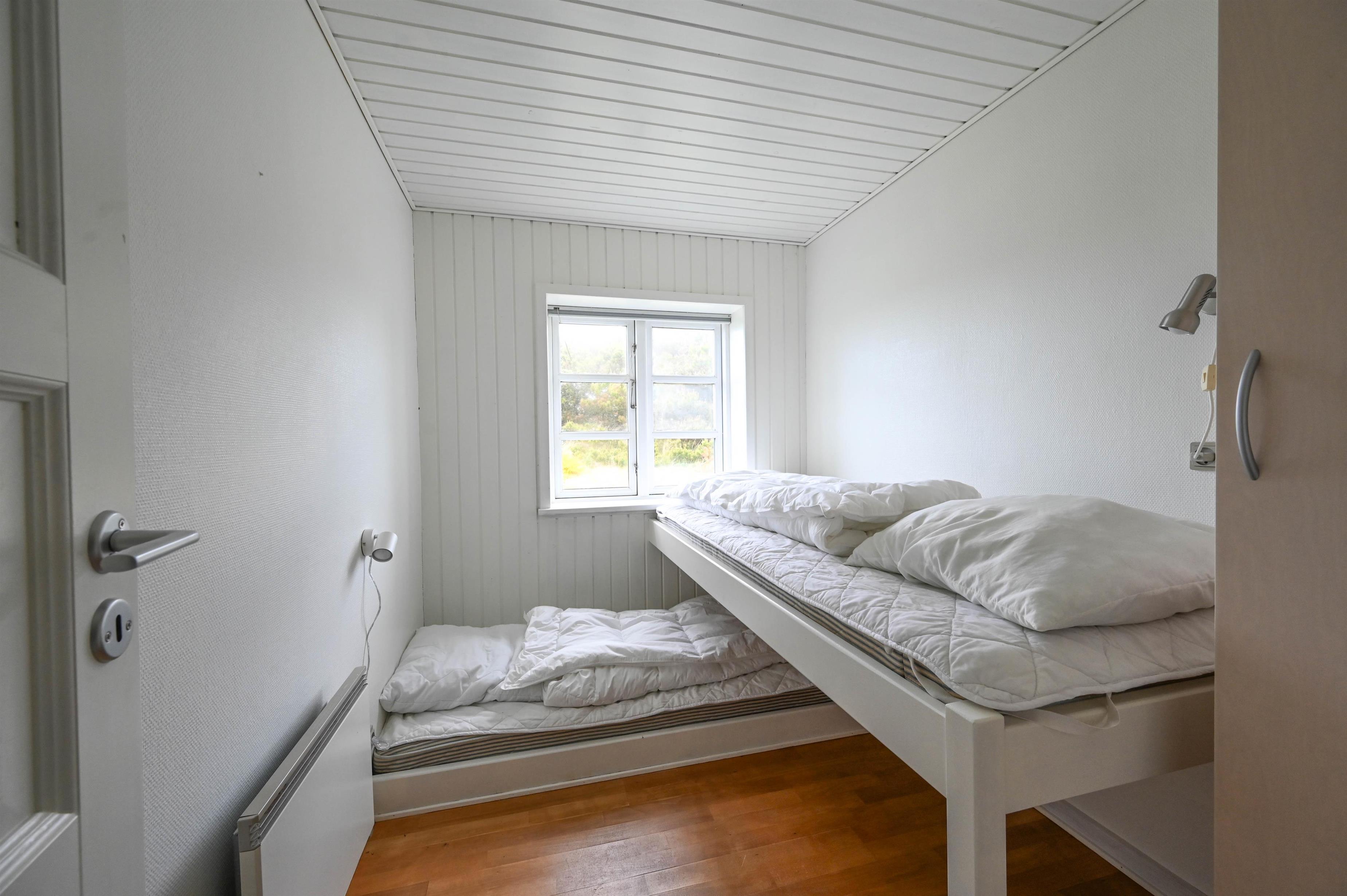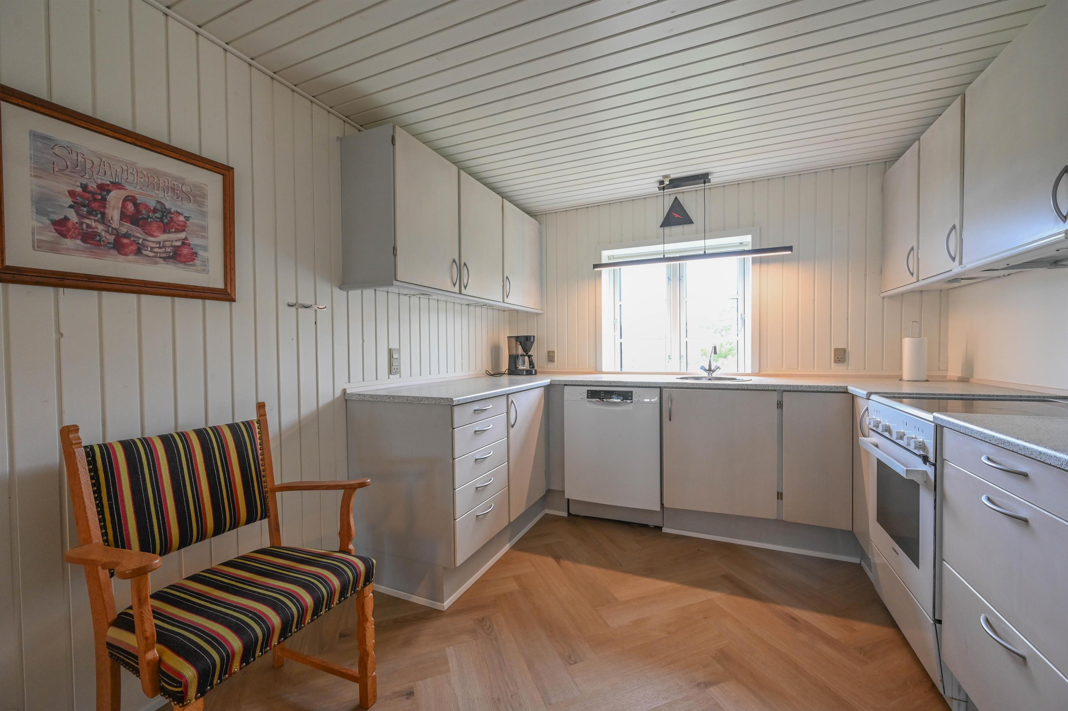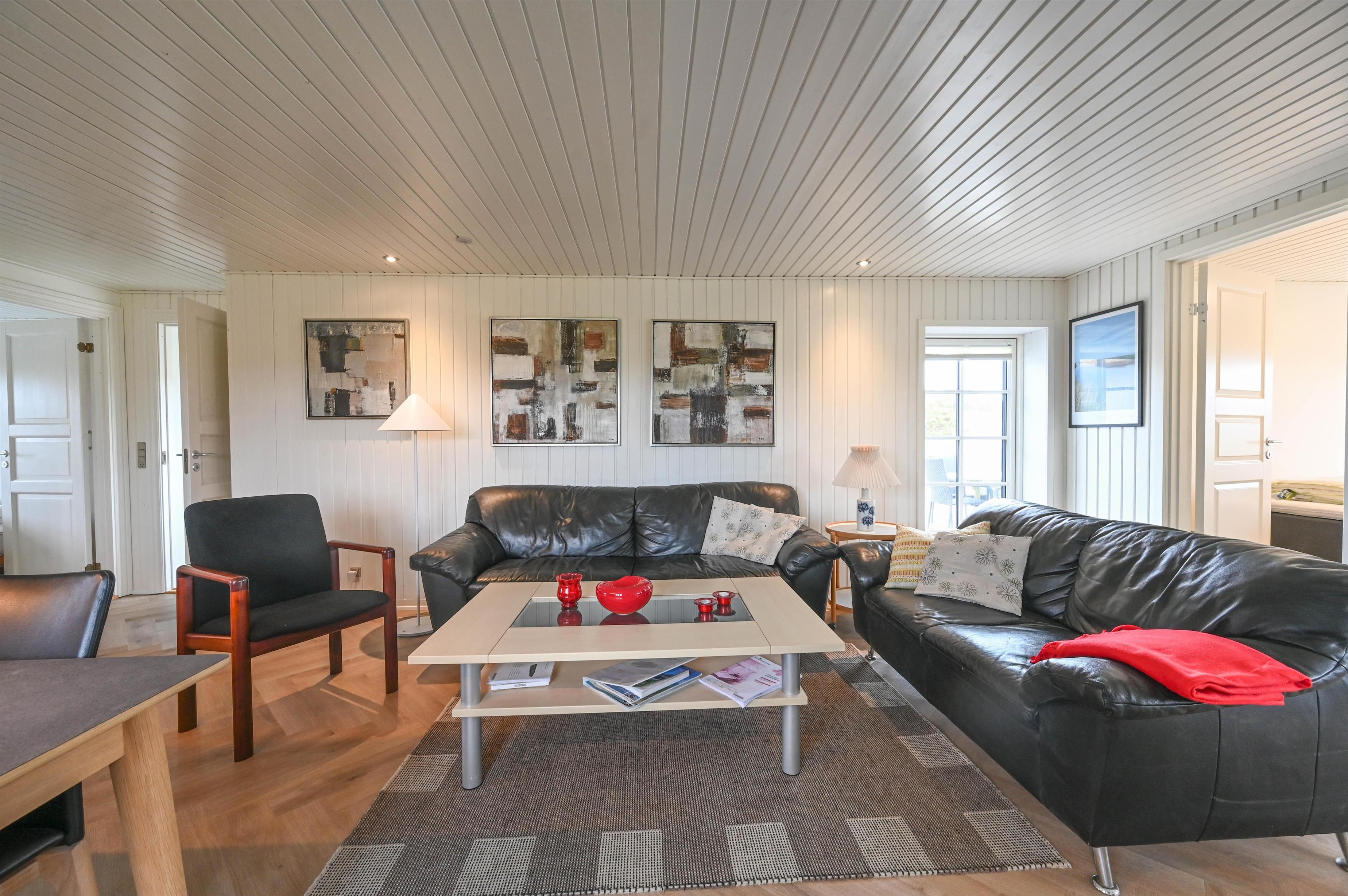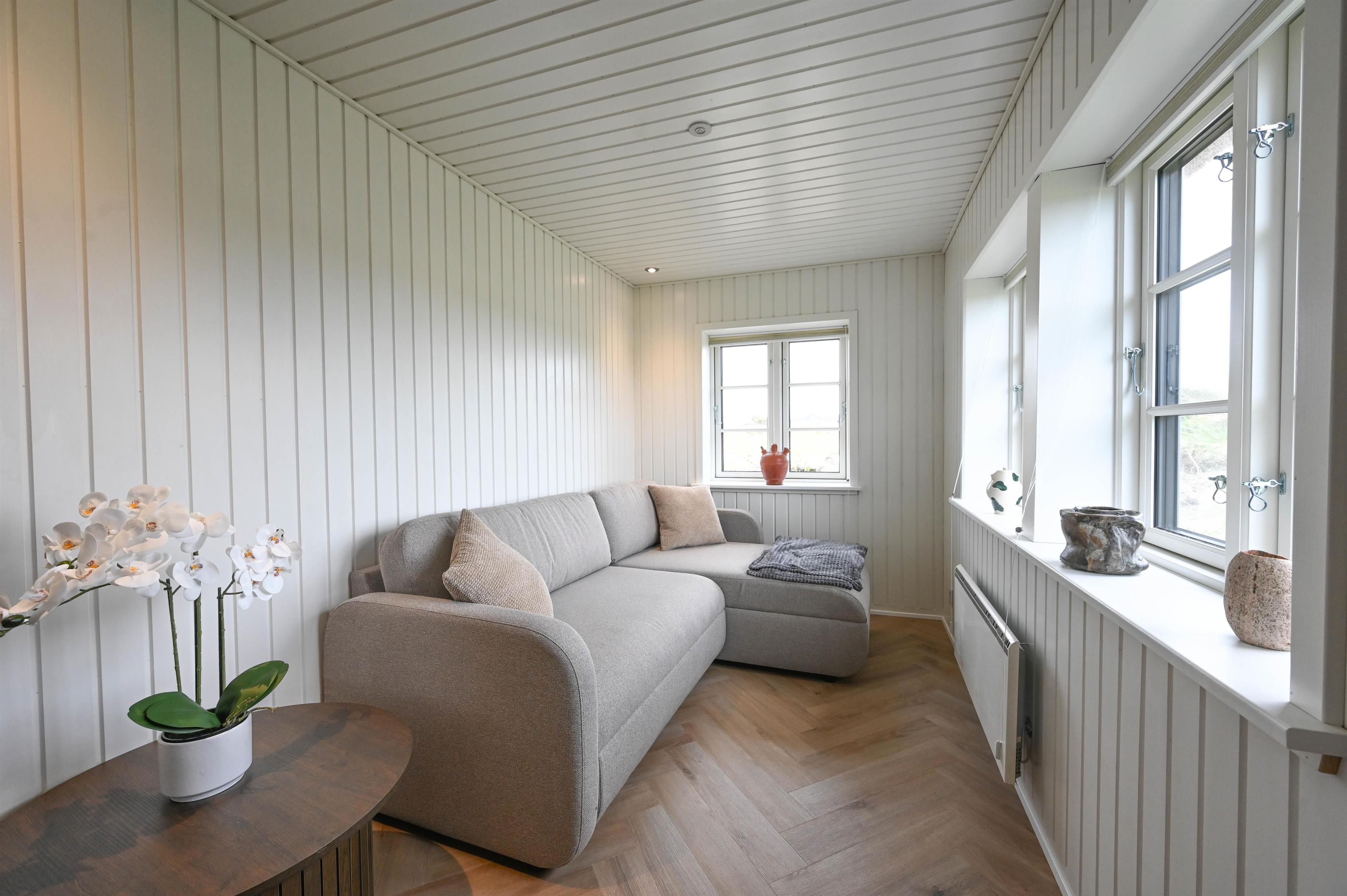 Det åbne køkkenalrum danner hjertet i huset – med spiseplads, sofaområde og en hyggelig brændeovn, der spreder varme og stemning, når vinden rusker udenfor. Herfra er der udgang til en dejlig terrasse med udsigt mod klitterne – et ideelt sted at nyde morgensolen eller dagens sidste lys.