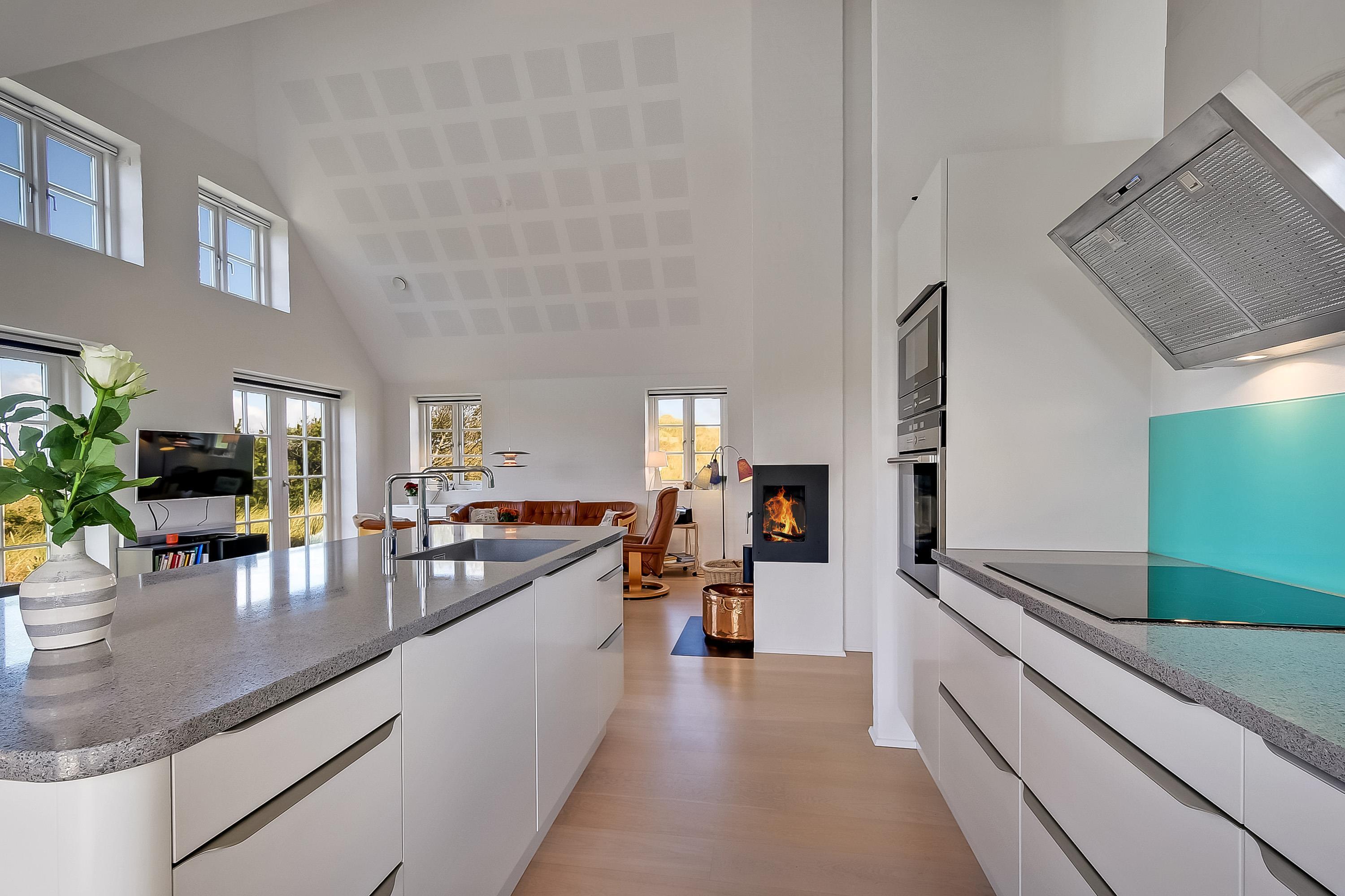 Åbent køkken i forbindelse med stuen med brændeovn og flot udsigt