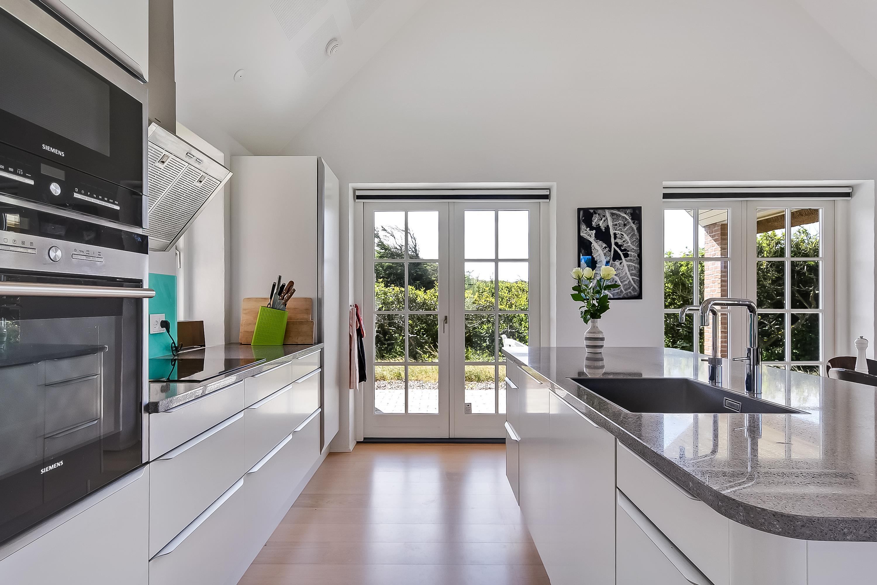Køkkenet ligger i åben forbindelse med den store stue, hvor brændeovnen og den smukke udsigt til klitterne danner rammen om hyggelige stunder – uanset årstid.