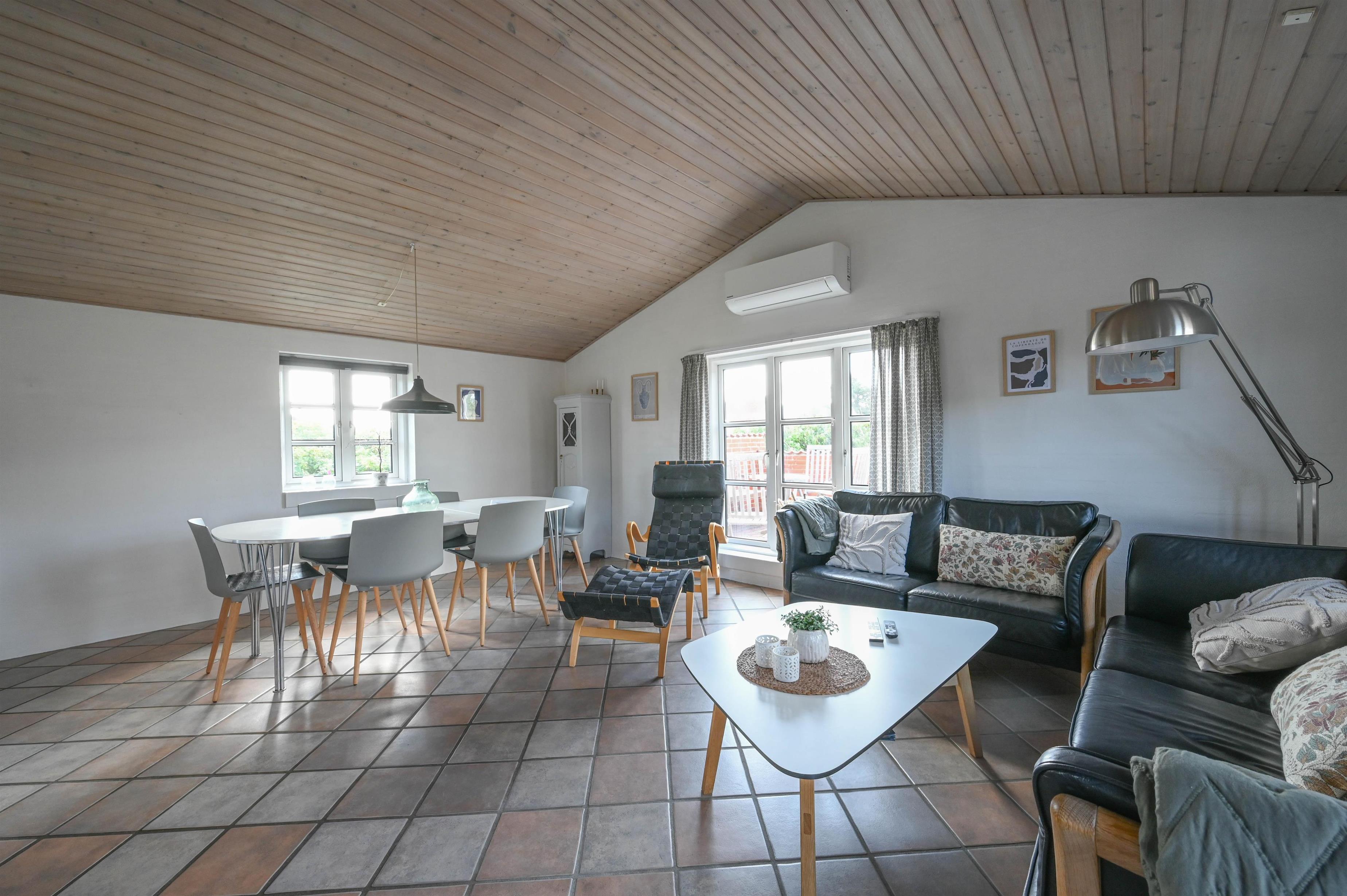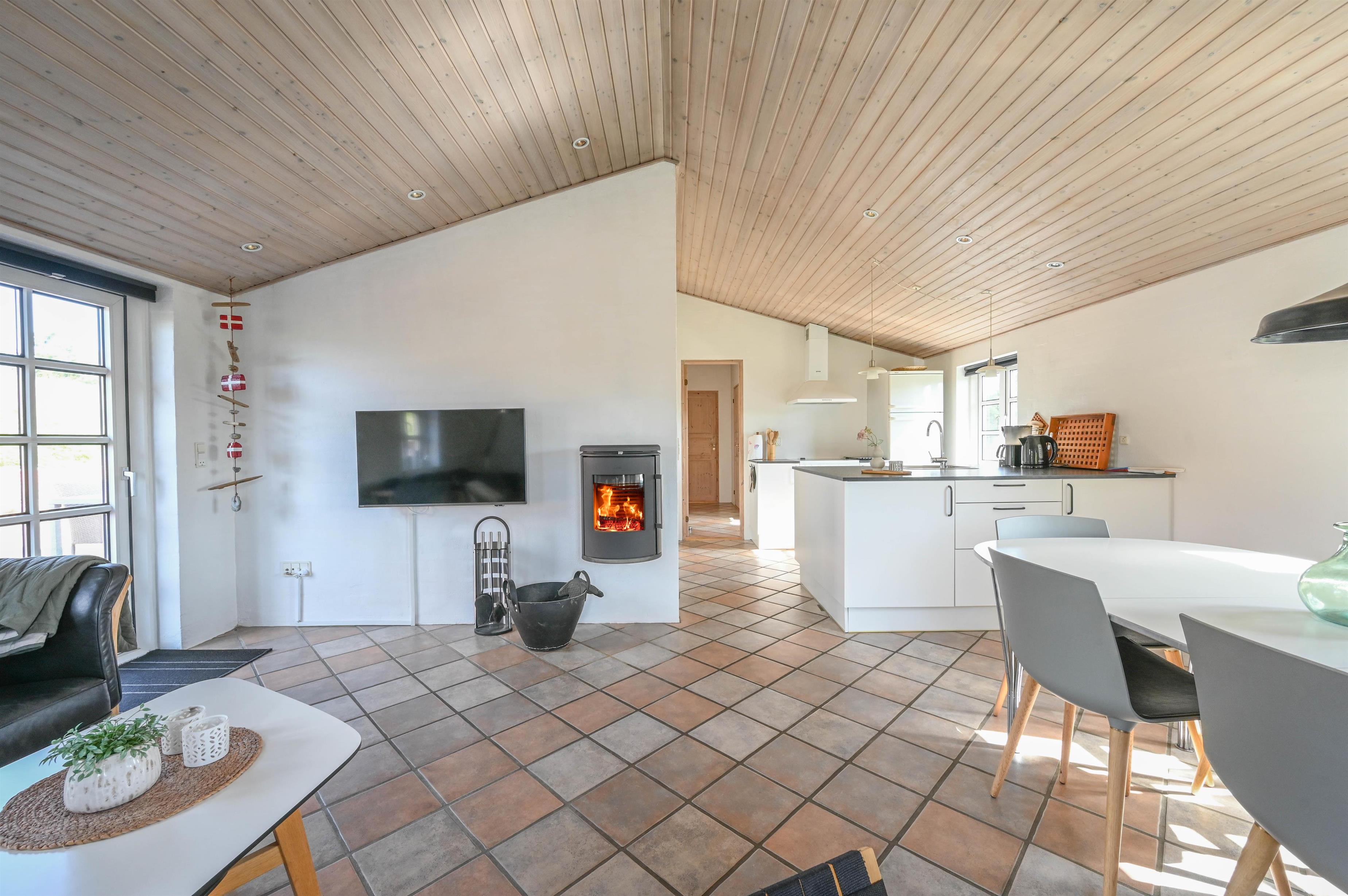 Indenfor byder huset på en lys, hyggelig og smagfuldt indrettet stue i åben forbindelse med køkkenet. Her skaber klinkegulve, brændeovn og behagelig indretning en varm og indbydende atmosfære – ideelt til både rolige aftener og hyggelige familiestunder.