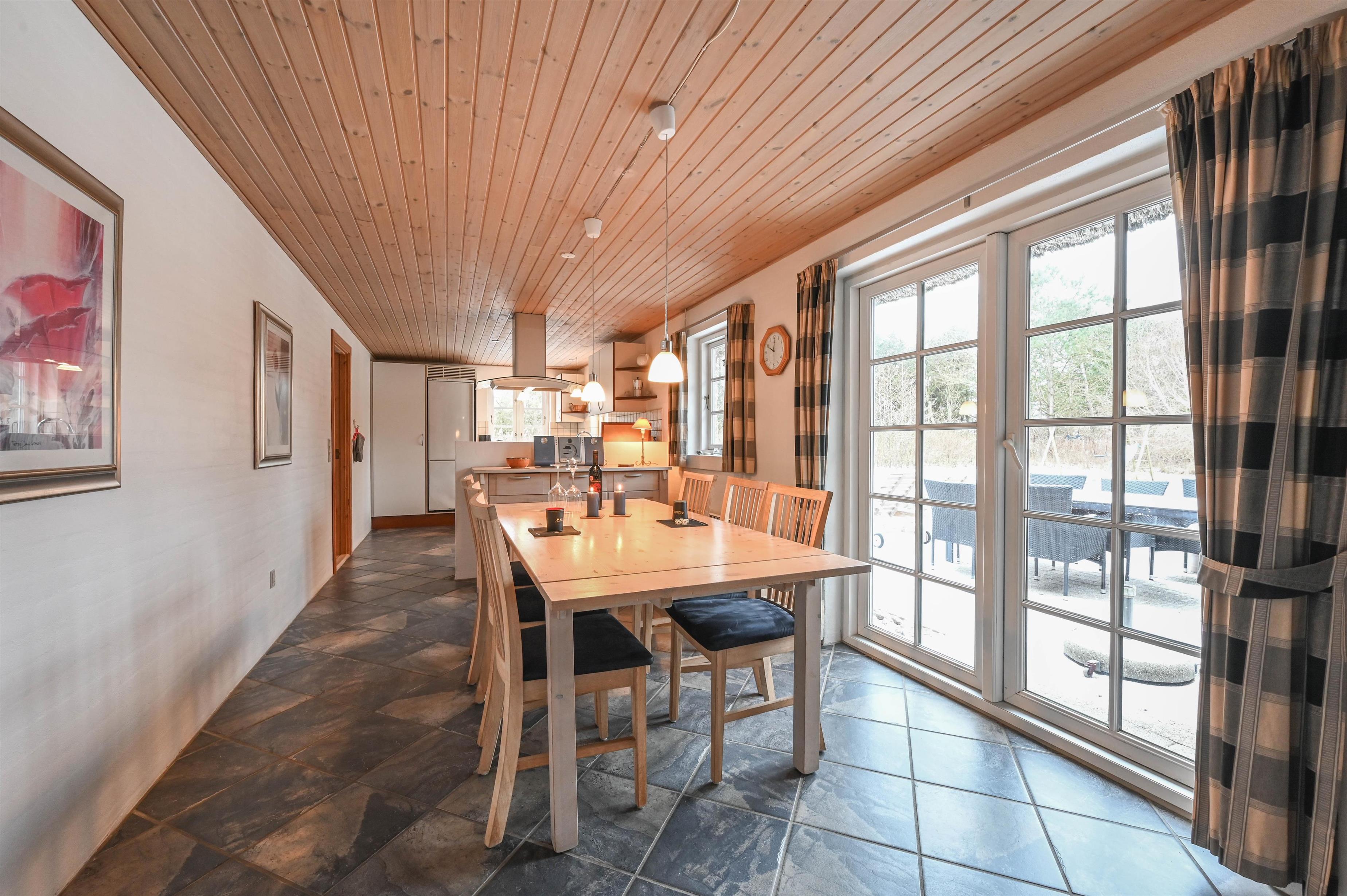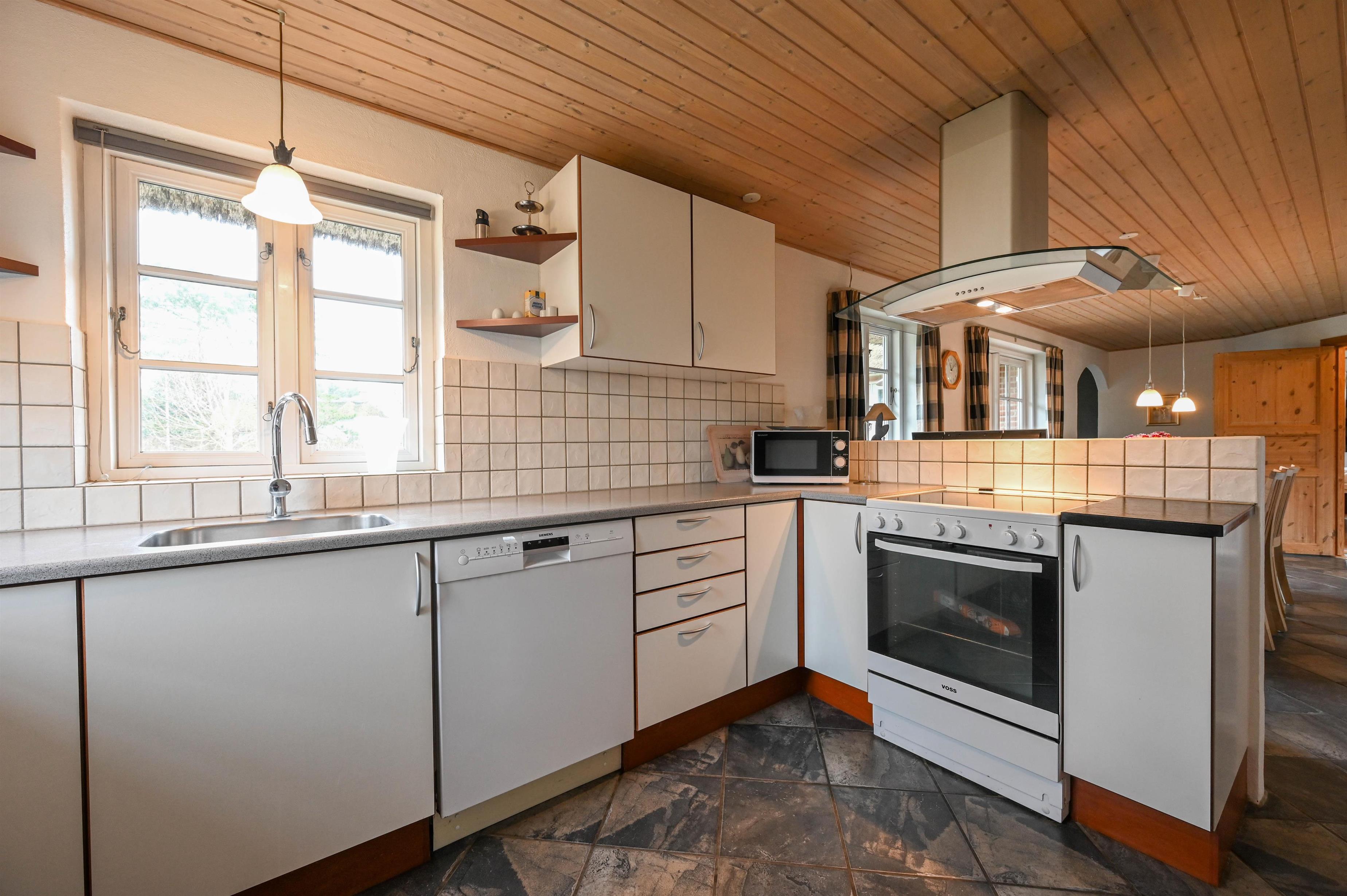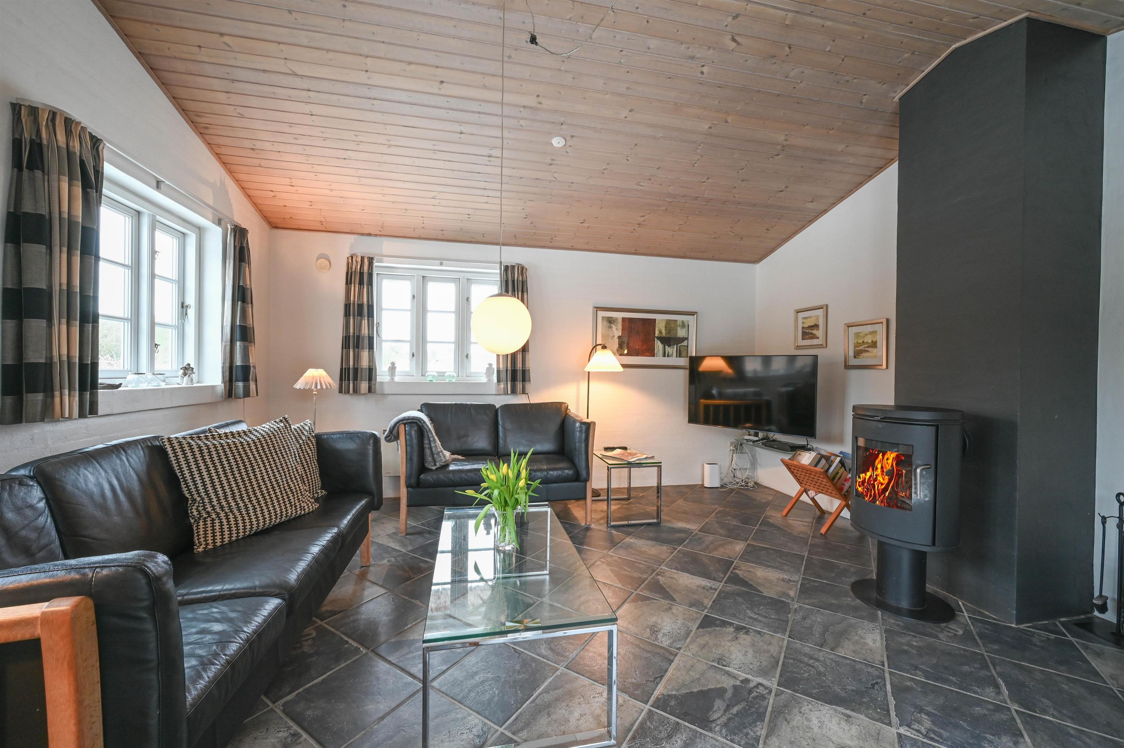 Det moderne køkken er åbent mod stuen, så der er god plads til samvær, madlavning og hyggelige aftener foran ilden.