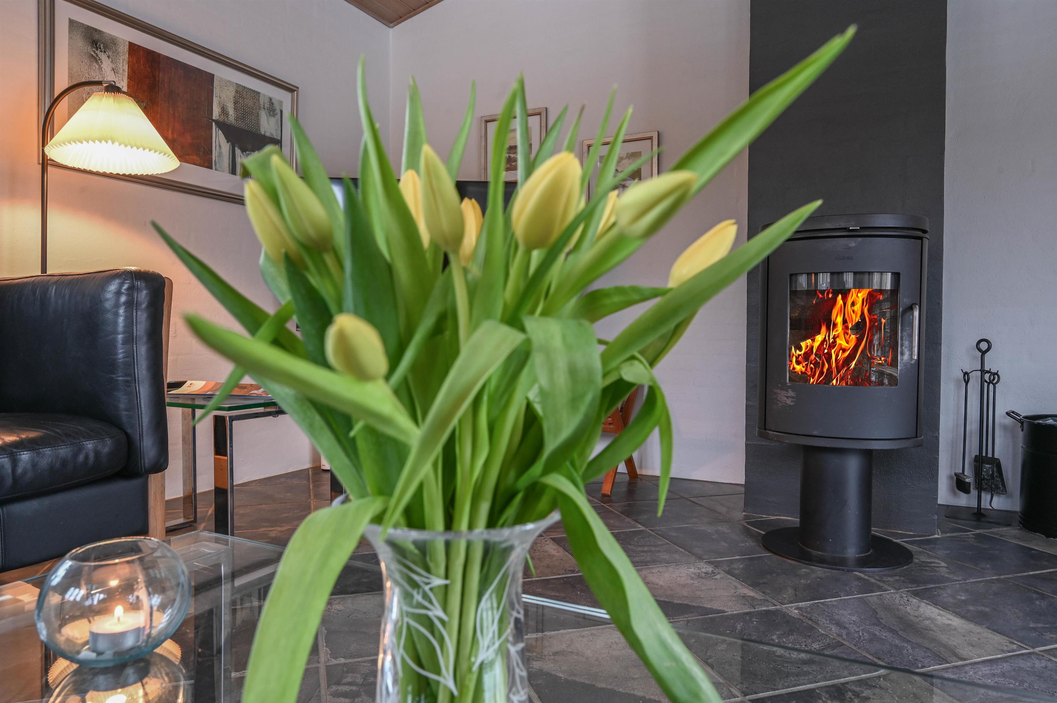 Klinkegulve i opholdsrummene giver en behagelig og praktisk base, mens de lyse farver og den hyggelige brændeovn skaber en afslappet atmosfære.