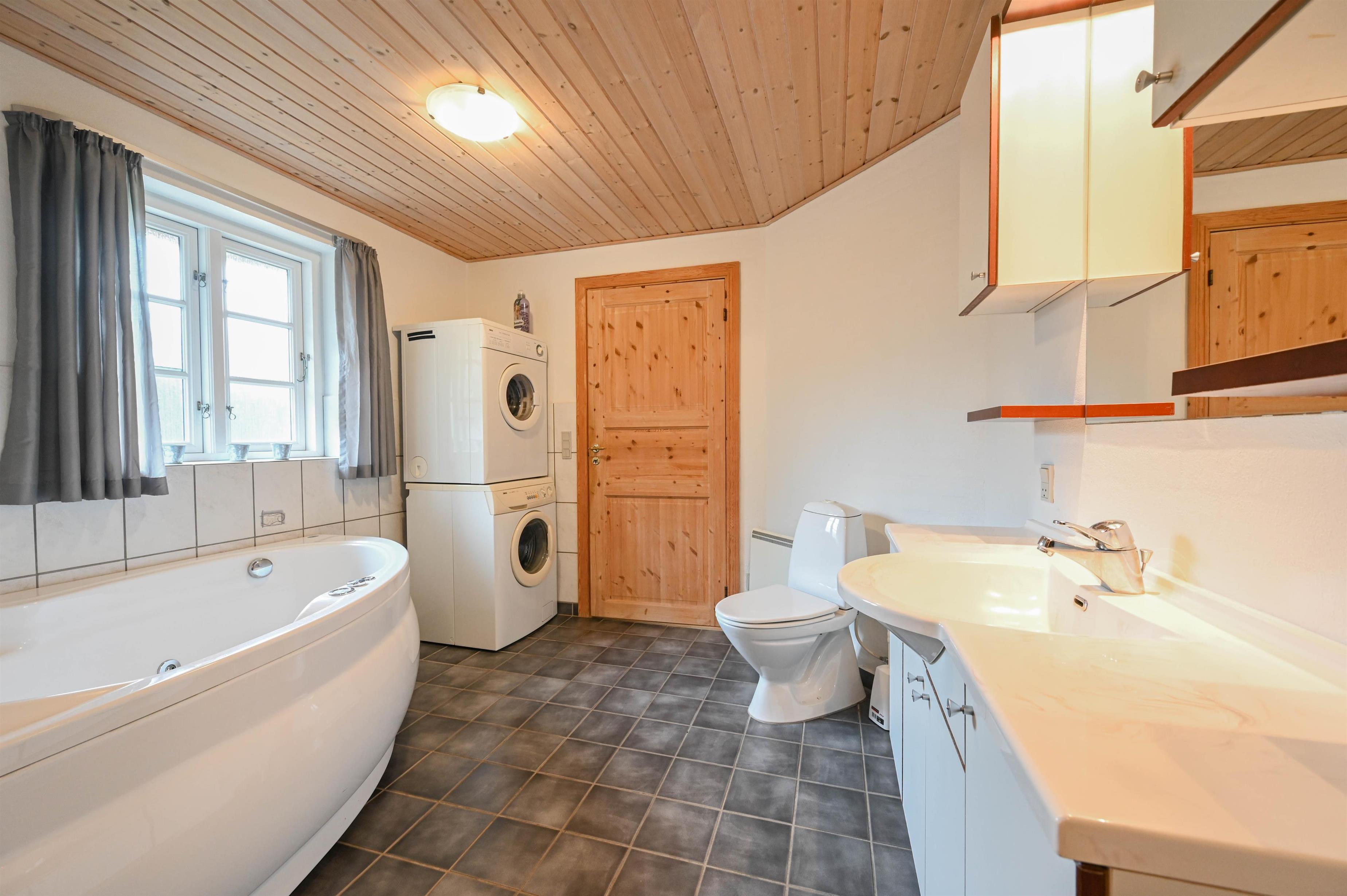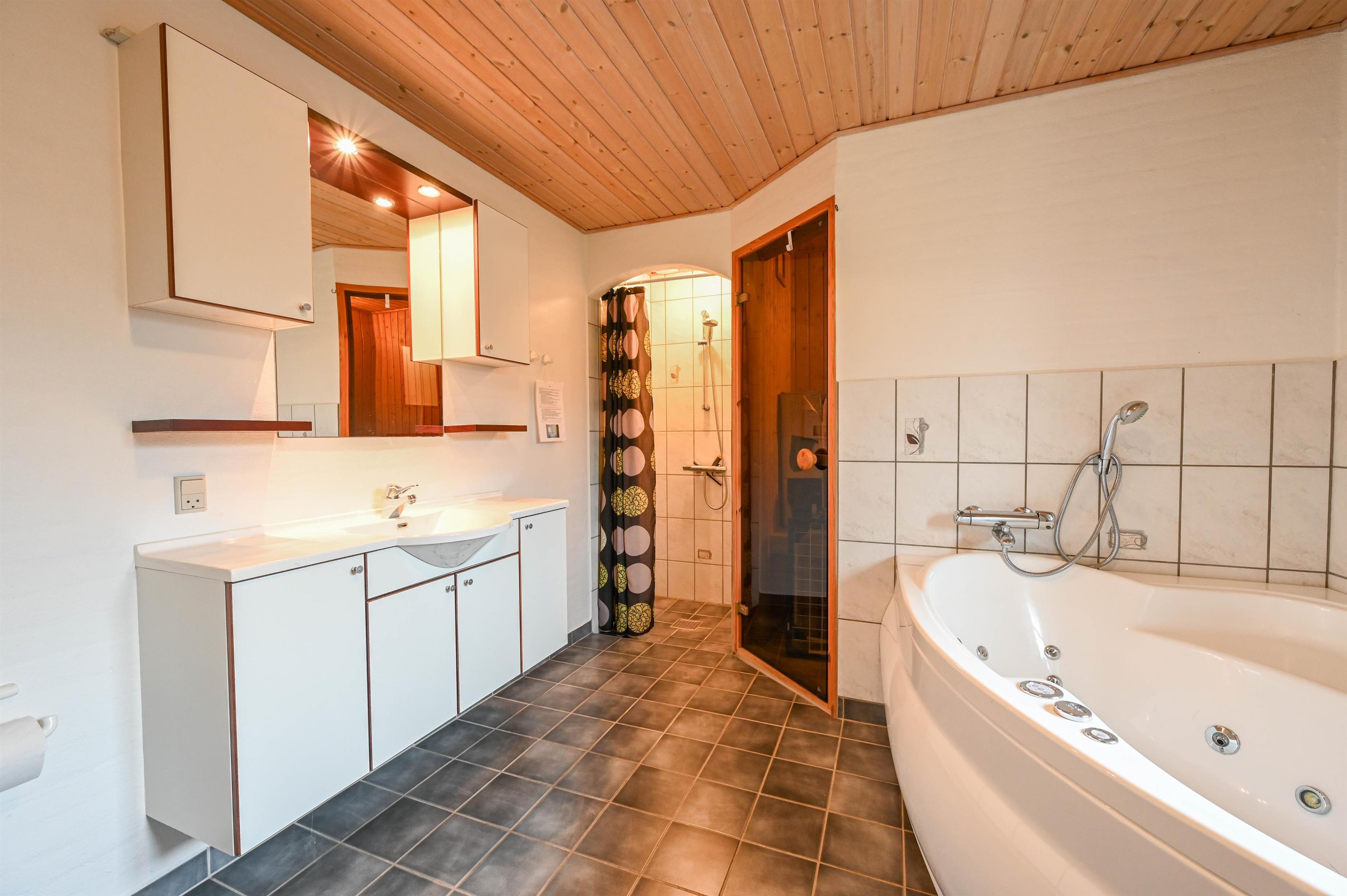 Flot badeværelse med spabad, sauna, bruser og gulvvarme