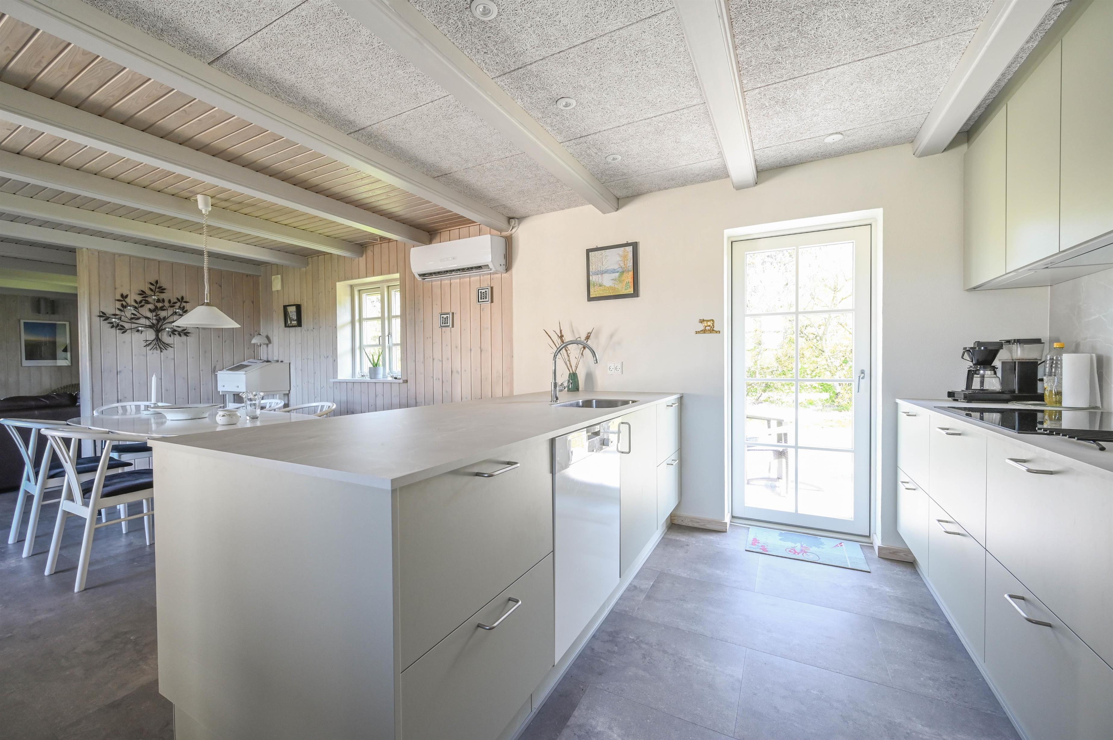 Åbent køkken med opvaskemaskine og spiseplads i forbindelse med stuen