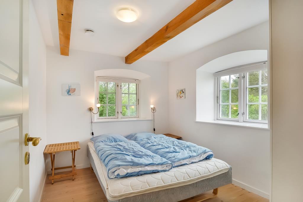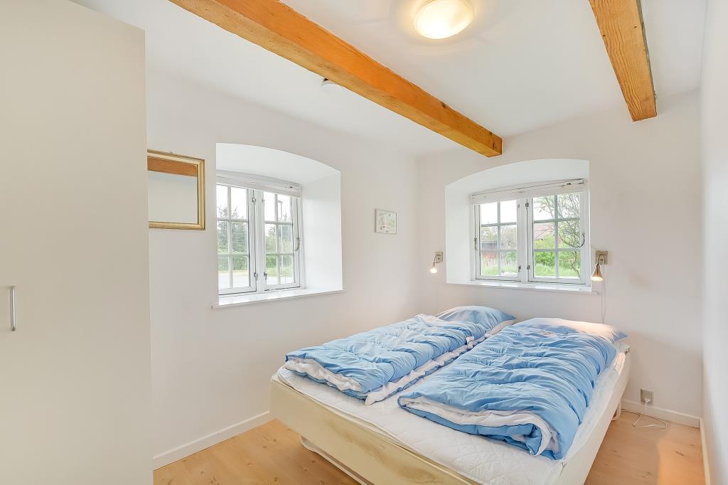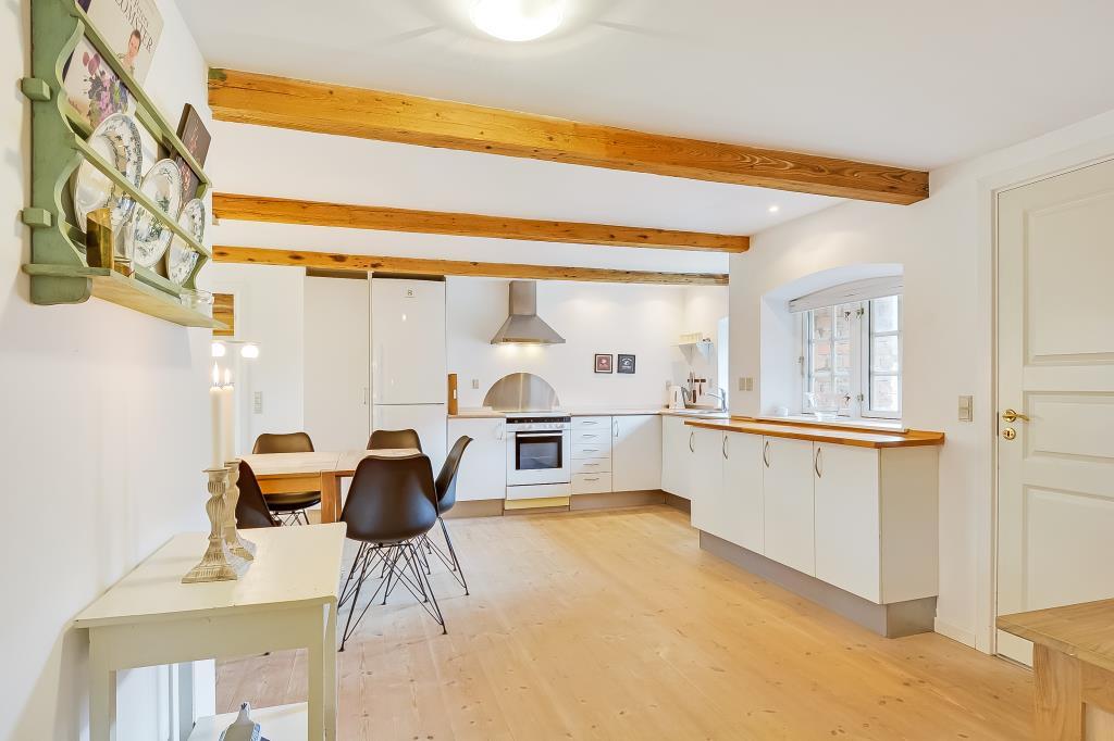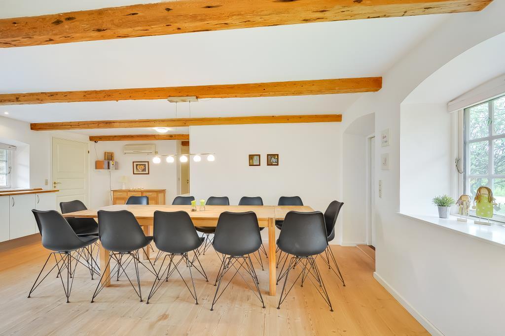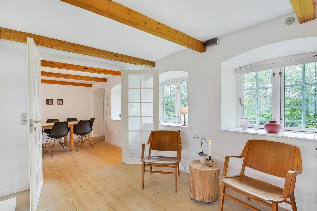 Huset er nænsomt istandsat med respekt for den oprindelige stil og sjæl. De synlige bjælker, de brede trægulve og de lyse rum skaber en varm og indbydende atmosfære, hvor man straks føler sig hjemme.