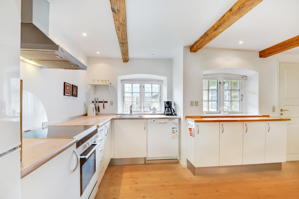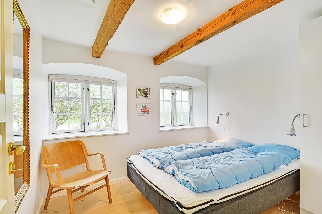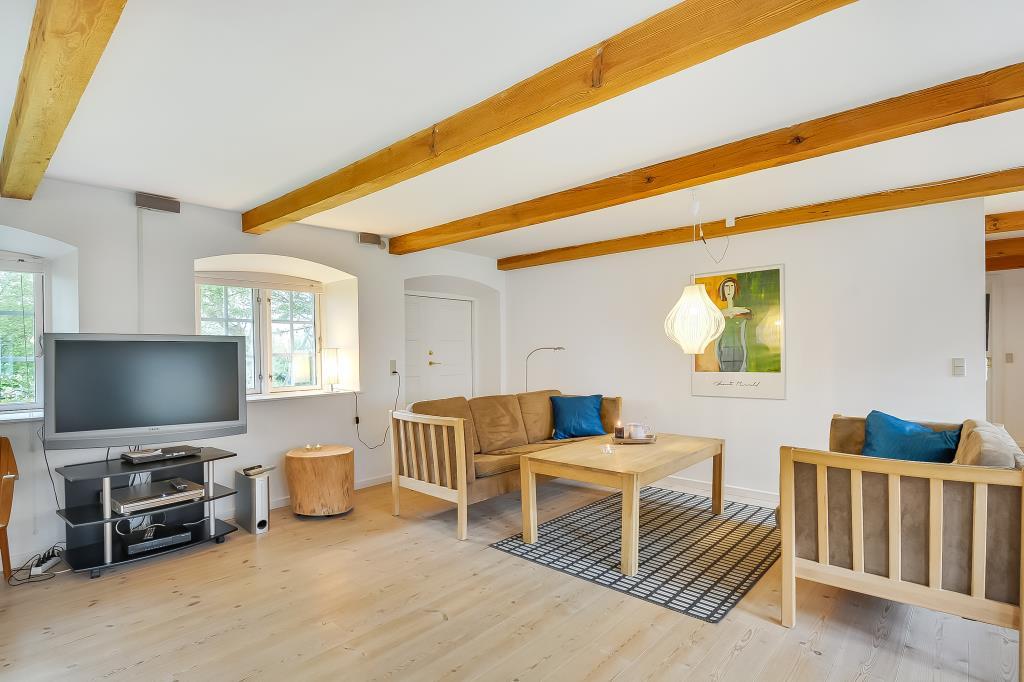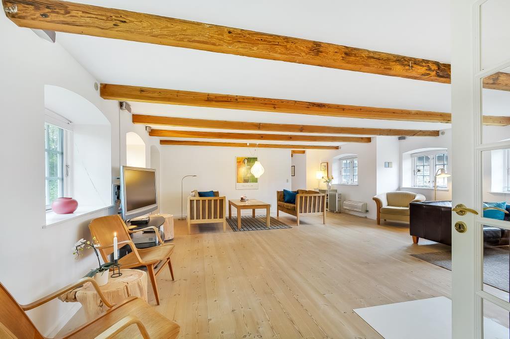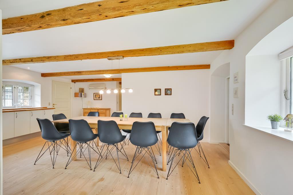 Huset er nænsomt istandsat med respekt for den oprindelige stil og sjæl. De synlige bjælker, de brede trægulve og de lyse rum skaber en varm og indbydende atmosfære, hvor man straks føler sig hjemme.