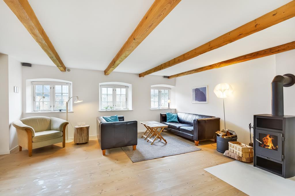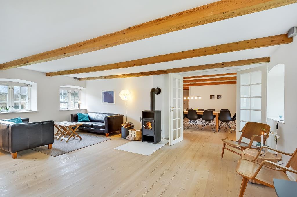Den store stue har to hyggelige siddeområder og en brændeovn, der spreder varme og stemning på kølige dage.
