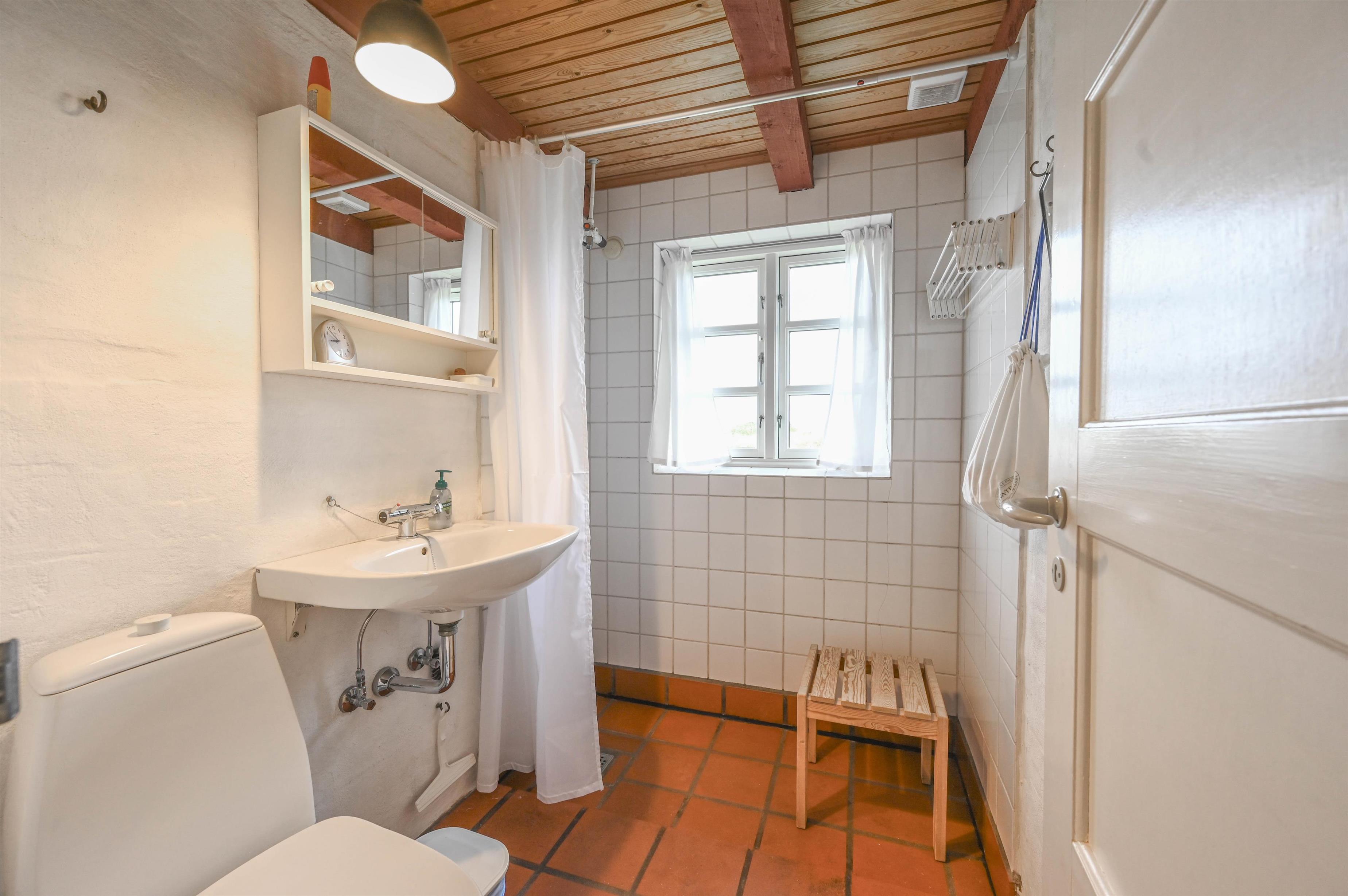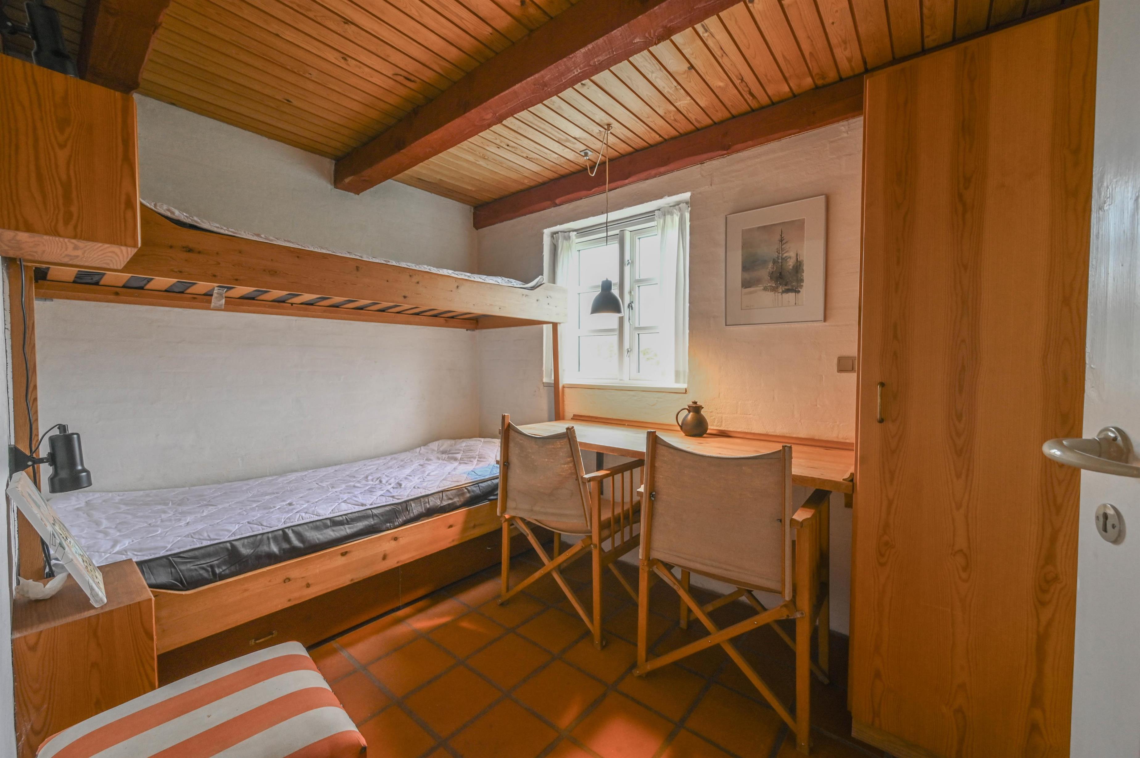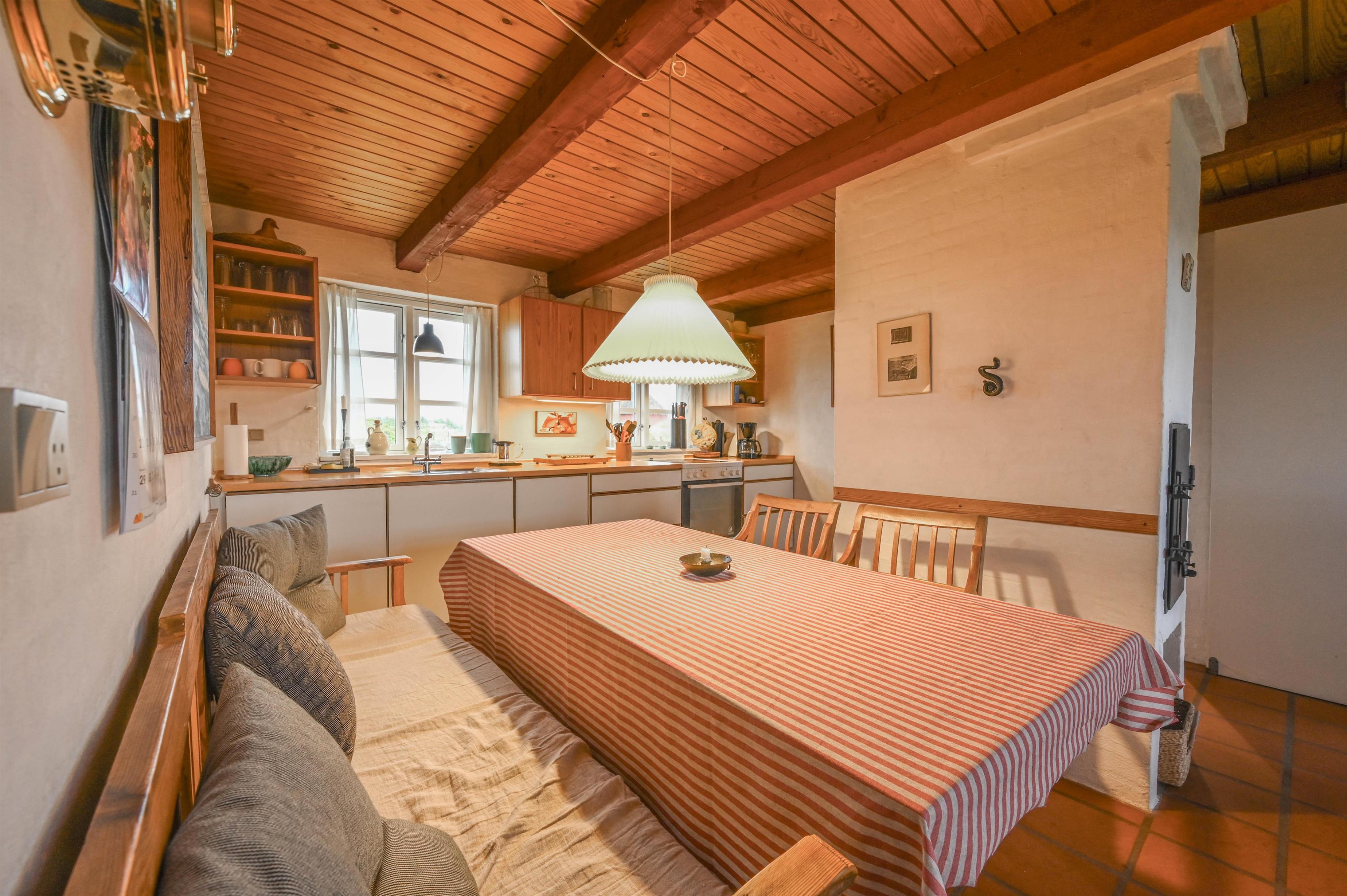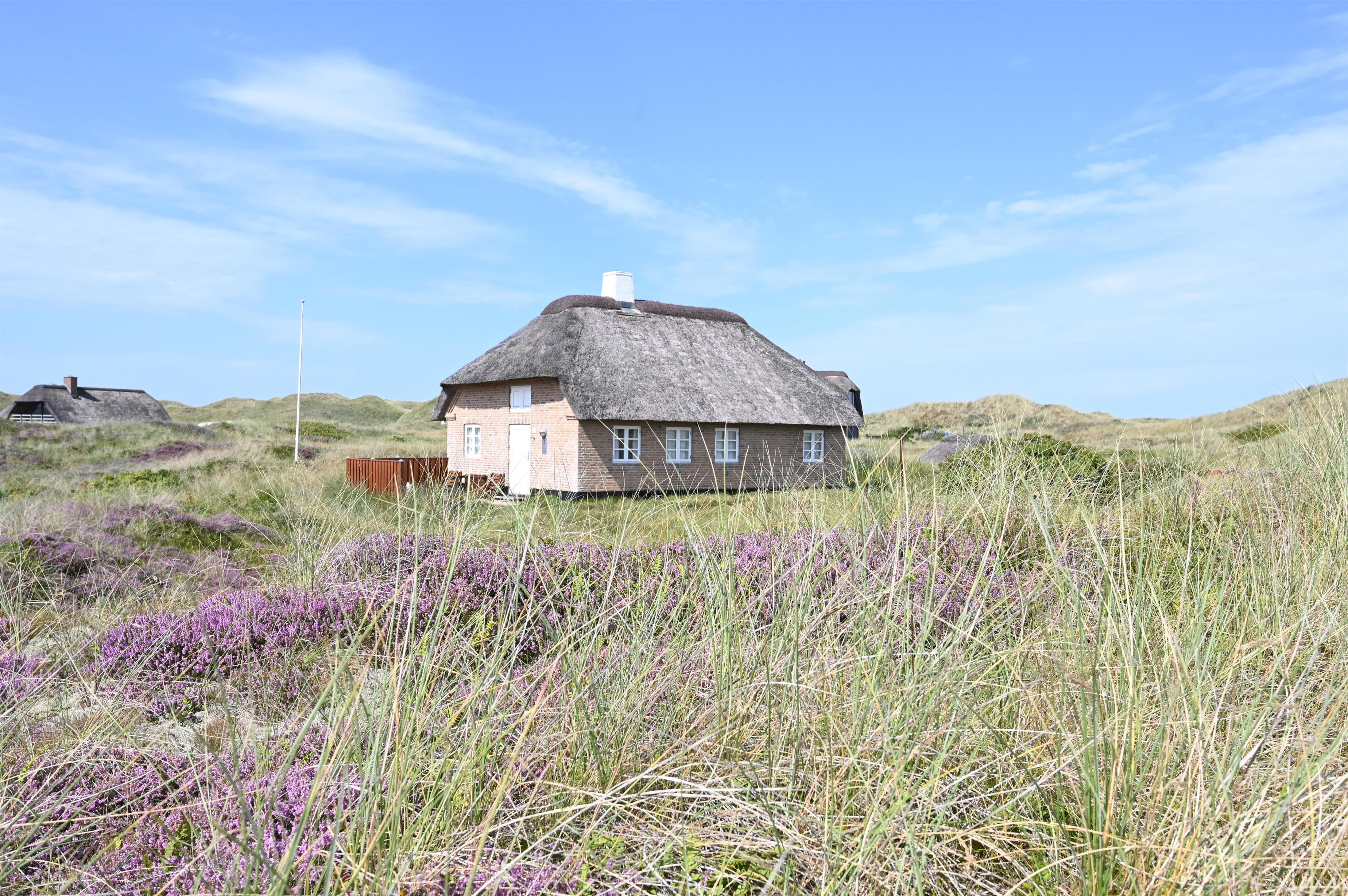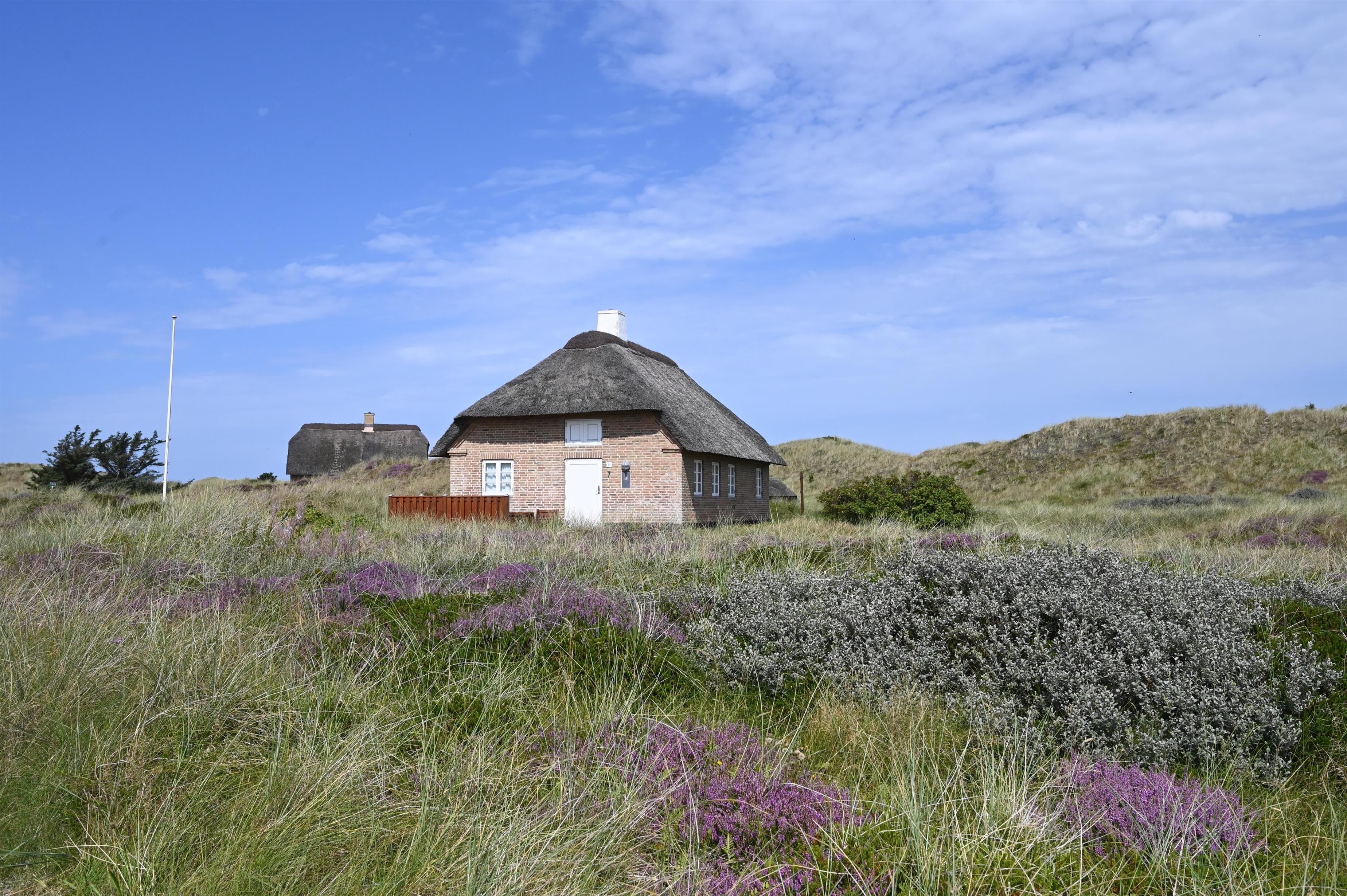 Huset, der er bygget i røde mursten og med et smukt stråtag, minder om de traditionelle vestkystklitgårde og tilføjer en autentisk charme til området. De synlige bjælker og murstensgulve giver huset en rustik og hyggelig atmosfære, som skaber en helt særlig stemning. Brændeovnen i stuen skaber varme og hygge på de køligere dage, hvilket gør huset til et behageligt sted året rundt.