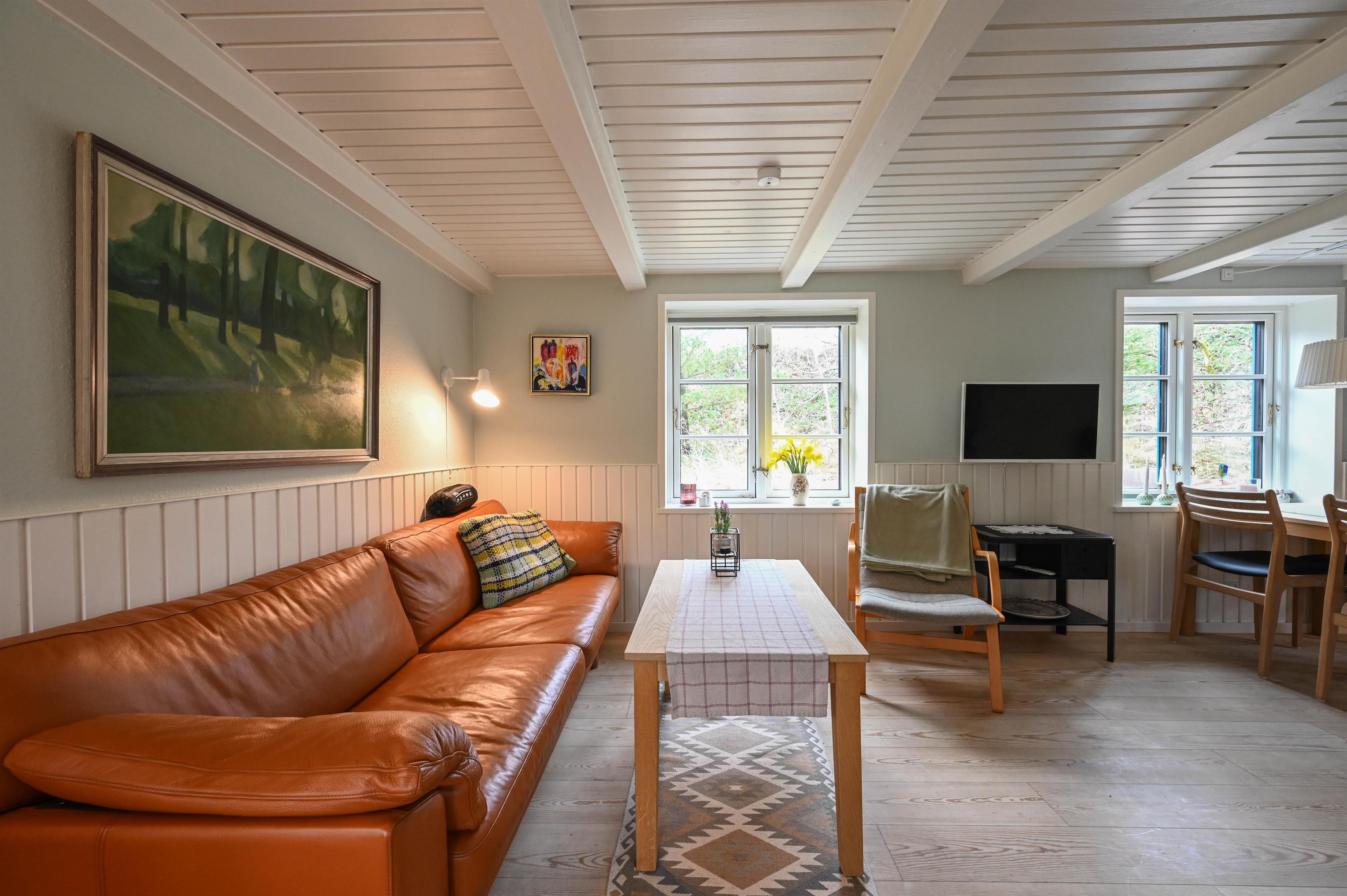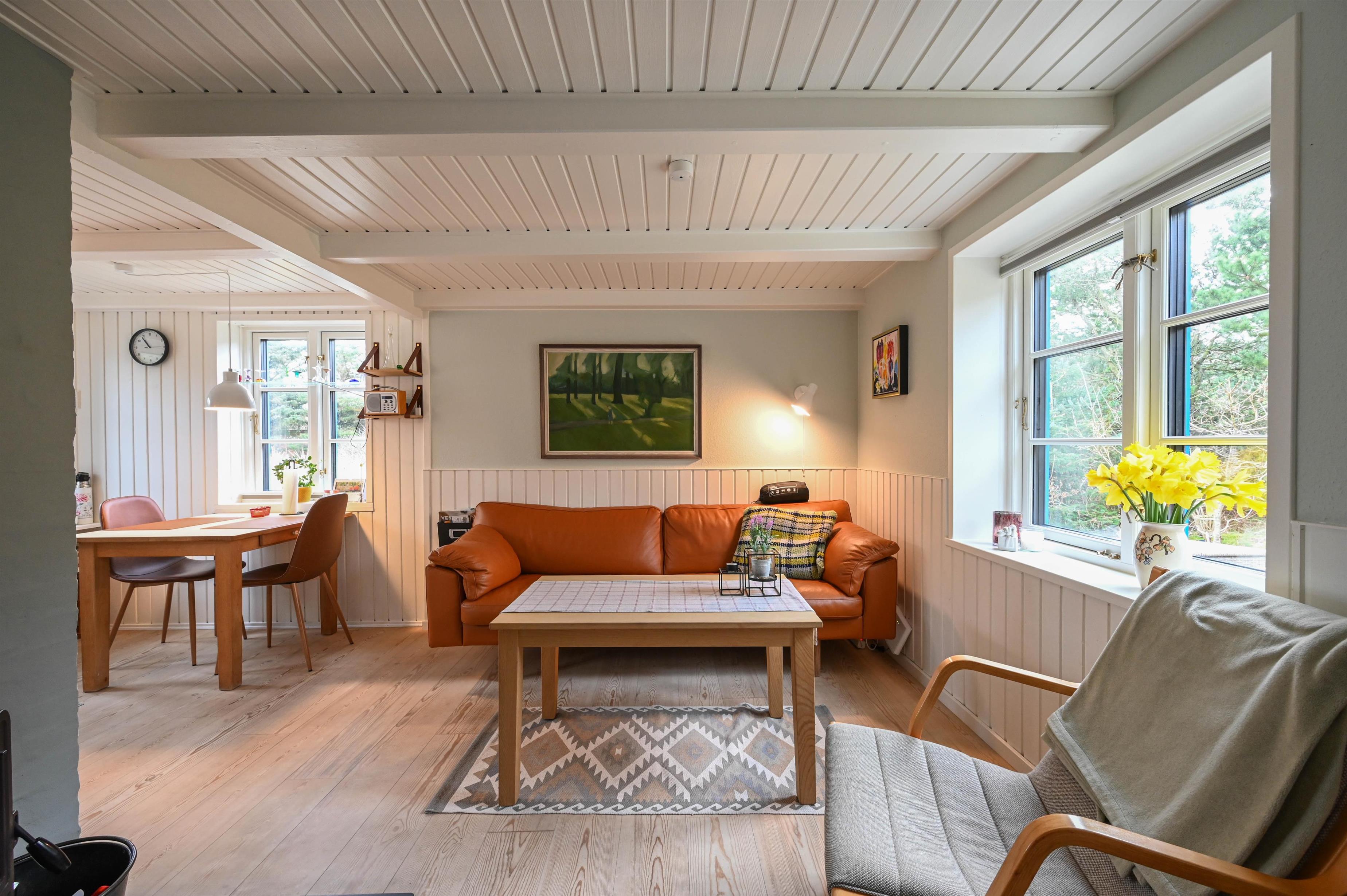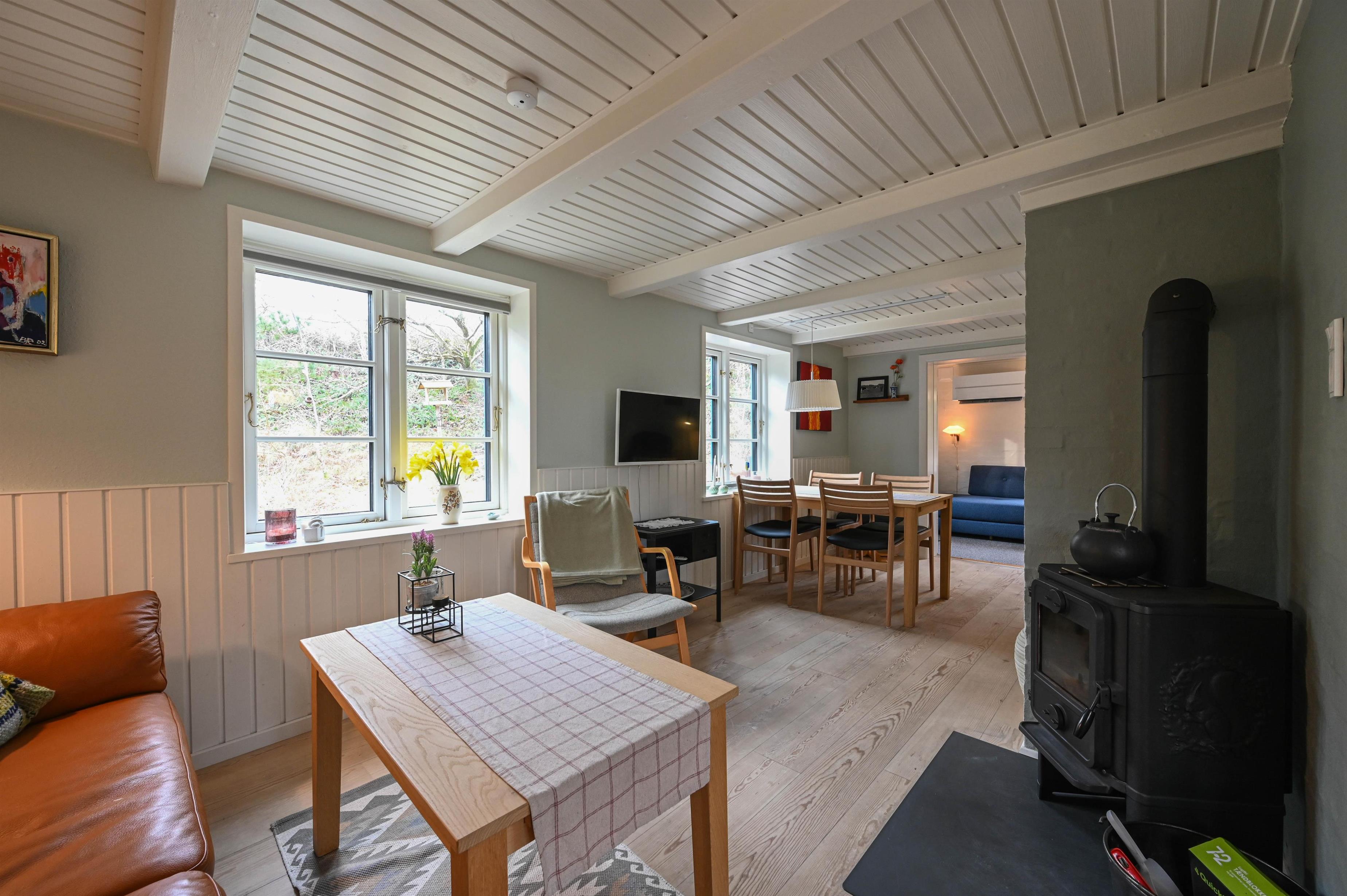 Det hyggelige køkken har spiseplads og ligger i åben forbindelse med den lyse stue, som byder på sofa, lænestole, brændeovn og TV – perfekt til afslapning efter en frisk gåtur ved havet.