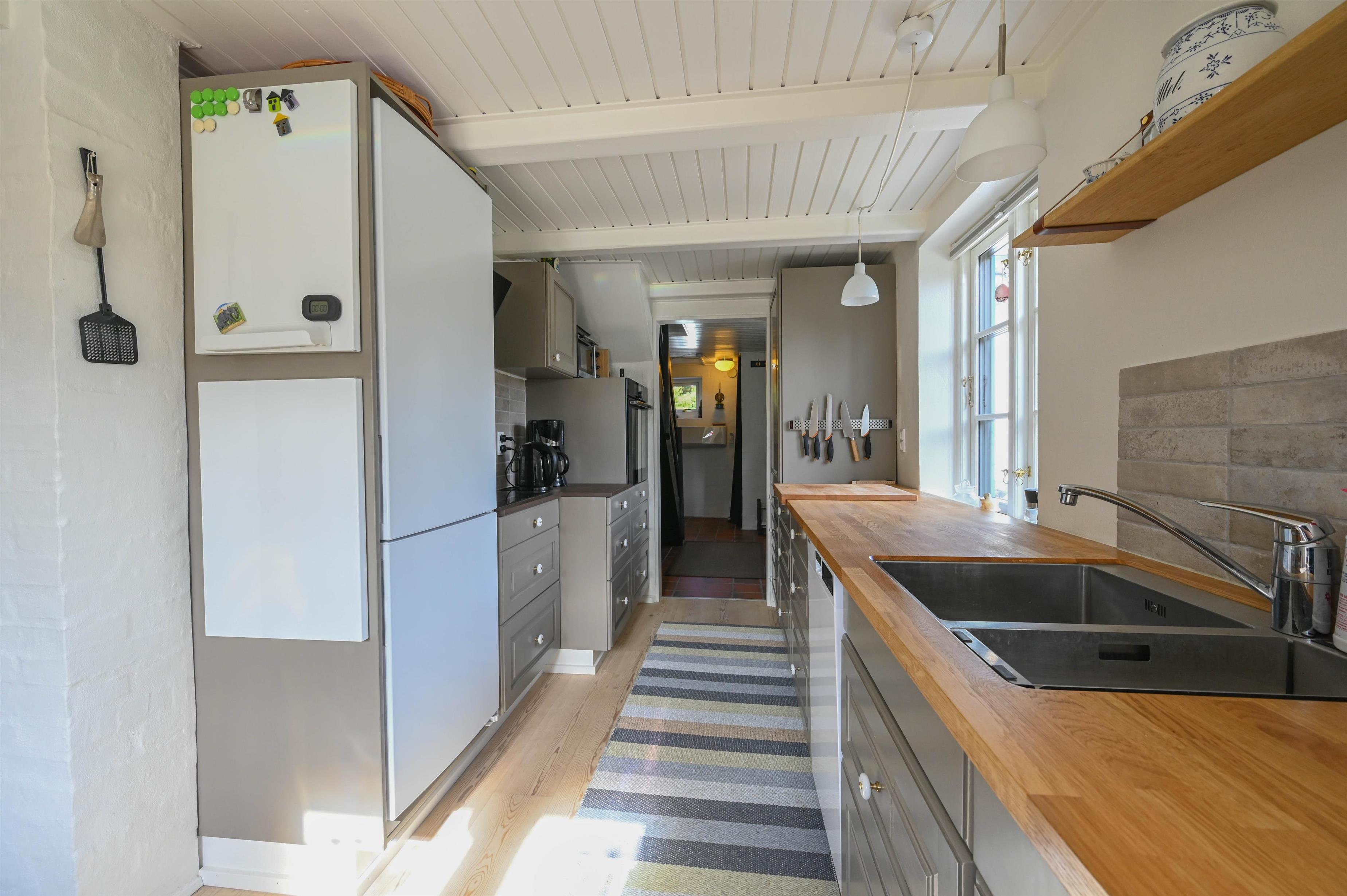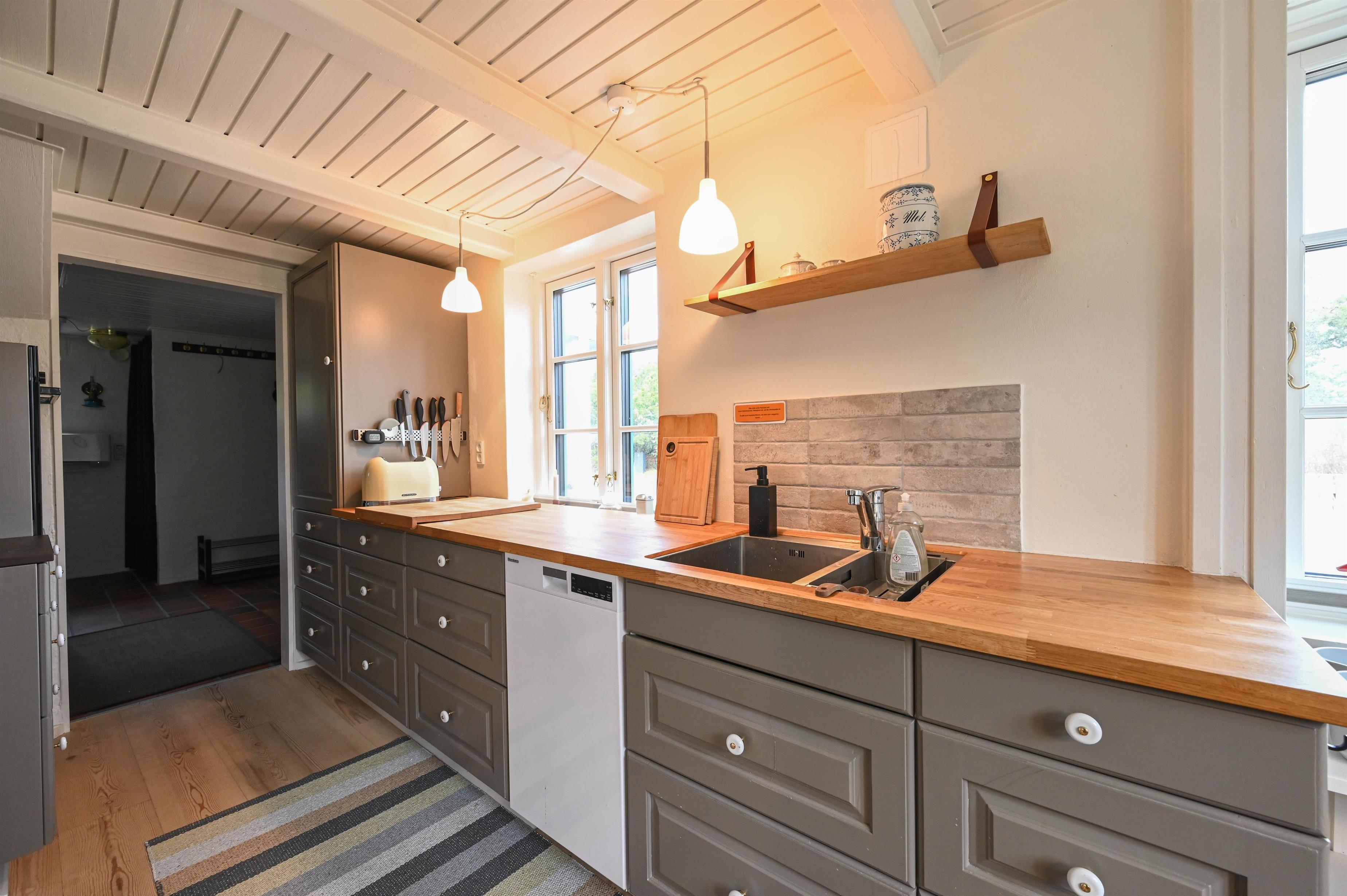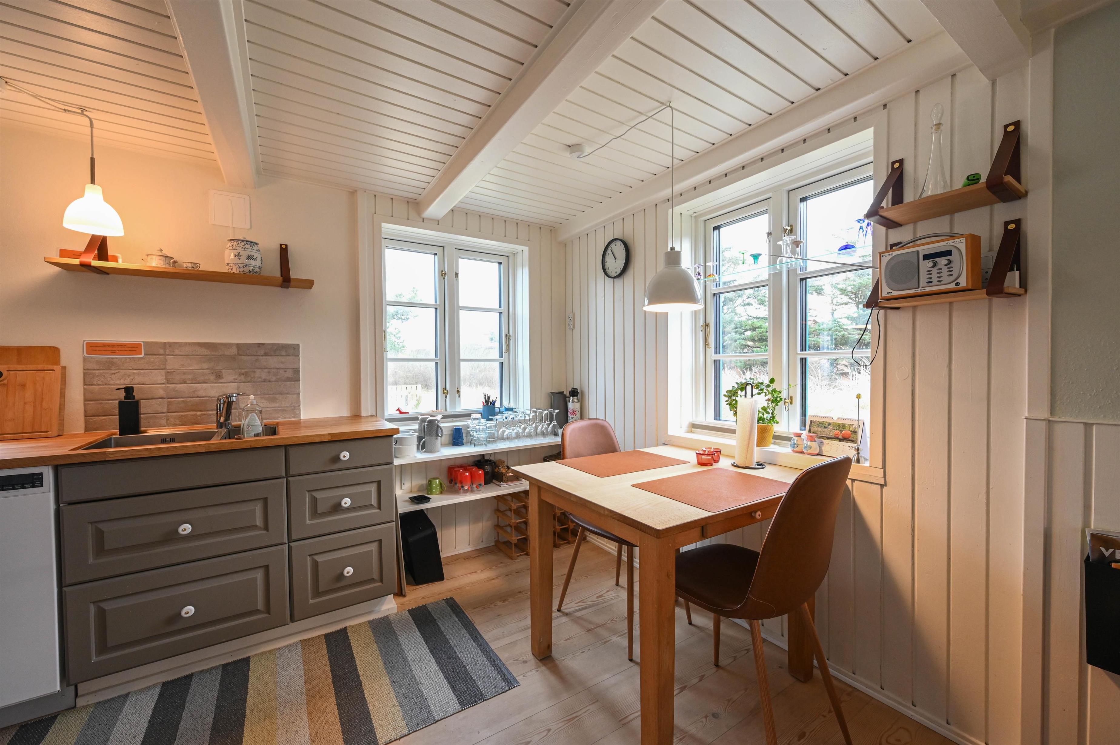 Det hyggelige køkken har spiseplads og ligger i åben forbindelse med den lyse stue, som byder på sofa, lænestole, brændeovn og TV – perfekt til afslapning efter en frisk gåtur ved havet.