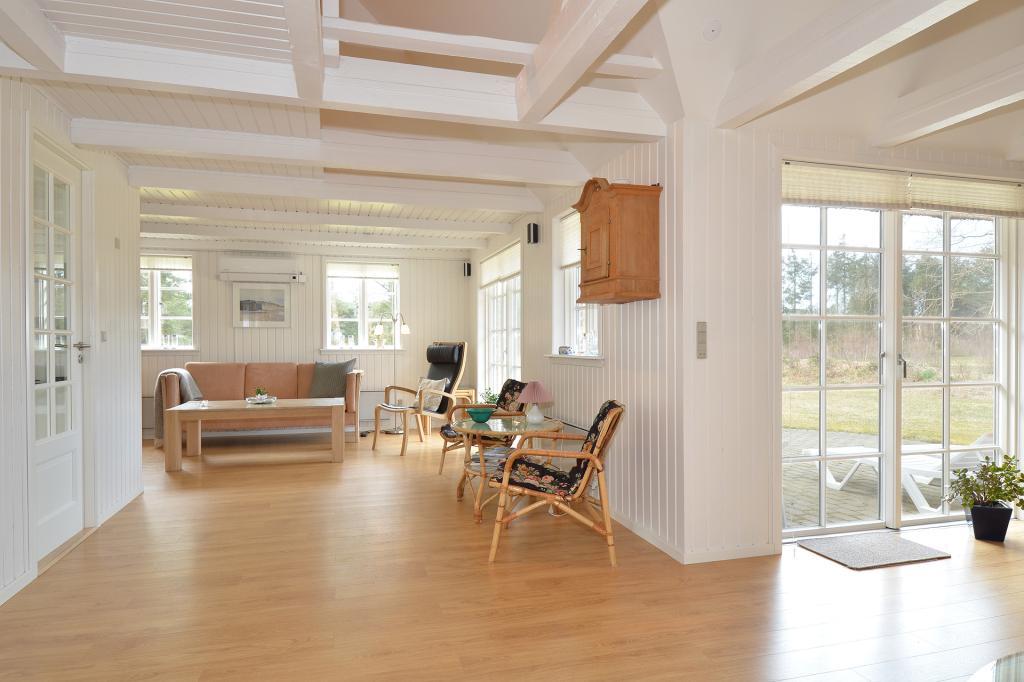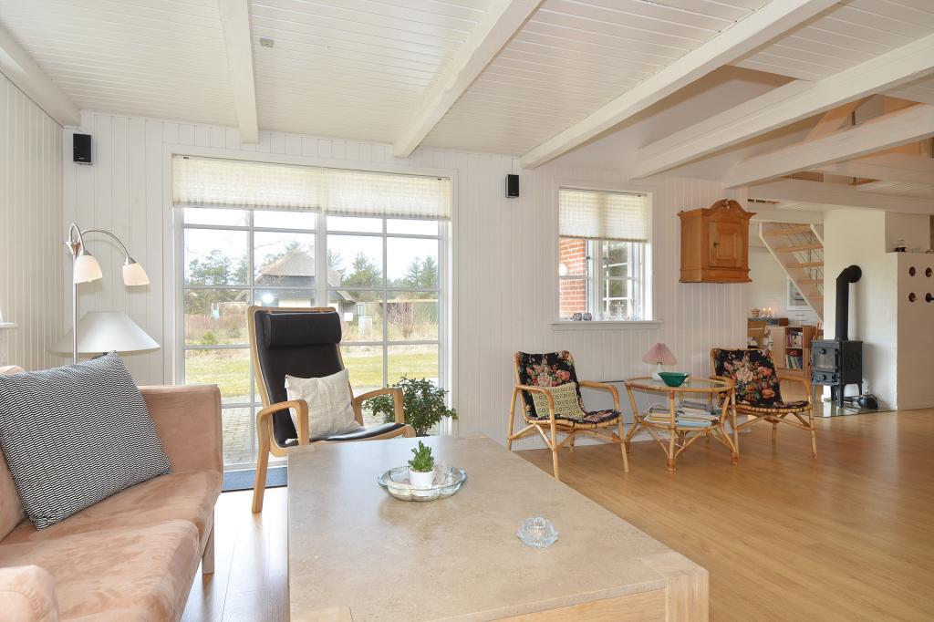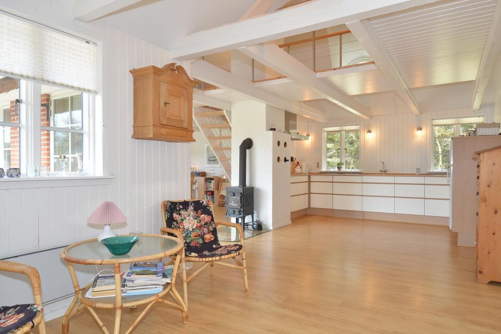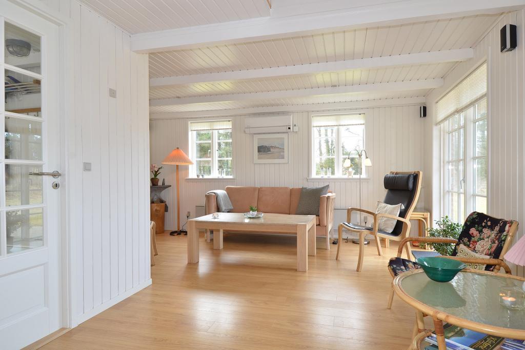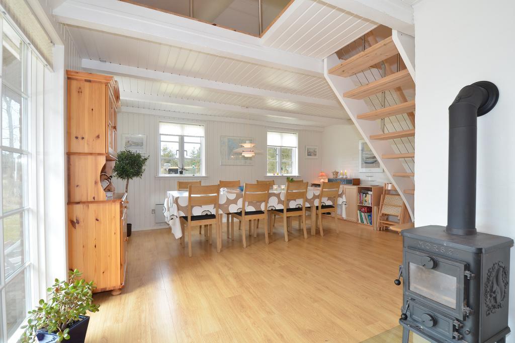 Den rummelige stue byder på komfortable møbler, et flot stort spisebord og en centralt placeret brændeovn, der skaber hygge på kølige aftener. Herfra er der direkte udgang til terrassen, hvor man kan nyde solen eller en stille aften i læ.
