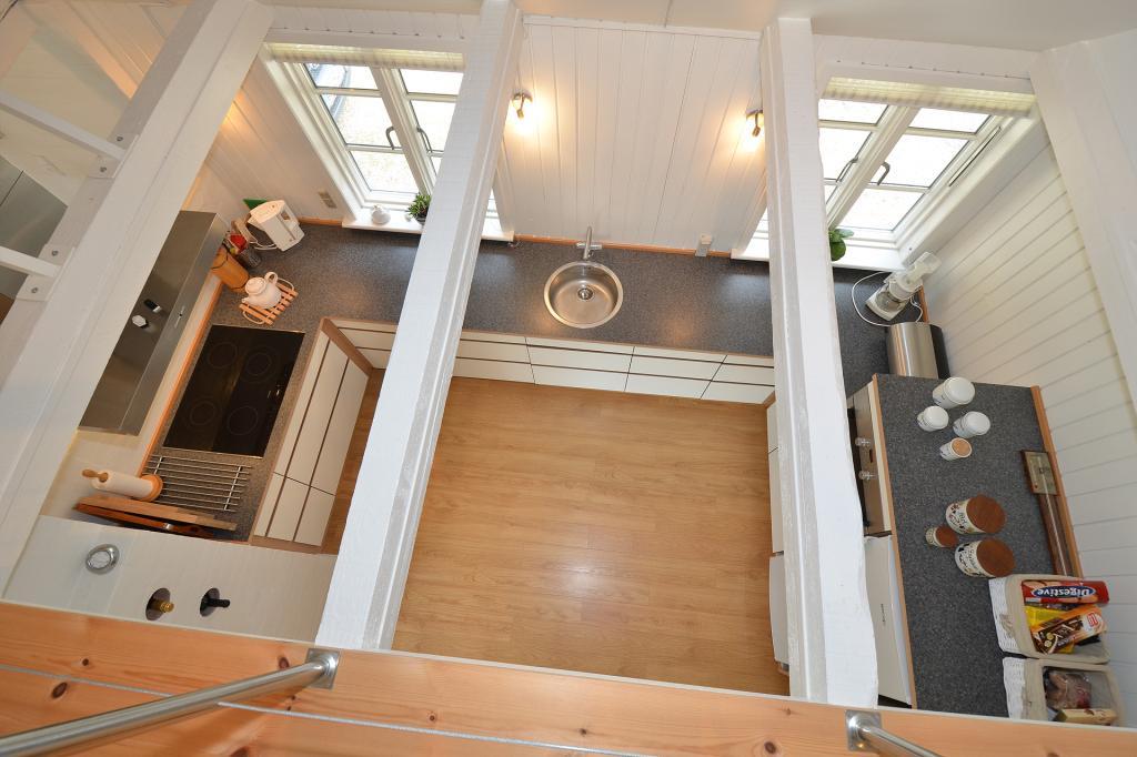 Køkkenet ligger i åben forbindelse med stuen – lyst, moderne og godt udstyret, så madlavningen bliver en del af samværet.
