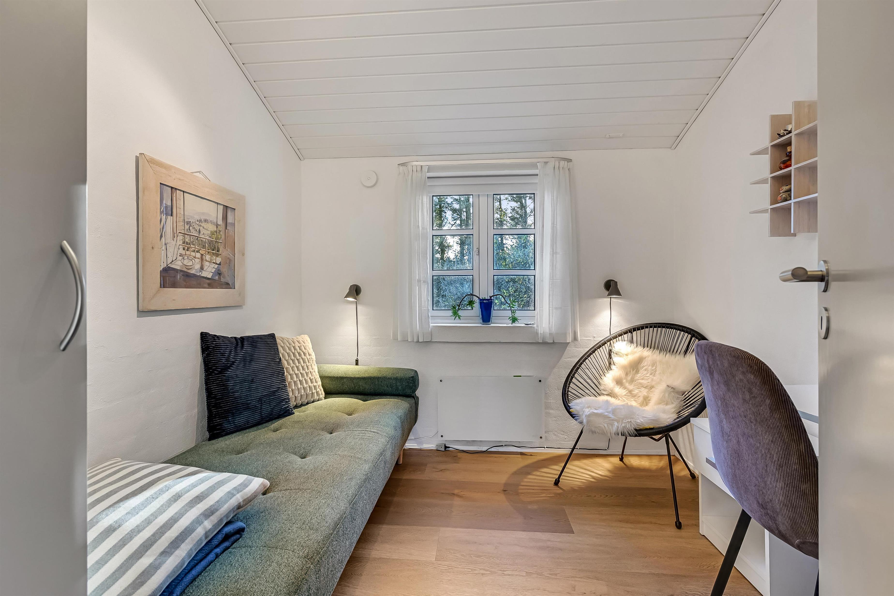 Indretning: Huset byder på en entre med garderobe, hvorfra der er adgang til sauna og et badeværelse med brusekabine, spa og vaskemaskine. Fra entreen er der også adgang til et soveværelse med dobbeltseng og et værelse med 2 enkeltsenge. Fra køkkenet er der adgang til husets sidste værelse med et lille slå-ud-bord og en daybed, der let kan forvandles til en komfortabel enkeltseng. Alle værelser er udstyret med nye senge og har god skabsplads. Husets køkken og stue er i ét og er lyst og hyggeligt indrettet. Stuen har stofmøbler og en væghængt brændeovn, der spreder ekstra hygge og varme. Fra stuen er der direkte udgang til den syd- og vestvendte terrasse, hvor I kan nyde solen. Loftet er nymalet og giver rummet et frisk og lyst udtryk.
