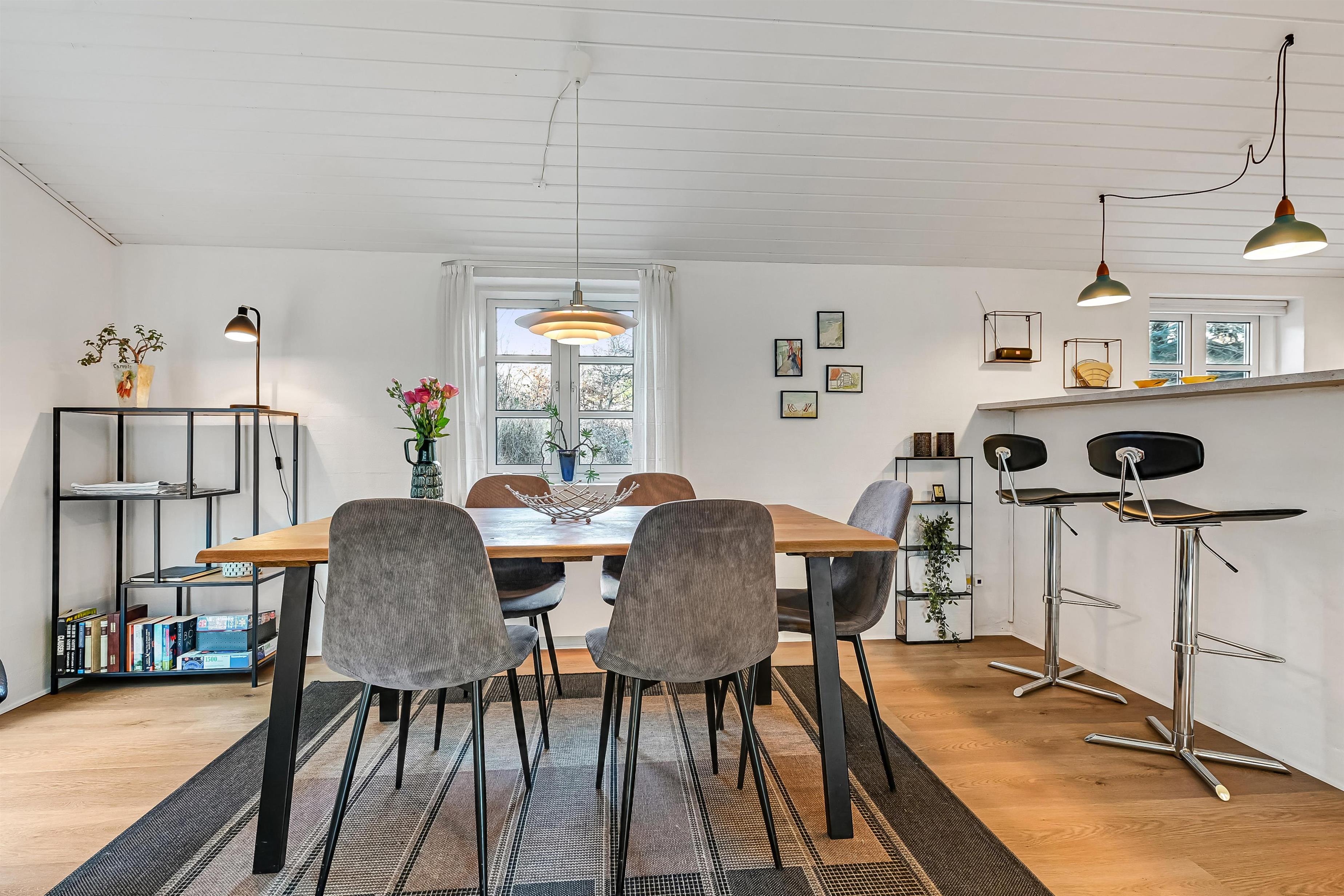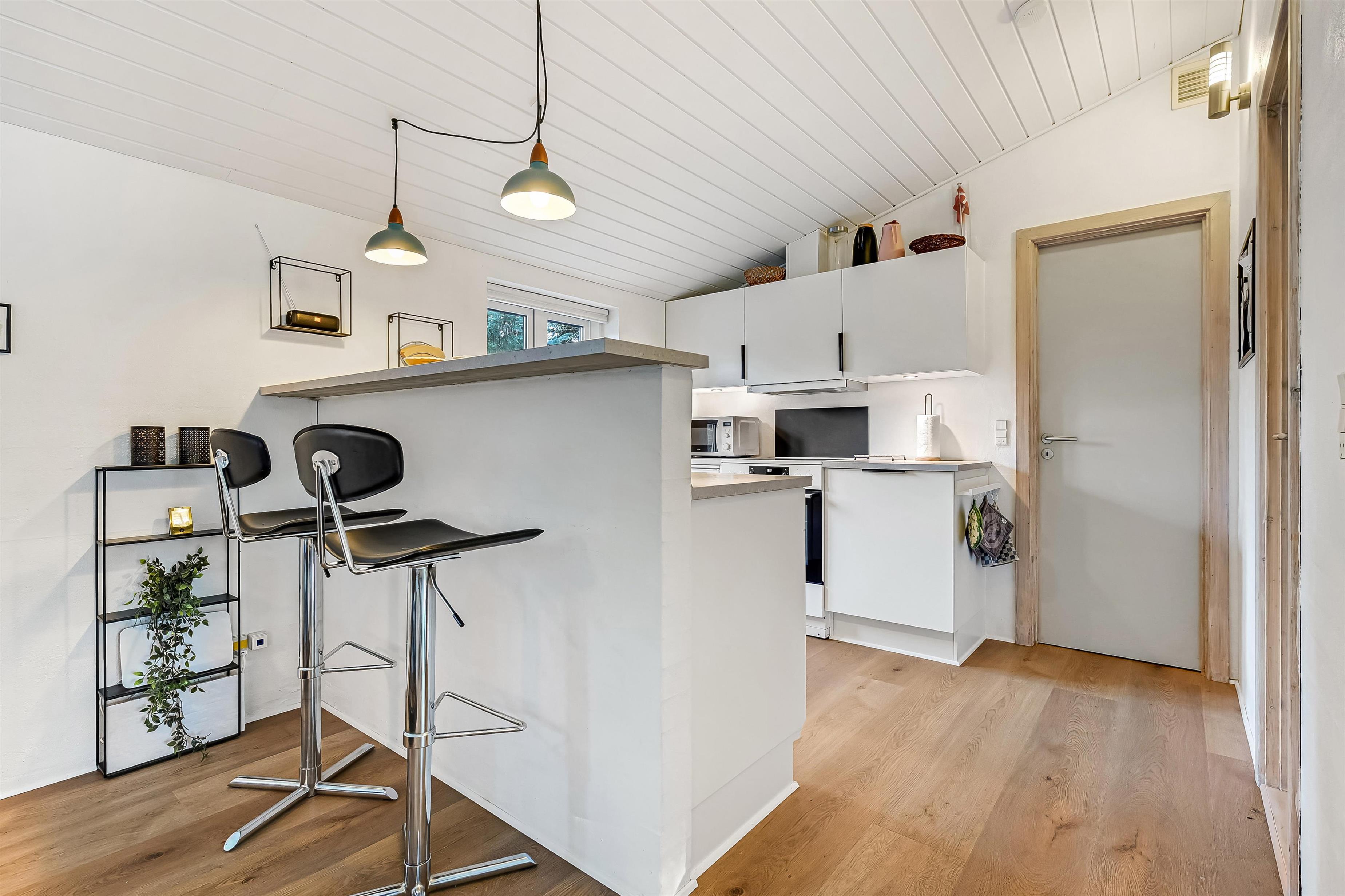 Køkkenet er udstyret med moderne faciliteter og har en barplads, hvor I fx kan nyde morgenkaffen eller et glas vin før aftensmaden. Foran køkkenet er der en hyggelig østvendt terrasse, der er perfekt til at nyde morgensolen – og opleve solnedgangen
