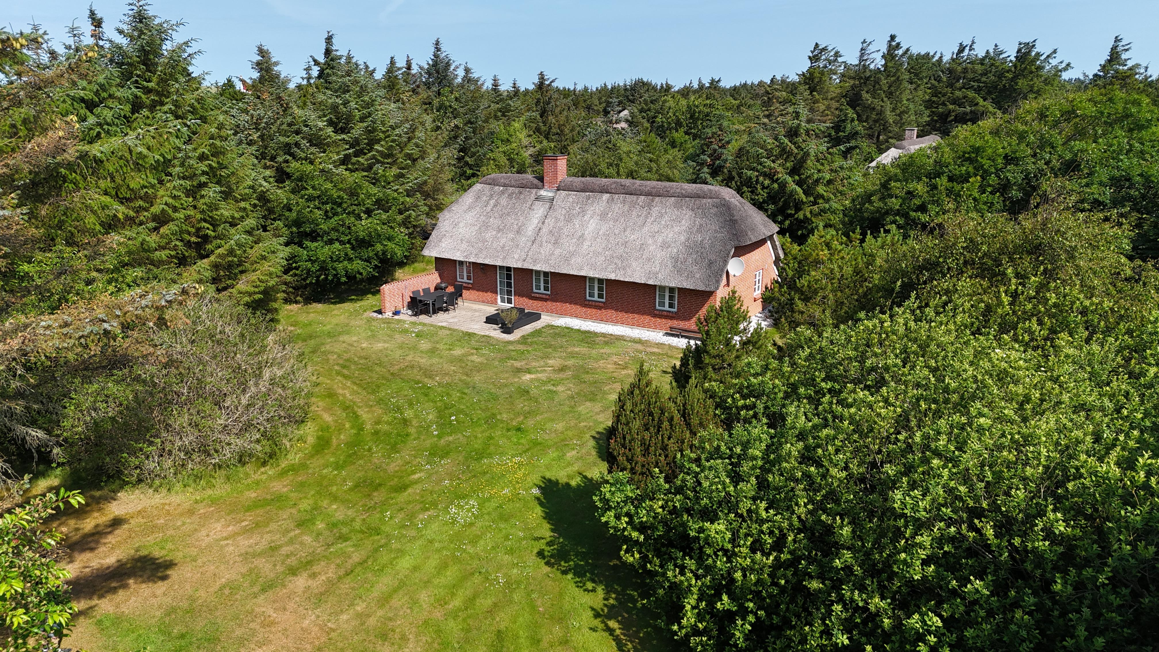 Frisk luft, fuglesang, Vesterhavets brusen og naturens dyr på tæt hold – alt dette kan I opleve ved dette dejlige stråtækte feriehus, der ligger tæt på Vesterhavet.