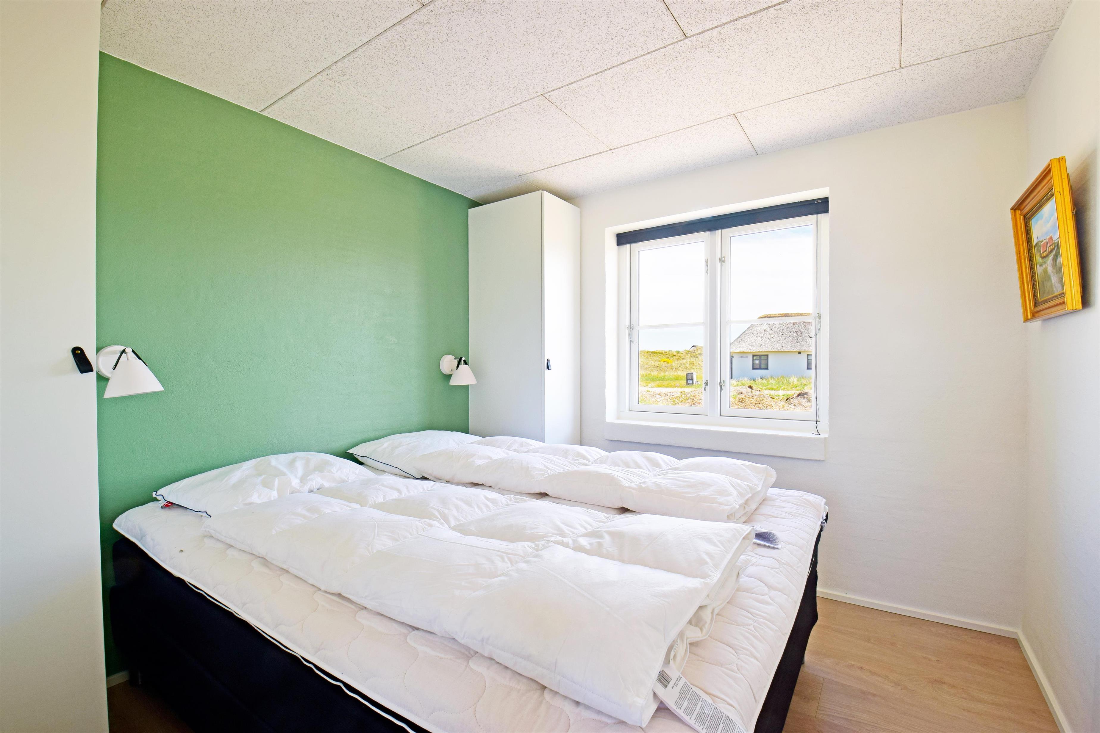 Soveværelse (2) mod øst er med dobbeltseng (160 cm bred) og direkte adgang til badeværelse med stor bruseniche. Første salen er indrettet med et soveværelse (3) med to enkelmandssenge (90 cm bred) med mulighed for at ligges sammen. Her er der flot udsigt over klitterne med de oprindelige små feriehus mod nord. På 1. sal er der desuden en lille repos, der giver mulighed for en hyggelig læse/legekrog med udsigt direkte mod vest.