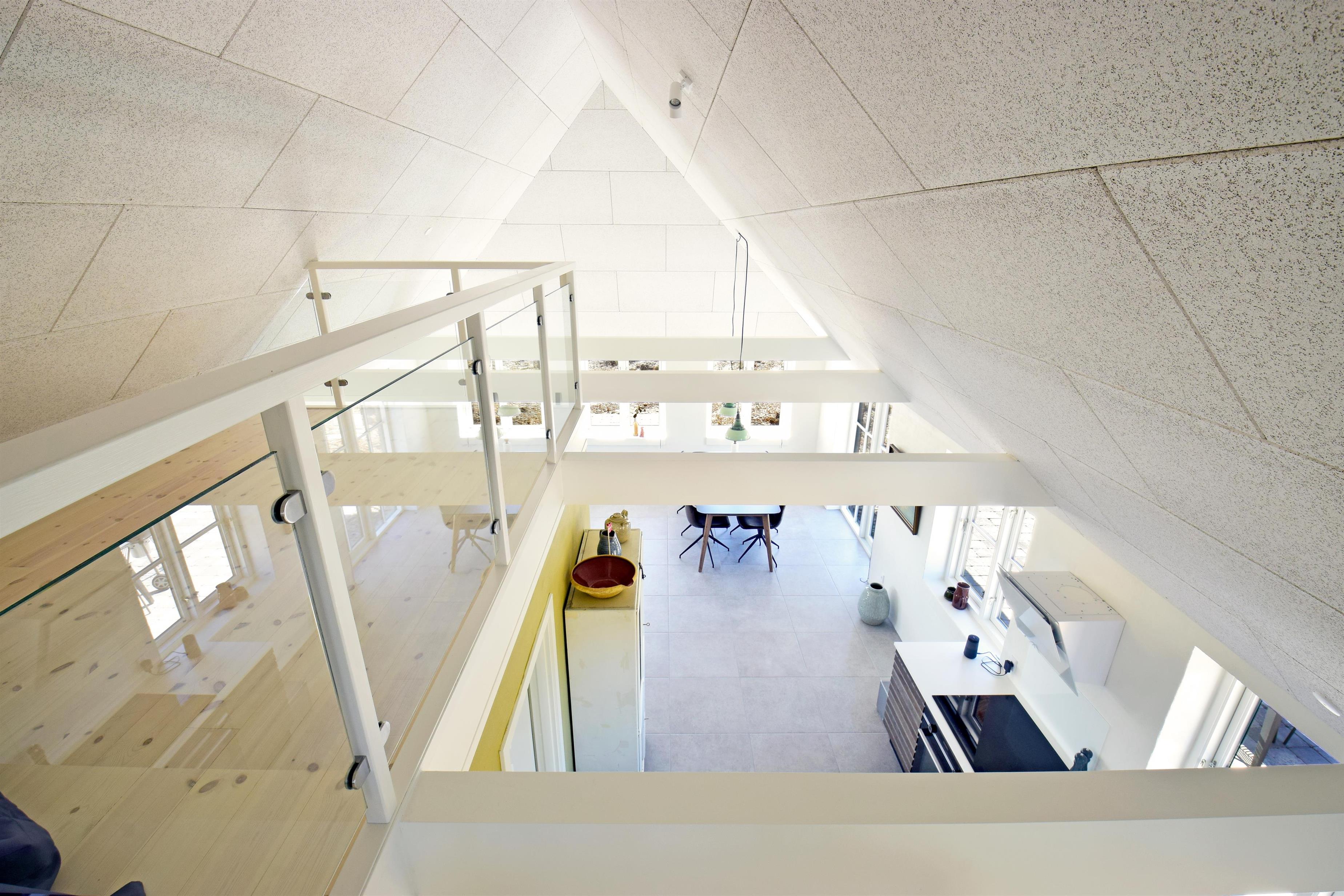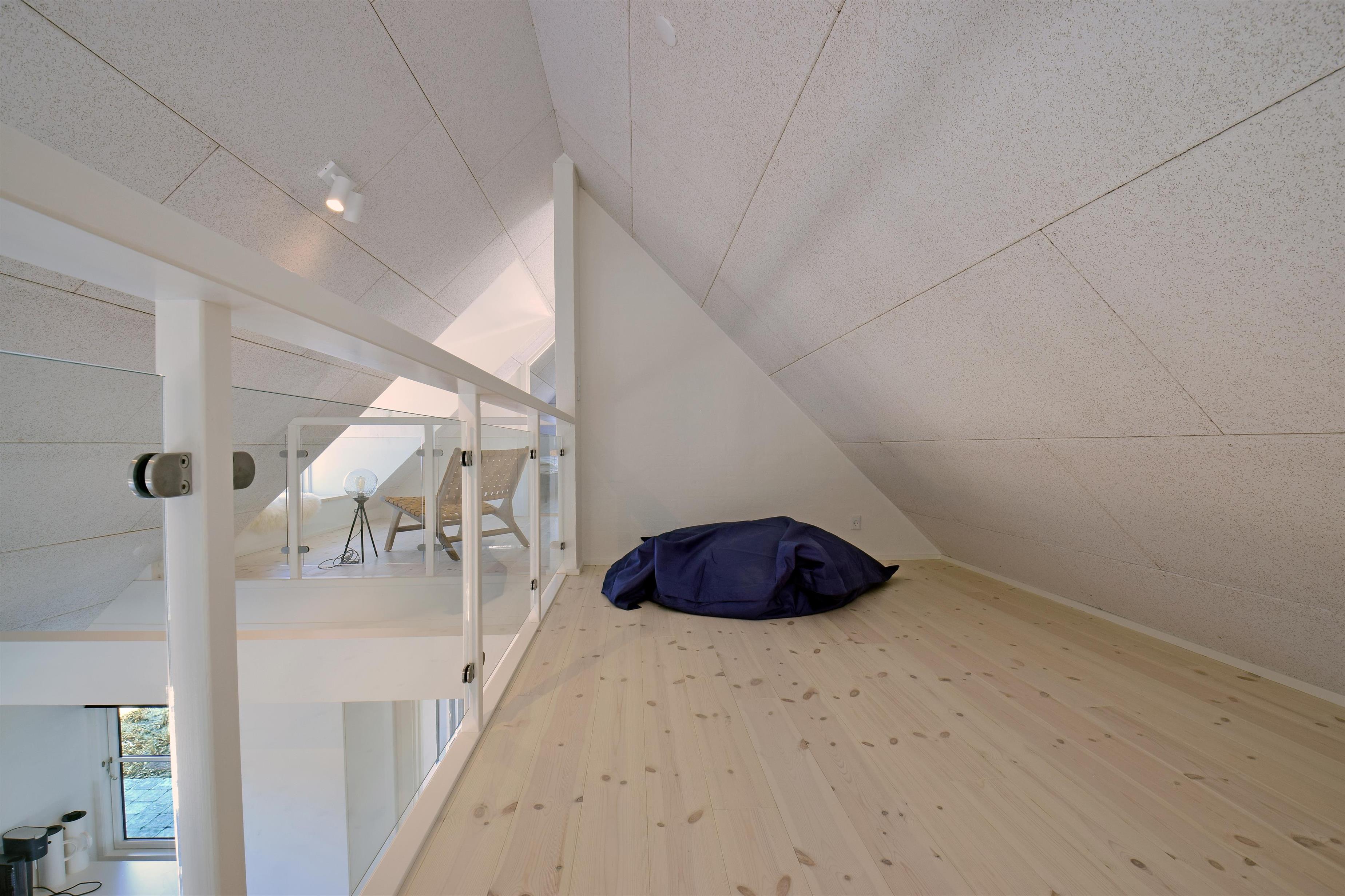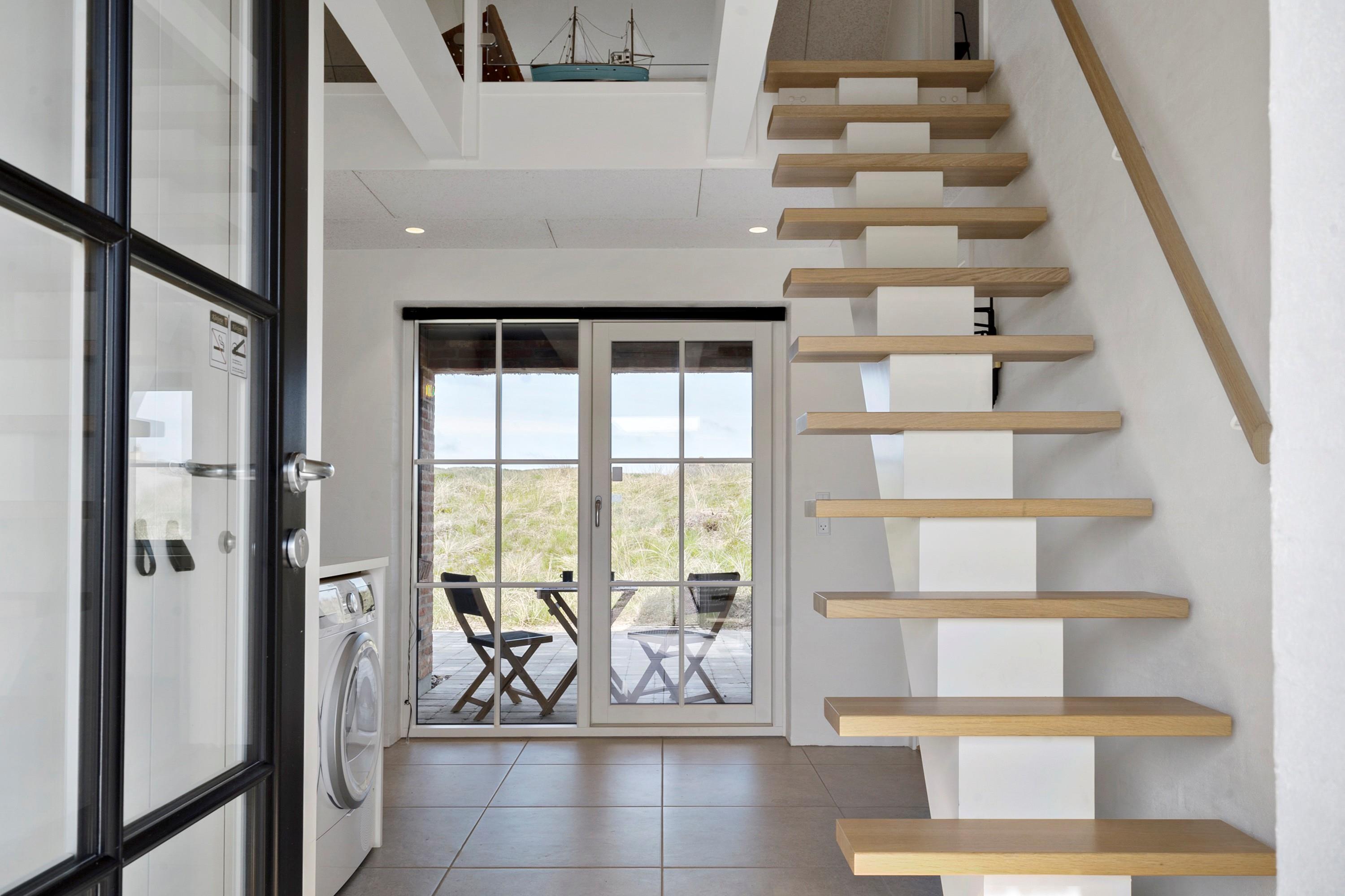 Indretning: Stor lys entre med trappe til 1. sal samt vaskemaskine og tørretumbler. I stueplan der et stort badeværelse med dobbelt bruseniche, sauna samt badekar med udsigt til klitterne. Stort soveværelset (1) med dobbeltseng (180 cm bred), hvor vinduer åbner op for syd, vest og nord så det næsten giver en 180 grader udsigt til klitterne. Derudover rummer værelset et skrivebord med skærm; her kan du sidde med udsigt til Sømærket. Køkkenet er af høj kvalitet og veludstyret, og i åben forbindelse med stuen. Mod vest mellem det store soveværelse og køkkenet er en lille overdækket terrasse, der giver mulighed for at sidde ud i ly for blæst og regn. Husets stue er lys med mange vinduer mod øst, syd og vest så udsigten til de naturskabte klitter og det ikoniske sømærke kan nydes både fra spiseplads og sofa.