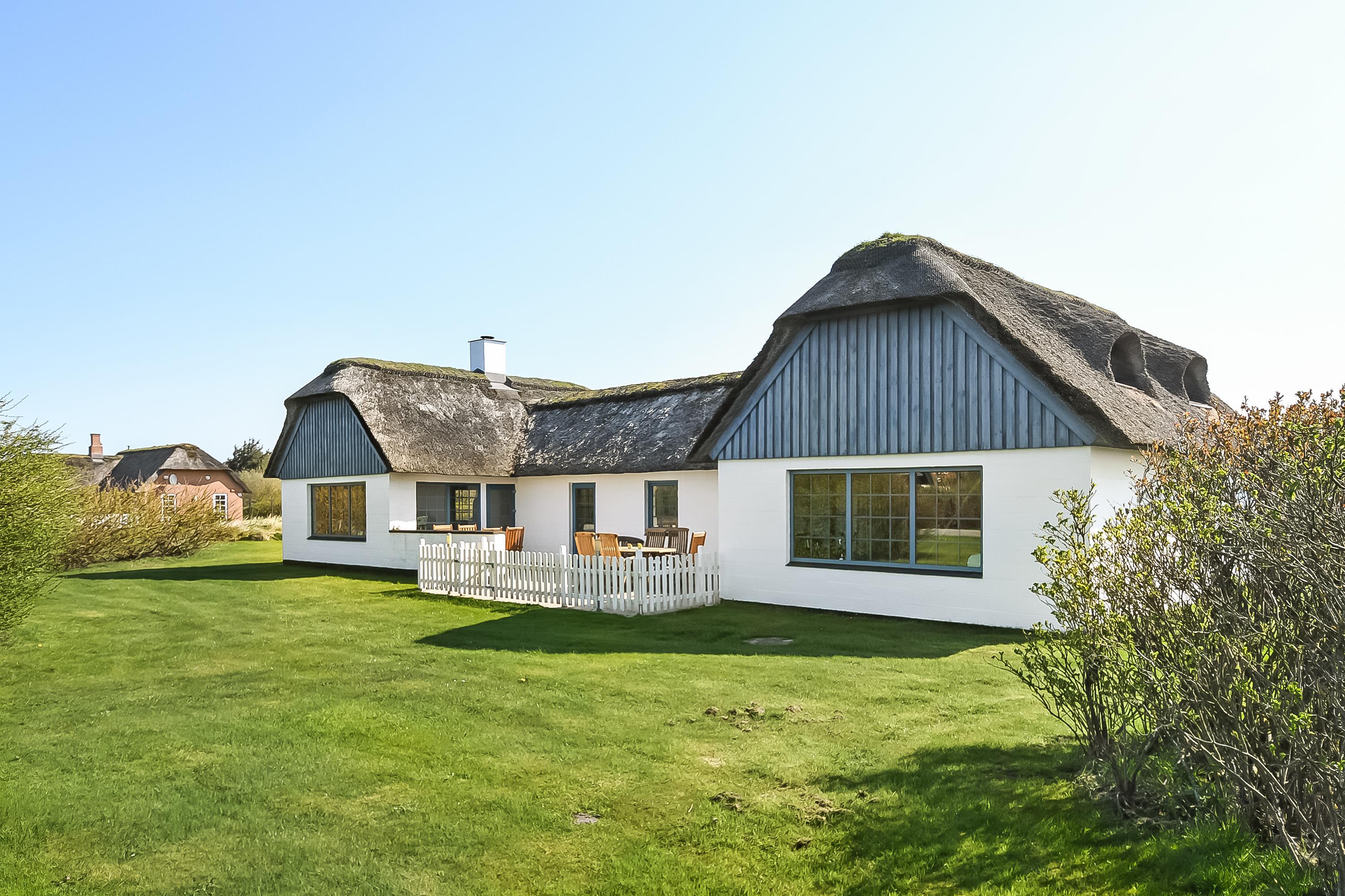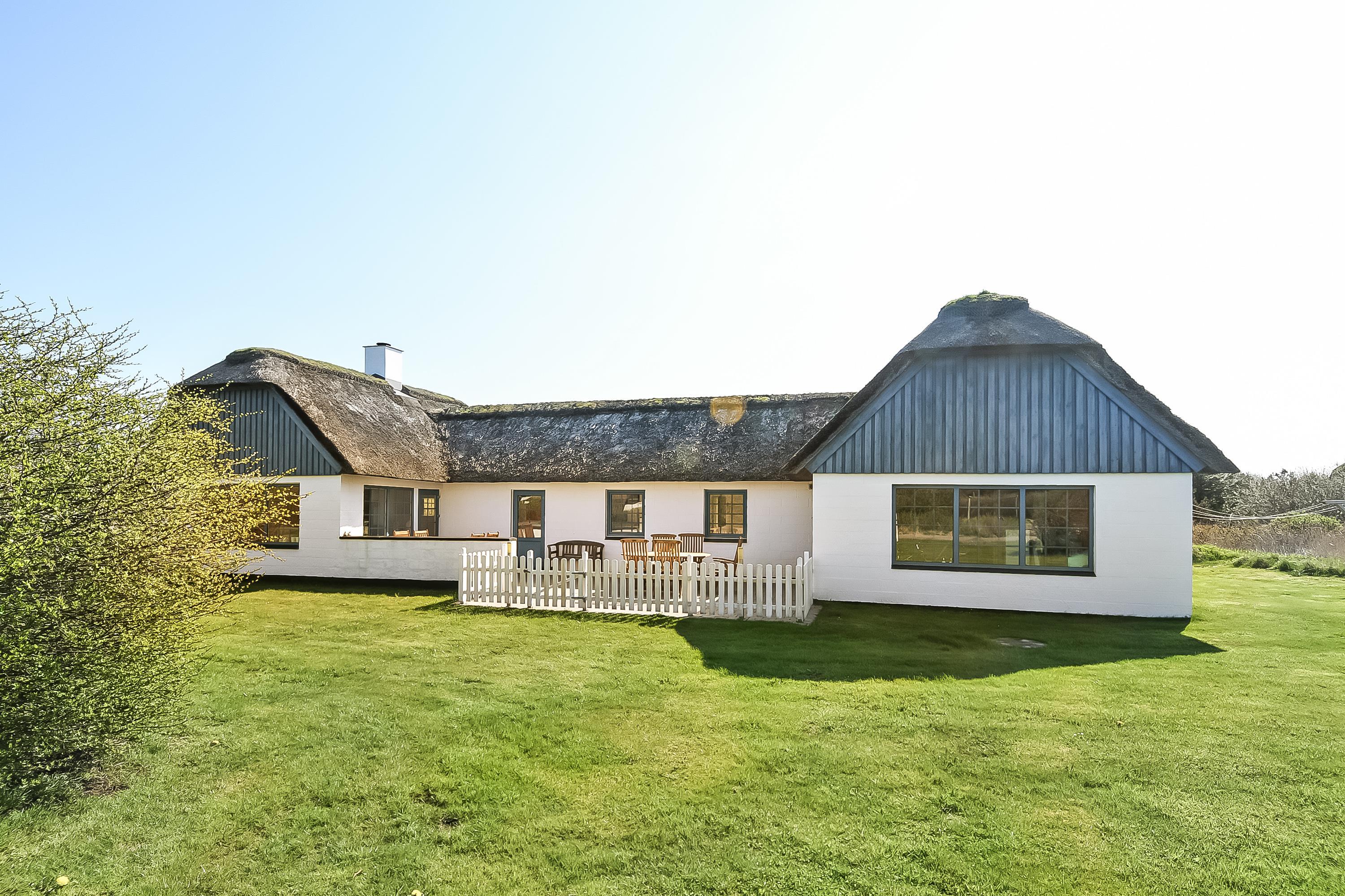 Rummeligt feriehus på flot plejet grund, omgivet af flere gode og delvist lukkede terrasser.