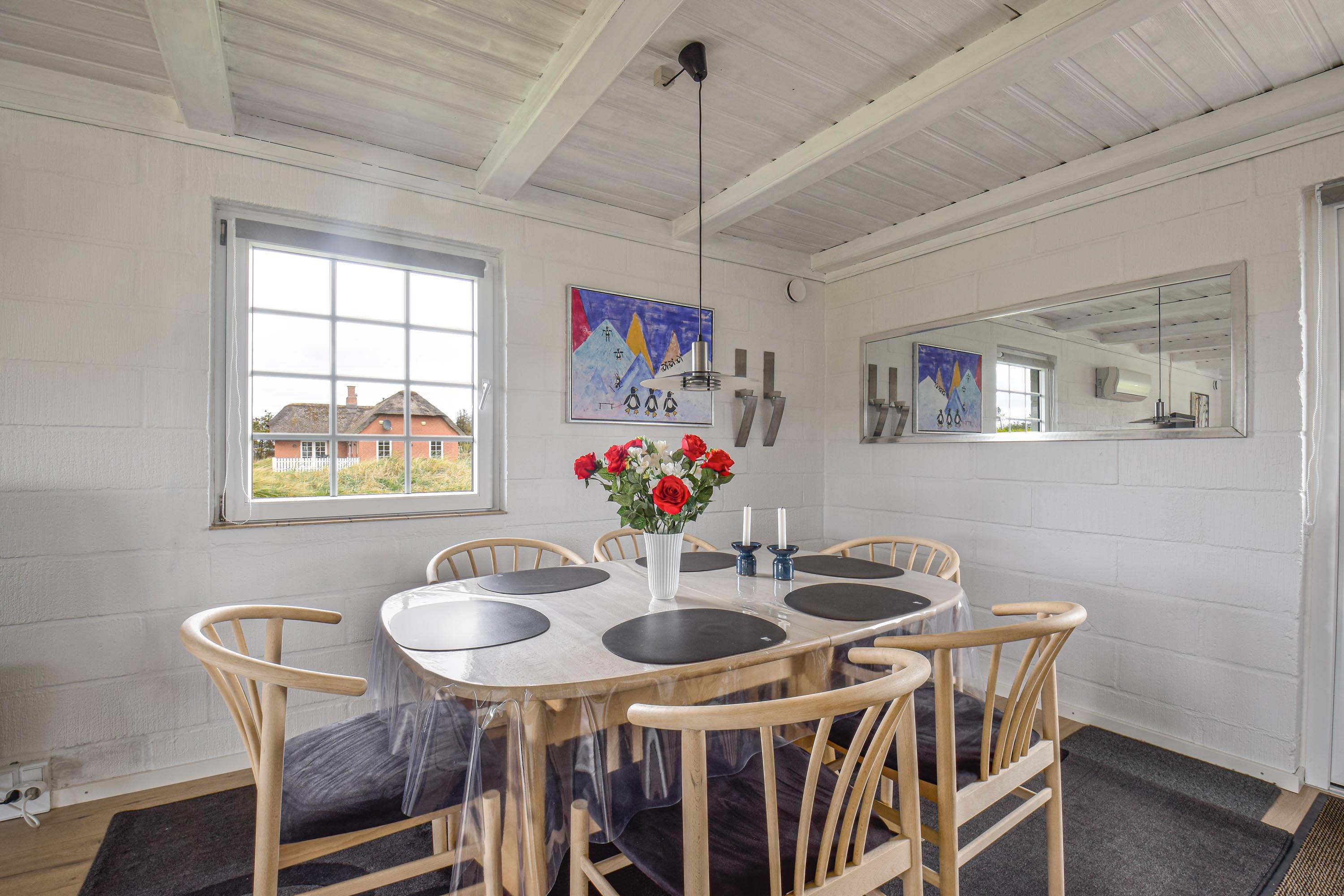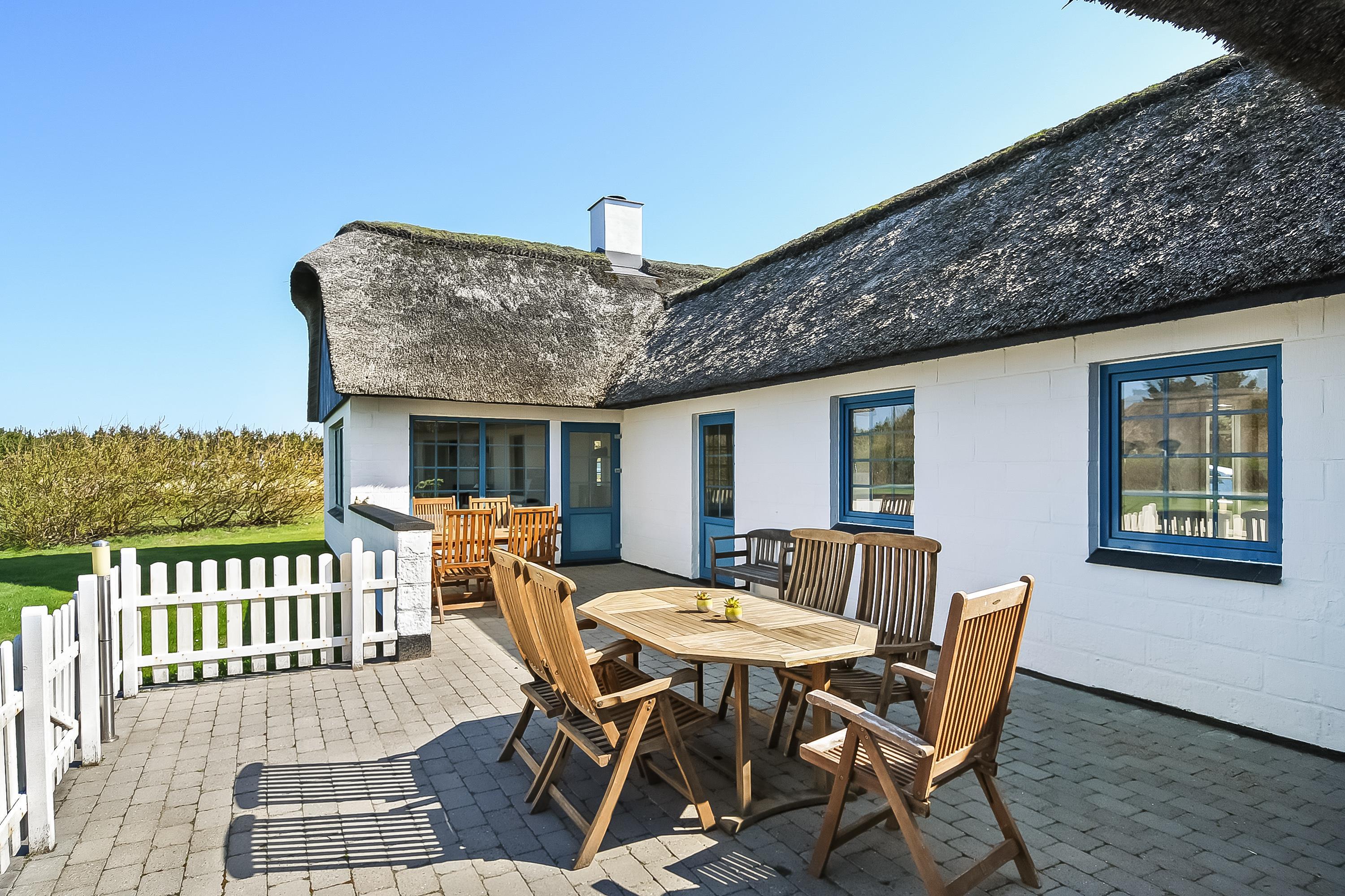 Indretning: Nyt køkken med spiseplads og i åben forbindelse med stuen, hvor der er brændeovn, sofagruppe og fjernsyn. Flot nyt badeværelse med bruser, vaskemaskine og tørretumbler, værelse med 2 enkeltsenge, værelse med dobbeltseng samt stort soveværelse med dobbeltseng. Fra stuen er der udgang til en dejlig vestvendt terrasse, og mod øst er der endnu en delvis lukket terrasse, hvor morgenmaden kan nydes til fuglesang og med havets brusen i baggrunden. 70 ltr. fryser.