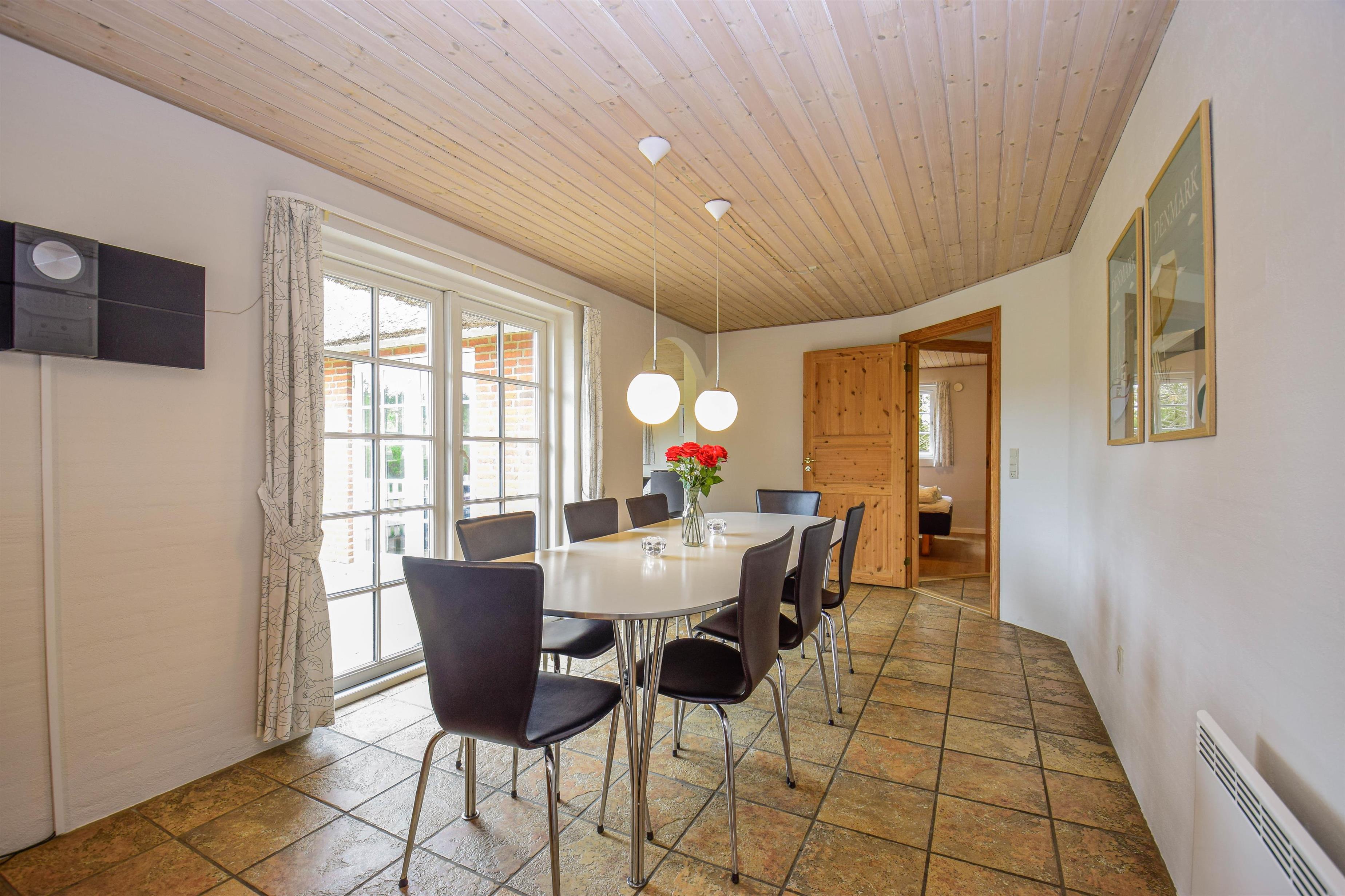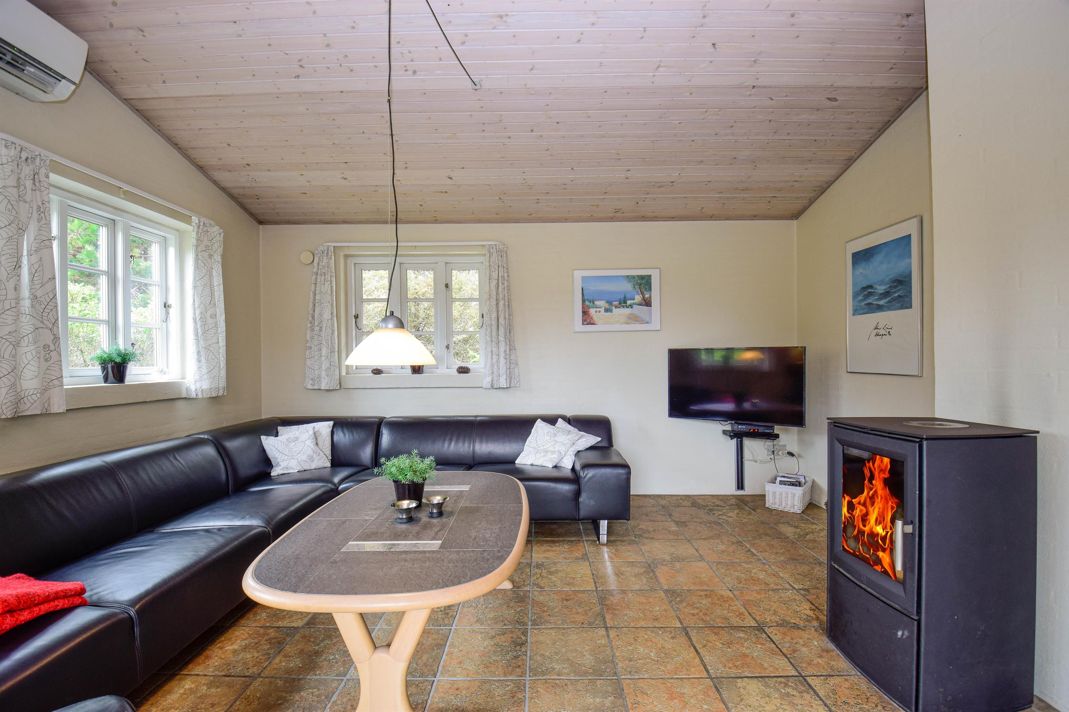 - Hyggelig og smagfuldt møbleret stue med brændeovn, der skaber varme og stemning på kølige aftener.